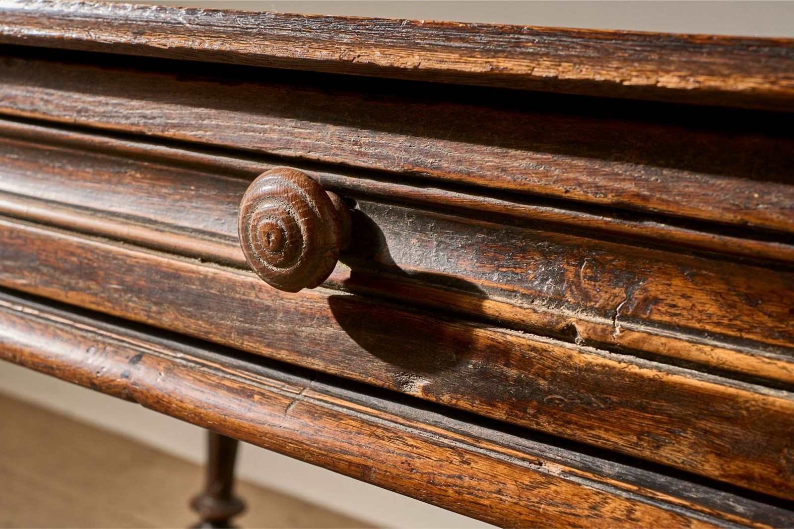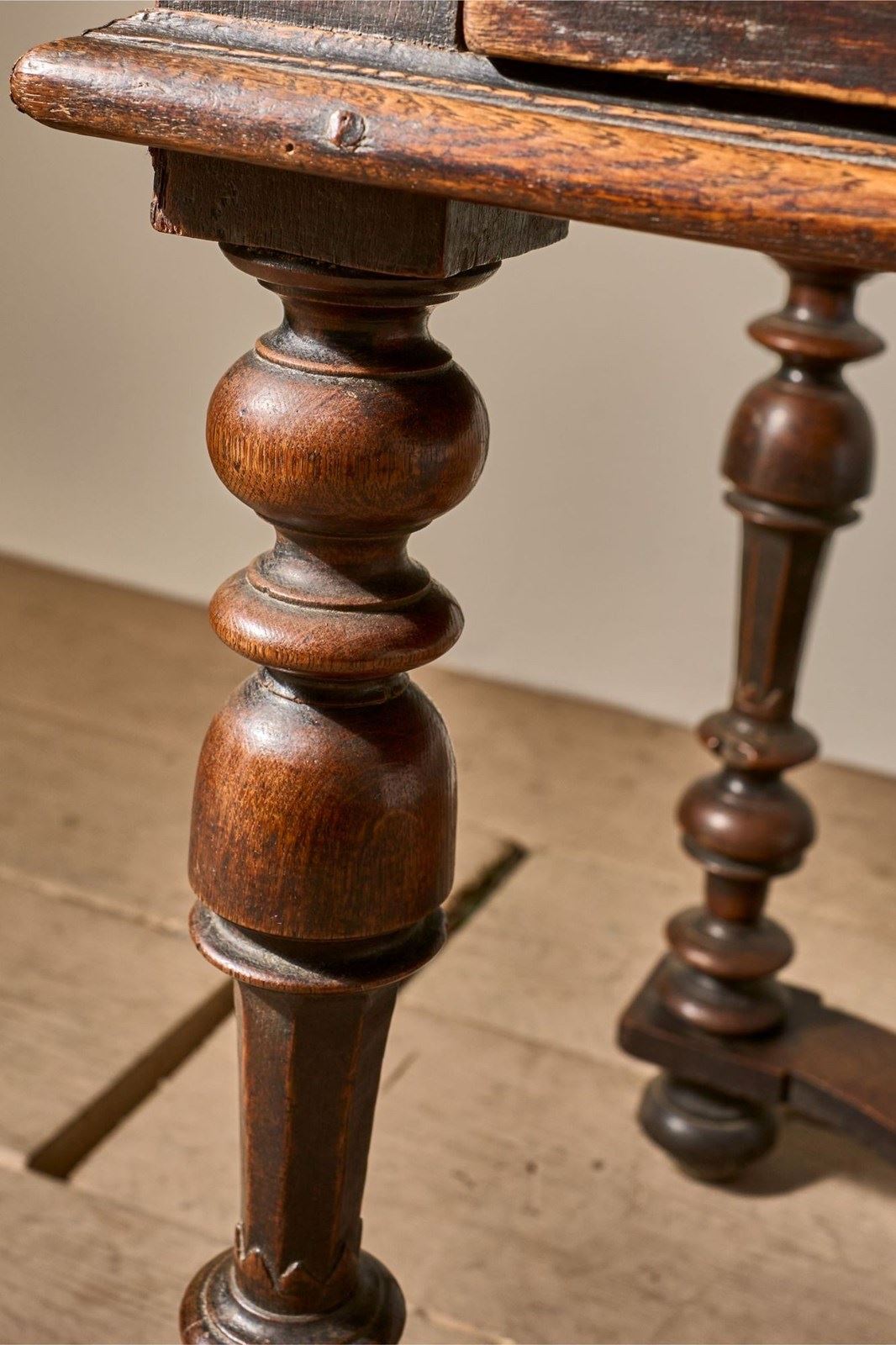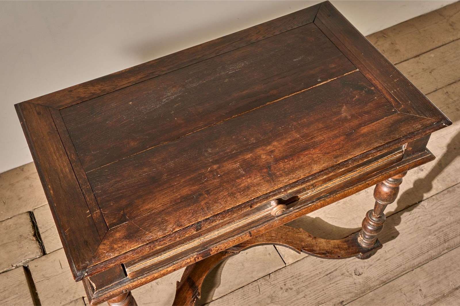 This is a lovely designed 19th century French oak side table. The legs and lower stretchers have a great amount of detail, making this table hugely decorative. The table is complete with a thick oak drawer that runs smoothly and is lined with hessian. The patina and colour are wonderful. Overall condition is good with no structural issues but there is a split in the top. All part of its character but we can let in a timber piece to this should you prefer.
