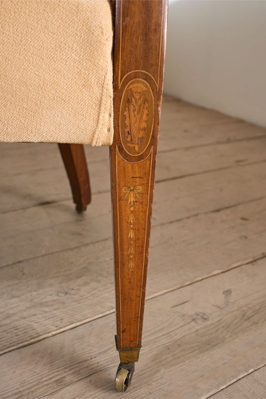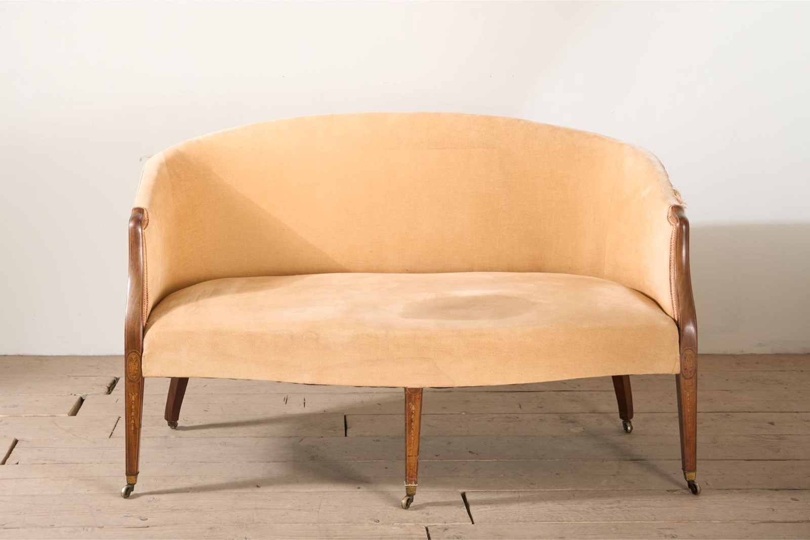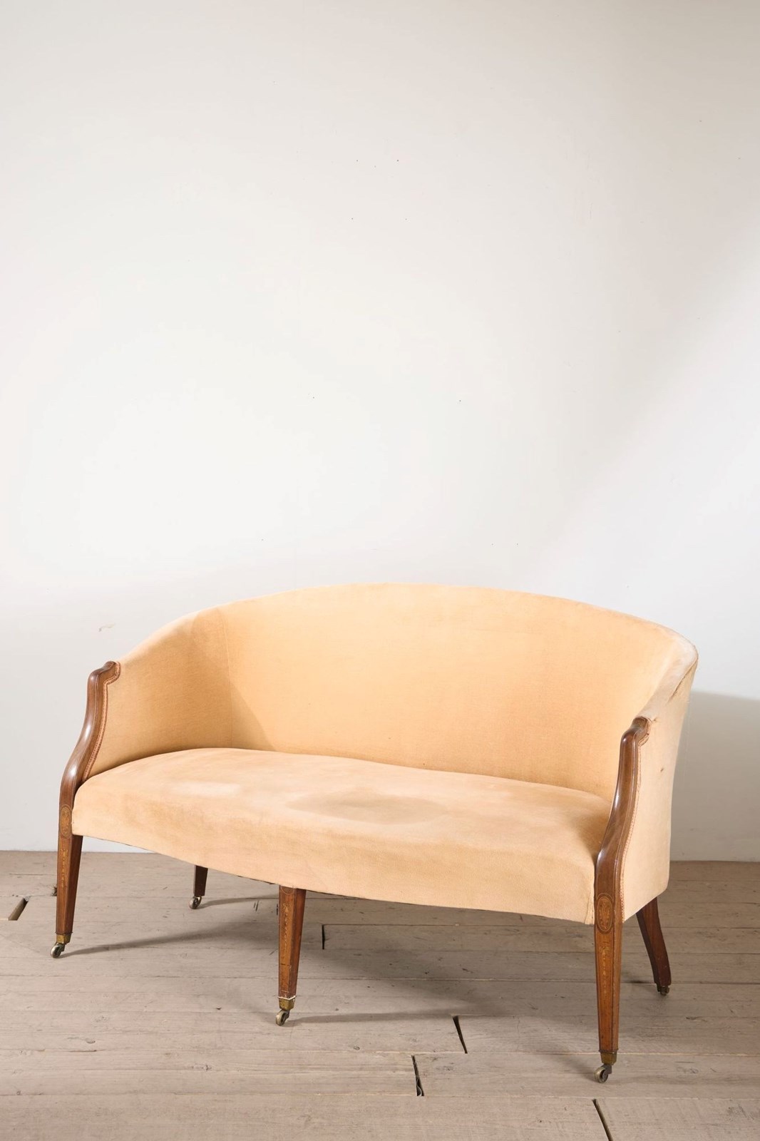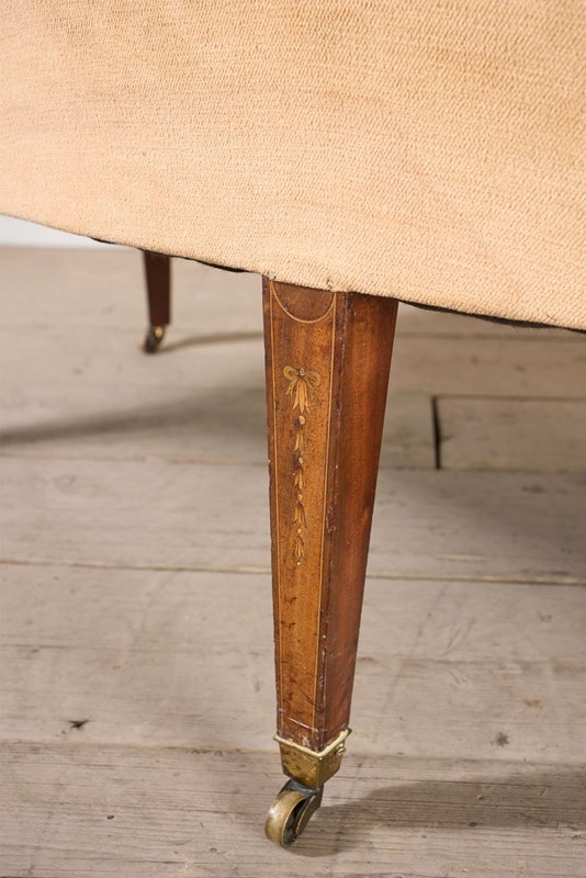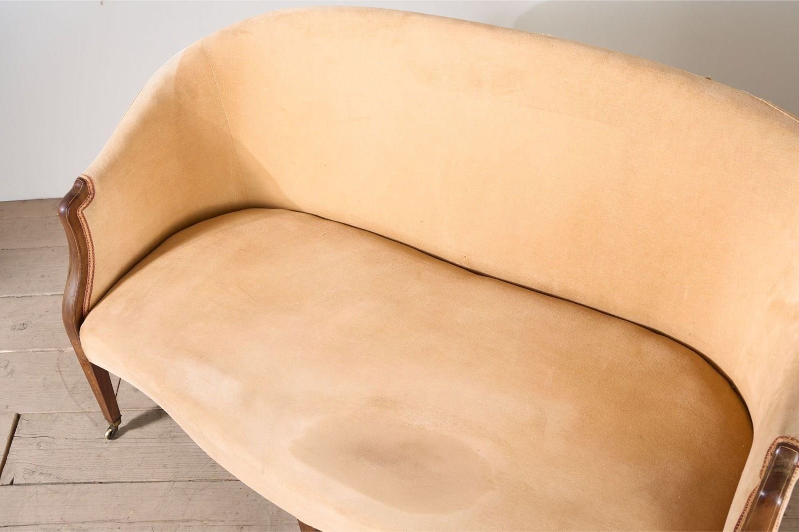 This is a very elegant 19th century high quality Hepplewhite / Sheraton style curved back sofa. The proportions are neat yet still practical with a comfy deep seat. The frame is mahogany and inlaid with fine marquetry details. All legs complete with original casters. Wonderful quality as well.