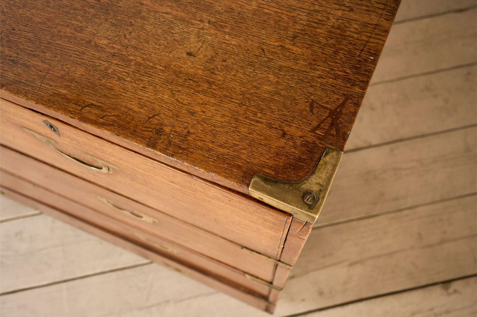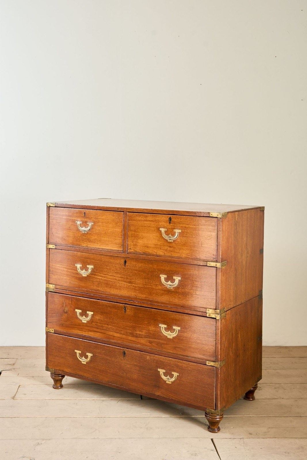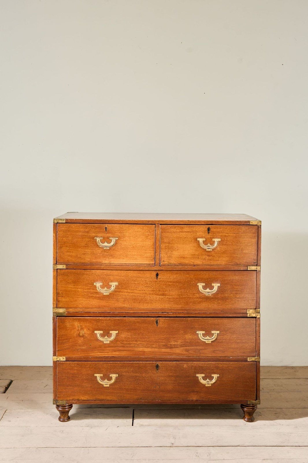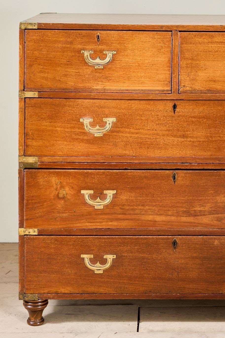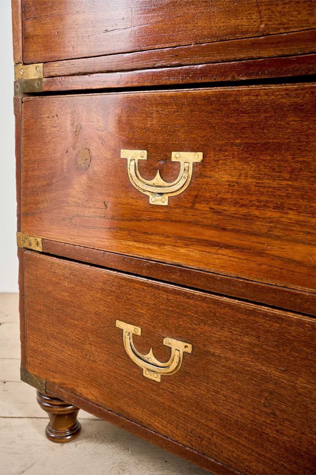 This is a particularly nice set of 19th century Anglo-Indian campaign drawers. This set is made from solid teak which has taken on a beautiful patina over the years and has the nicest handle design I have seen on this style of drawers. The handles also sit flush in the body of the drawers making for a very tidy design. The chest as per its nature splits in two as originally this would have been moved from location to location on the back of a mule or other animal. This set is made up of entirely drawers making it very practical and offering plenty of storage.