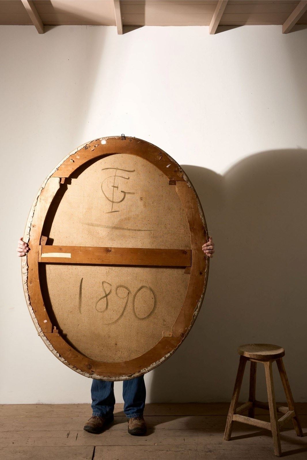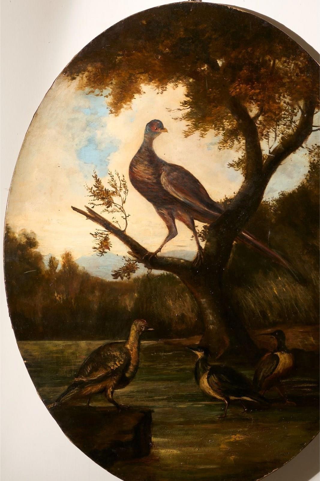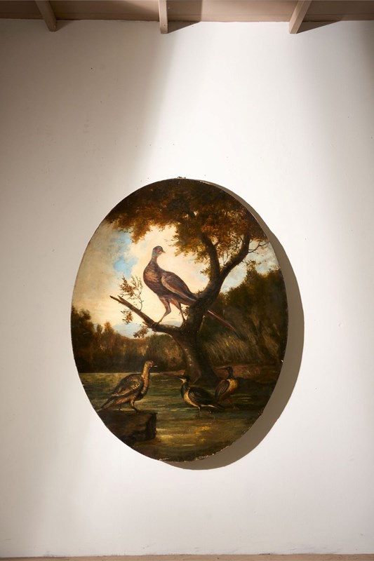 19Th Century Very Large Oval Oil On Canvas Painting Of Birds
