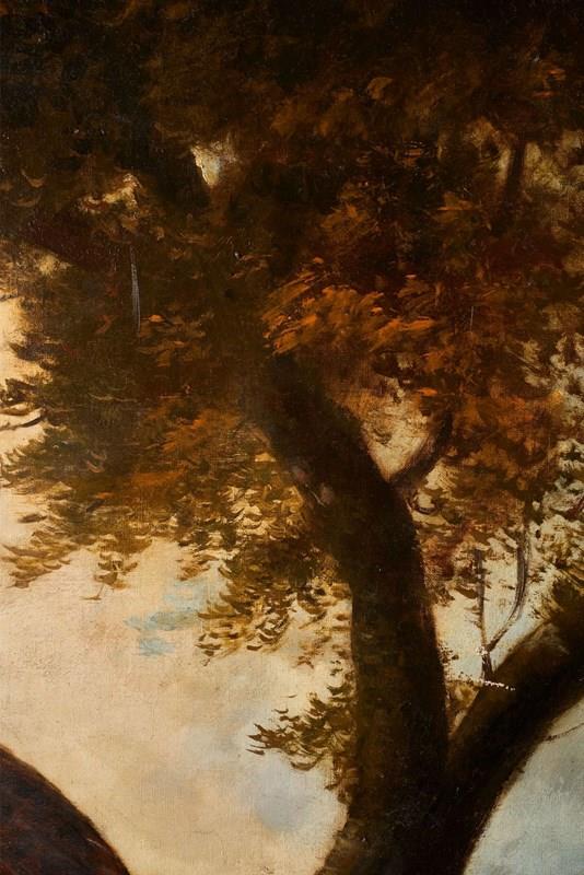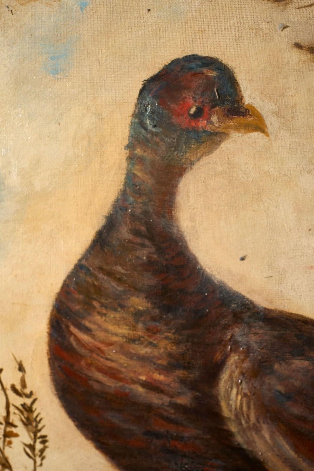 This is a extremely well painted, 19th century Italian oil on canvas painting of birds. The main feature is a Pheasant in the tree set amongst a traditional landscape. There are further birds in the foreground all executed well. The colours are rich and the condition overall is very good with only a few light marks to the paint. The piece is signed and dated on the back. 1890 and came from Milan.