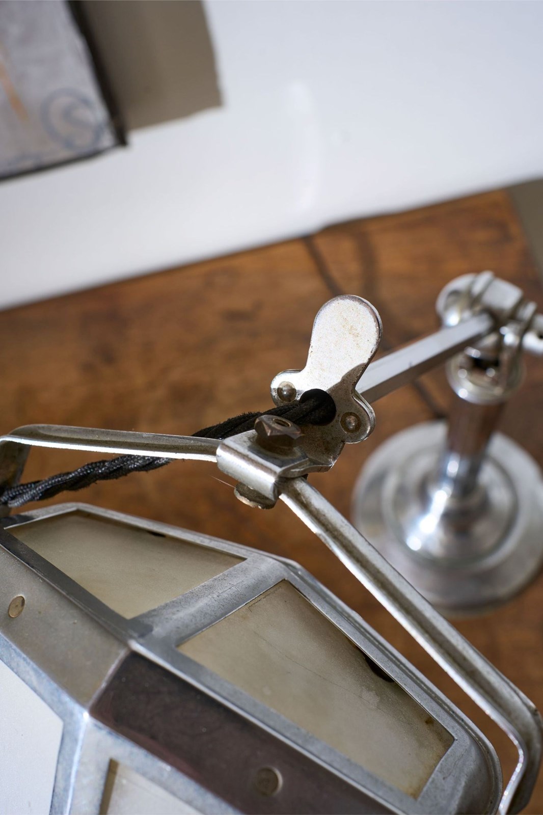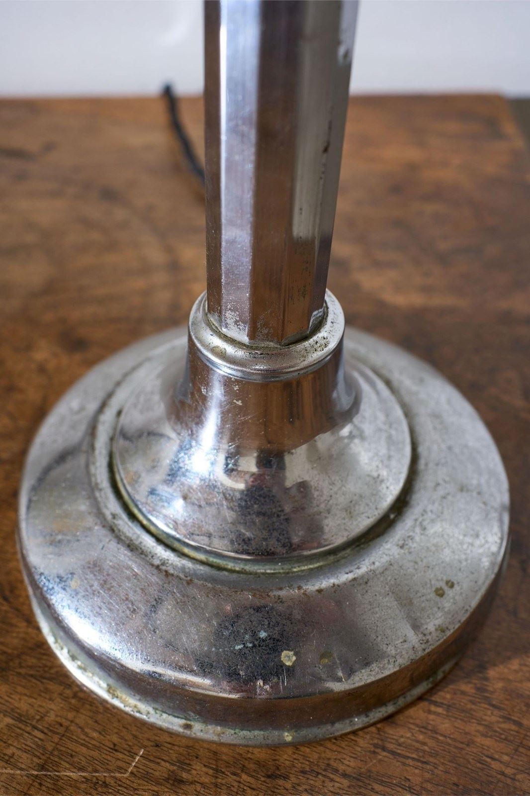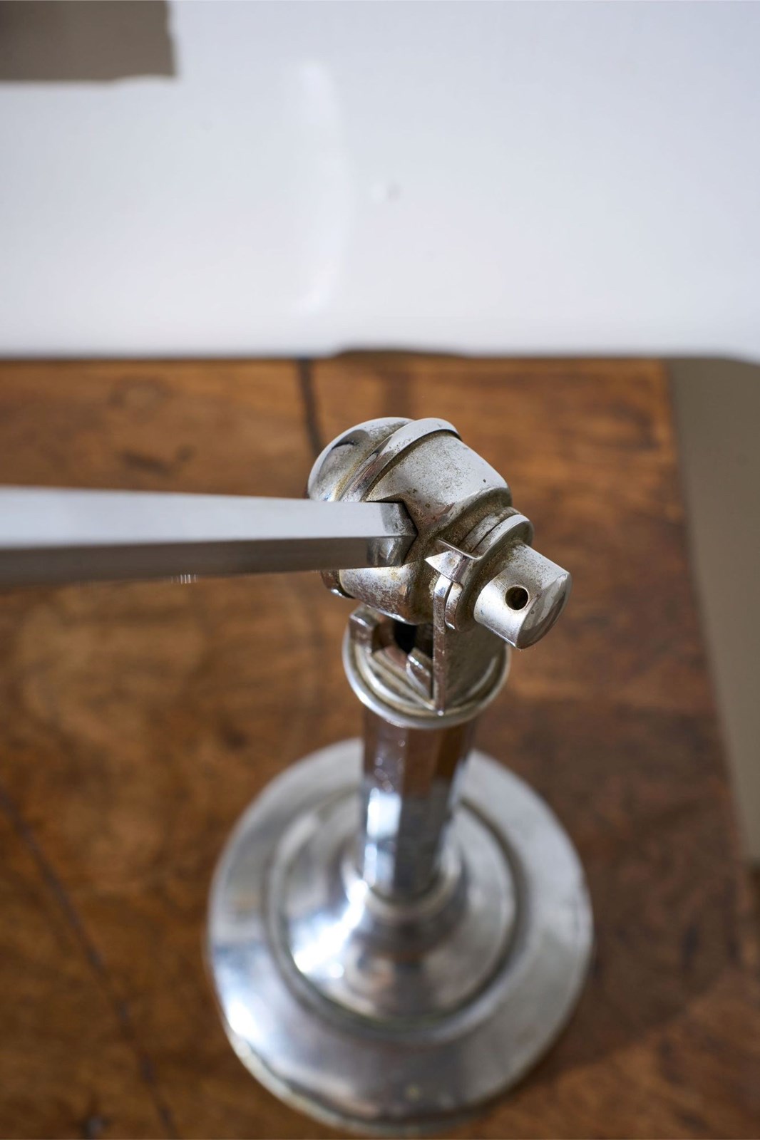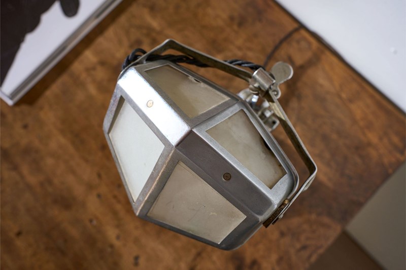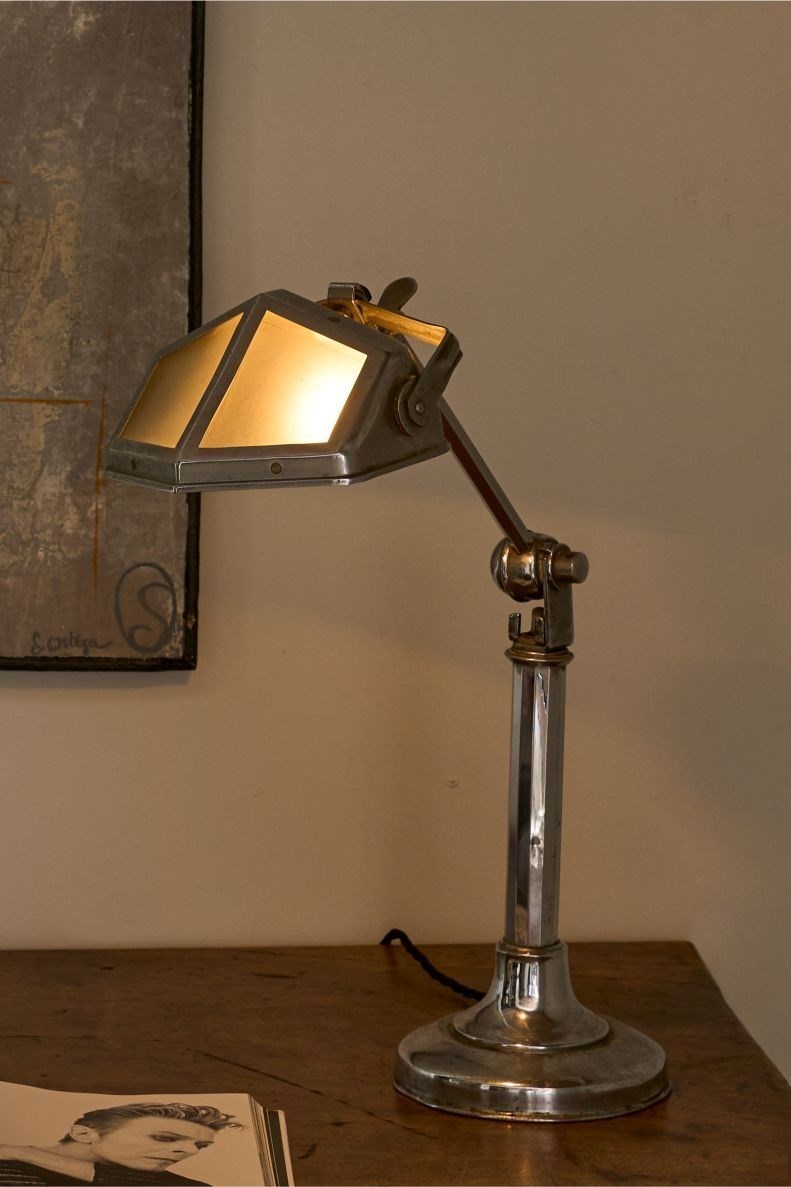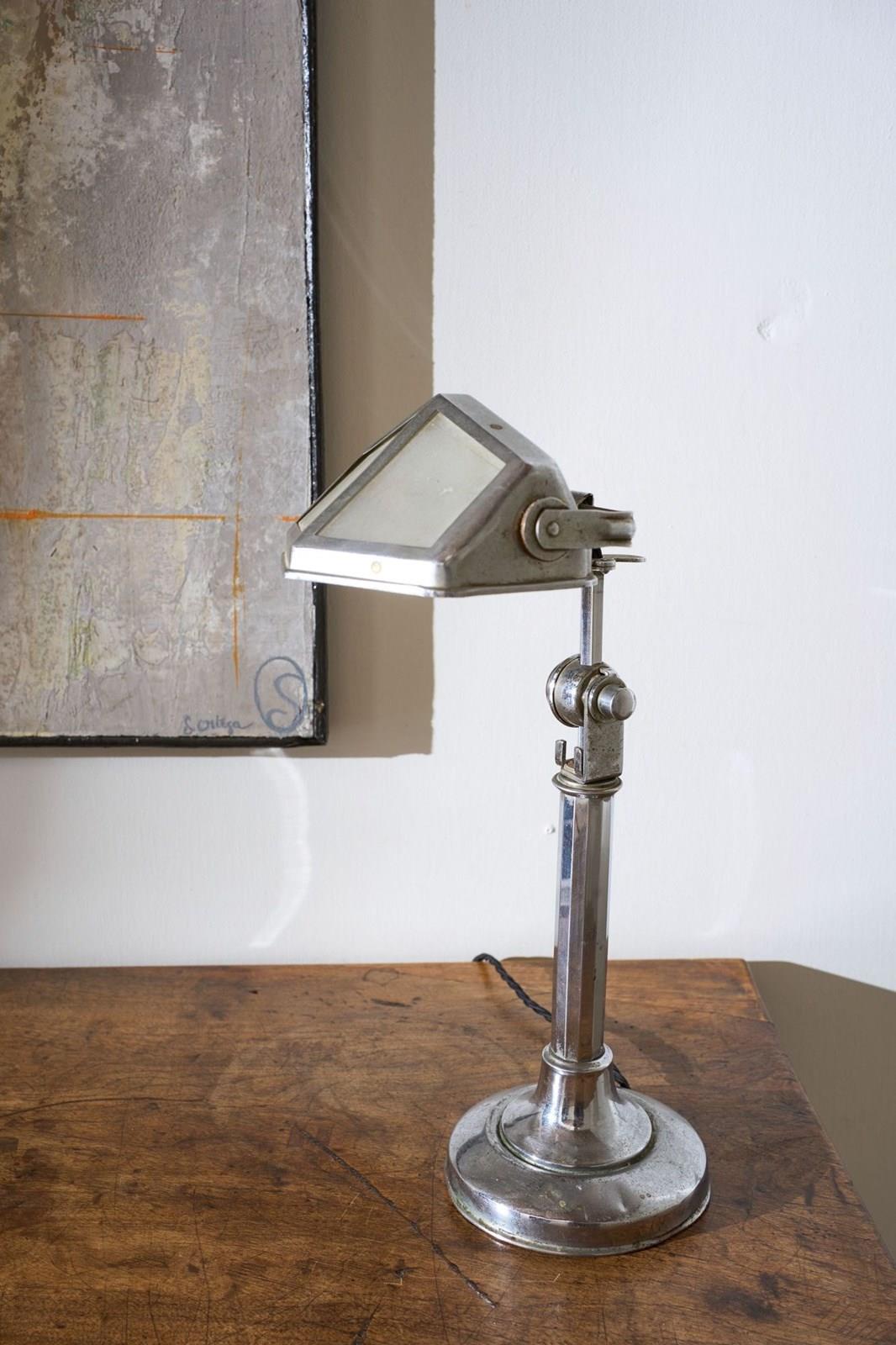 This is a very smart totally original, adjustable Art Deco desk lamp. The chrome has a lovely aged patina to it and this still retains the original frosted glass shade. The lamp is adjustable. It starts compact and then you can pull up the extending arm which once it hits a point you can then adjust the light up and down. This original mechanism still works well. The overall condition is good with a few small dents to the base but nothing that takes away from this piece which is a rare survivor.