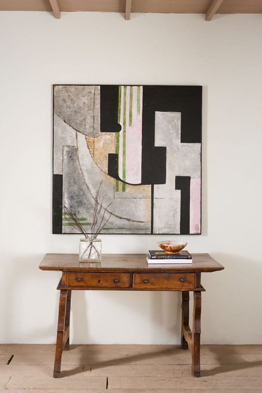 On our last buying trip to France we met Sylvia by chance and got talking about her interest in antiques and the fact she was an artist. We looked at her work and I fell in love with it immediately. She works with acrylic paint mixed with gesso and paints onto board giving her artwork a wonderful thickness and texture.