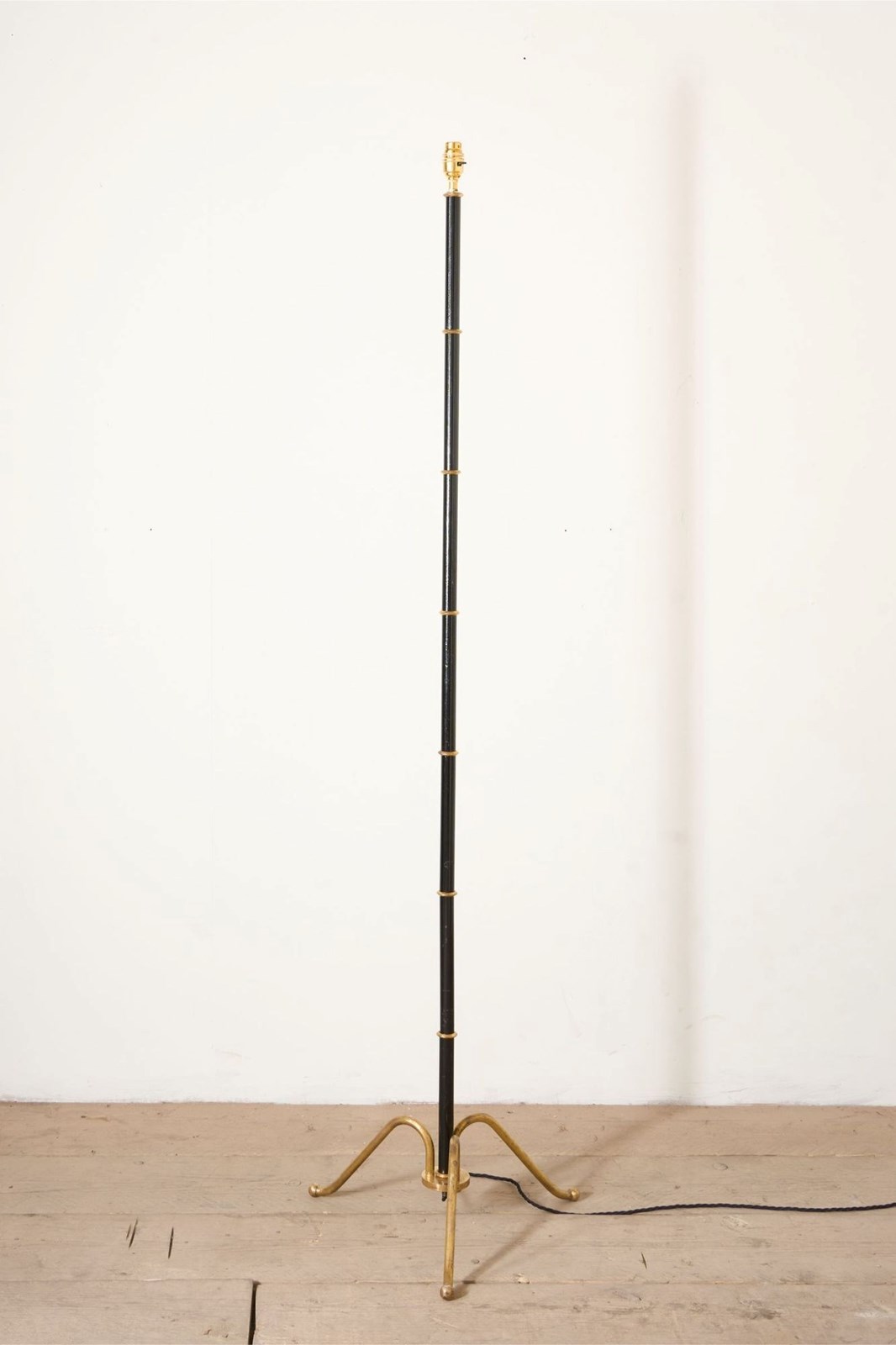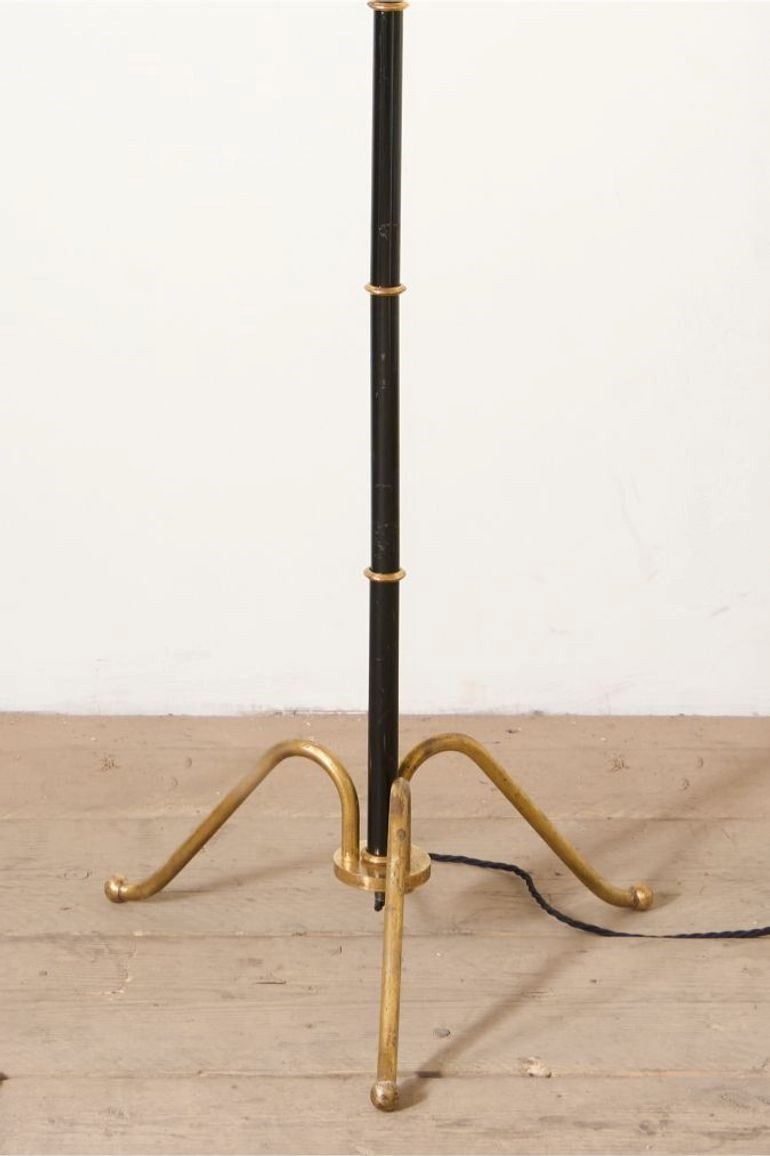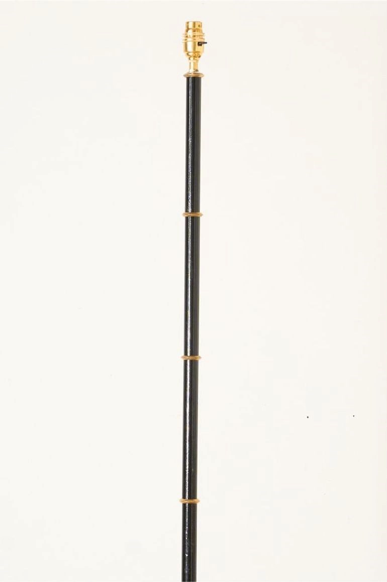 This is a stunning mid 20th century French floor lamp. Made from brass with black enamel body and the brass rings are a great detail. Triform brass legs and elegant proportions.