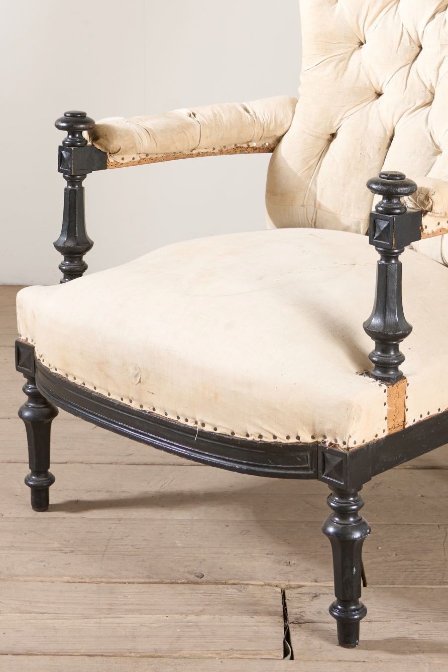 This is a very elegant 19th century Napoleon III buttoned back open armchair. Great design with the stylish ebonised frame. The size is attractive making it practical as well as decorative.
