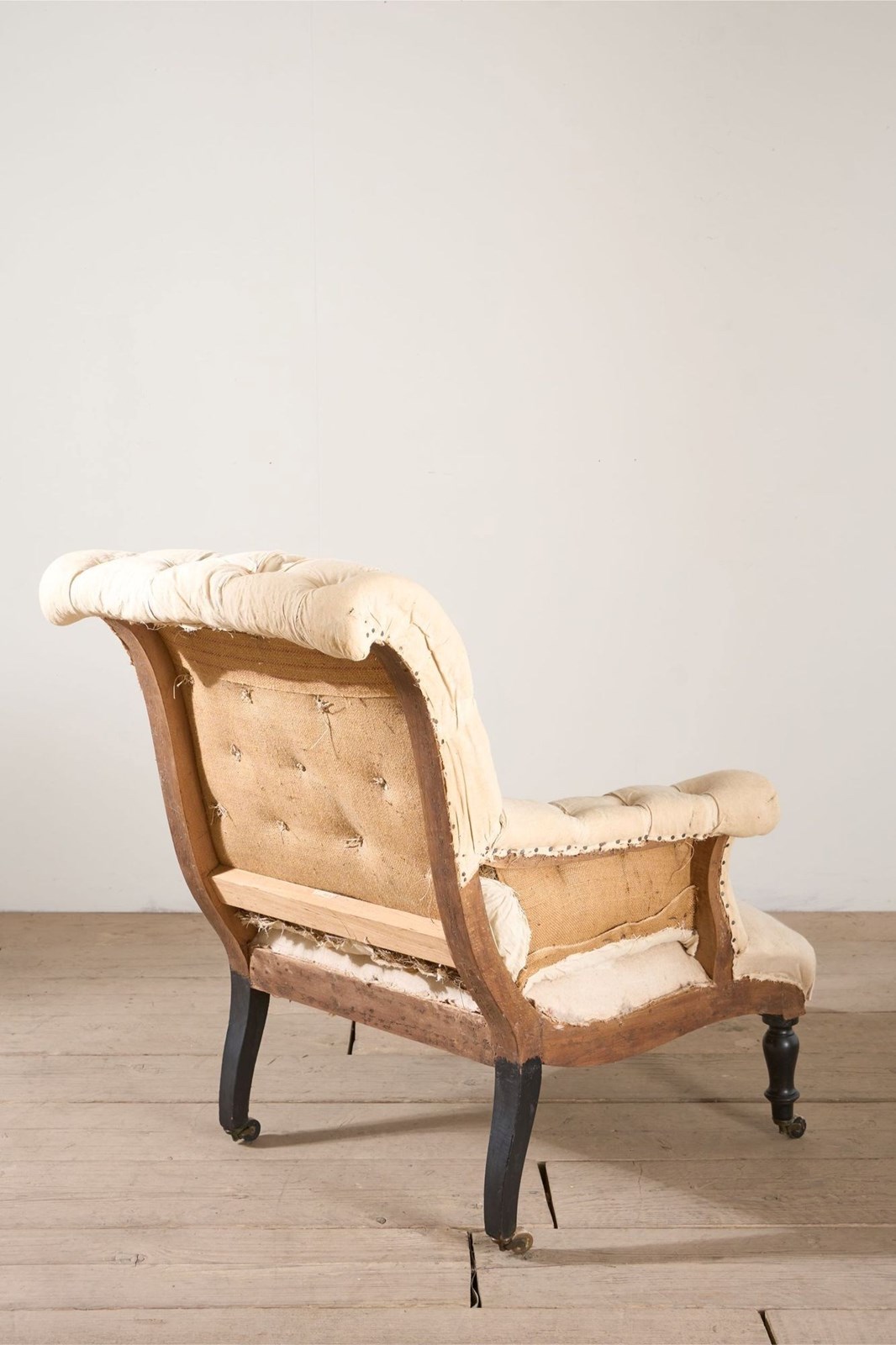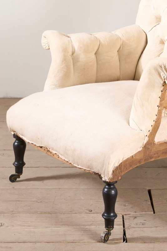 This is a very stylish Napoleon III buttoned scroll back armchair with a very shapely frame. I have not seen one like this before. A great feature in a room for its unusual design and incredibly comfy as well due to its large size. Standing on neat turned legs as well.