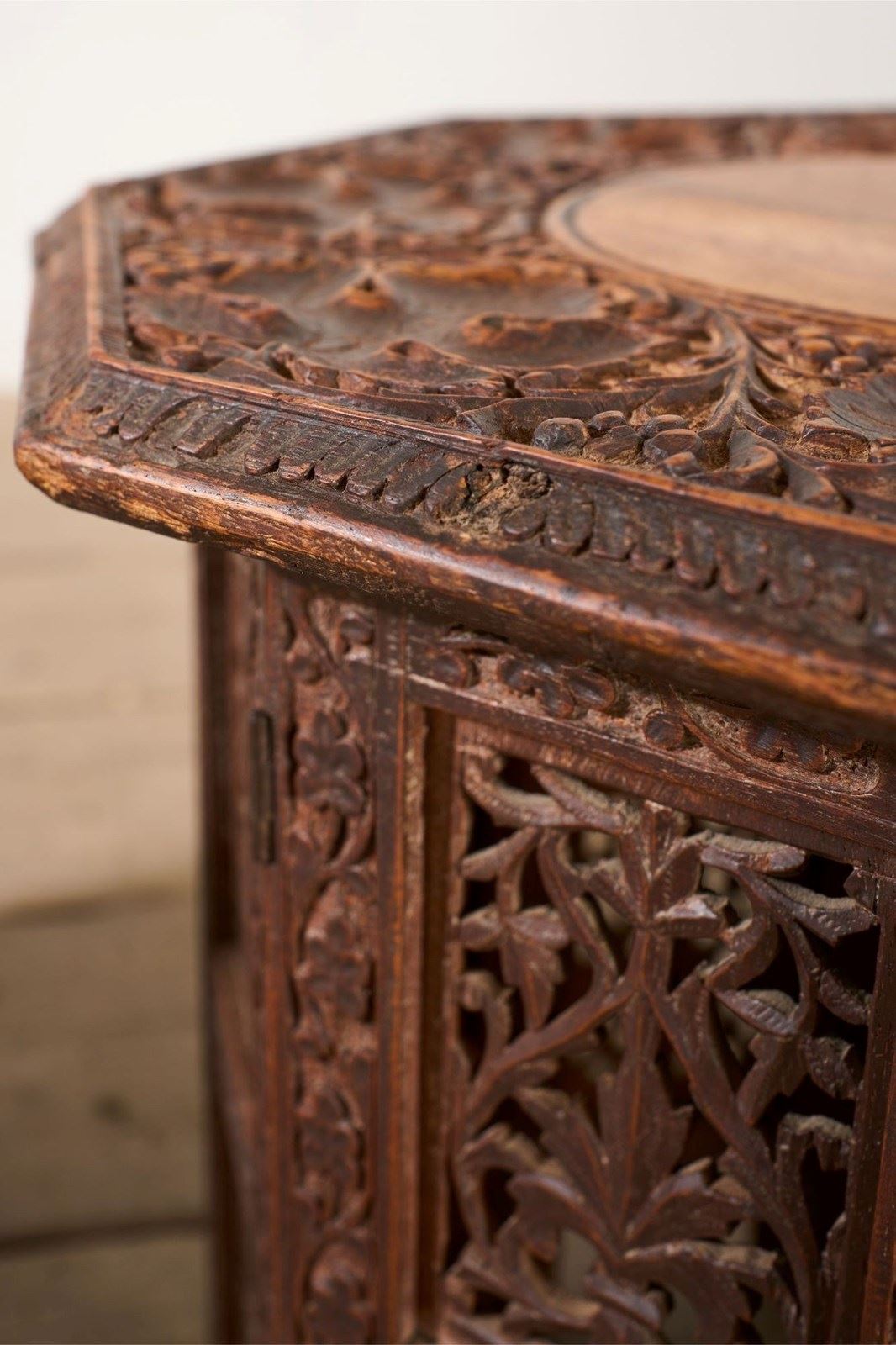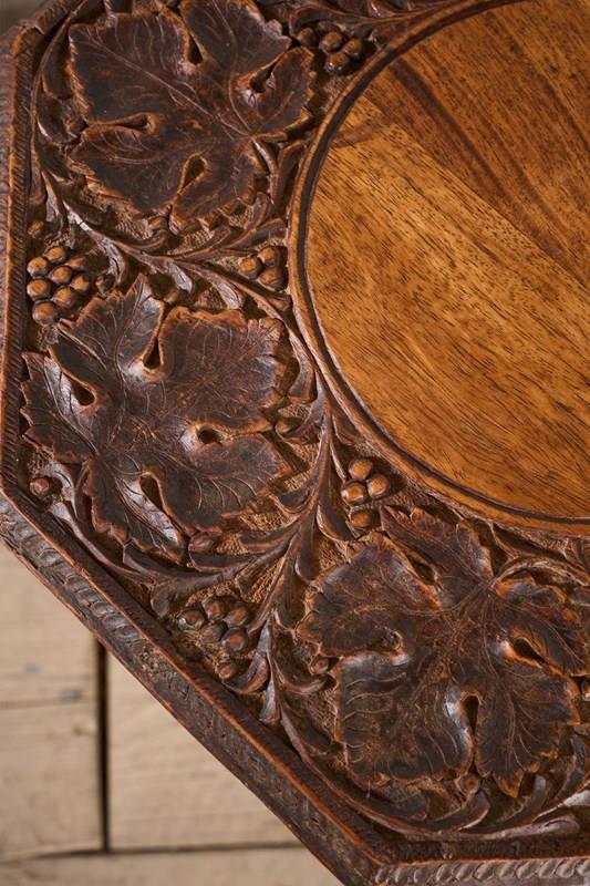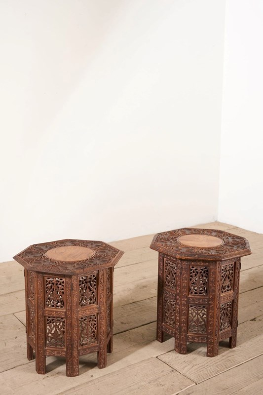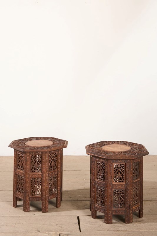 These are a lovely quality pair of totally original 19th century Anglo Indian side tables. Made from Padauk and have a great weight to them. The finely carved tops really stand out and there are no major losses or damages. Rare to find a pair as well.