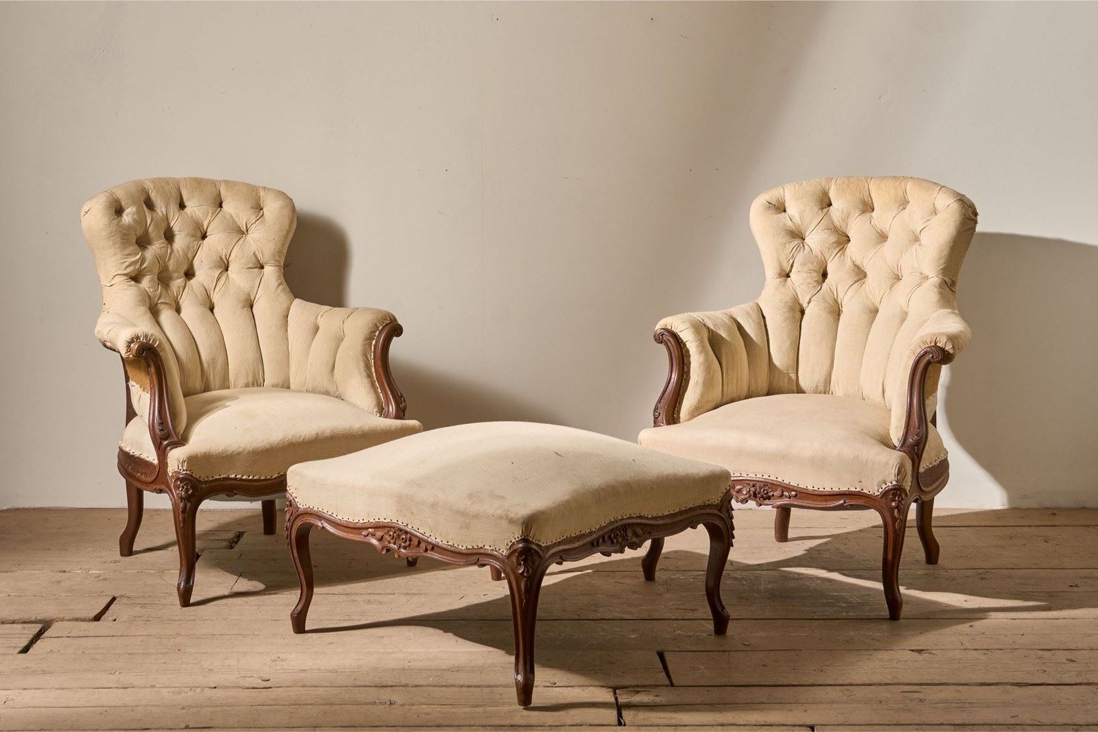 Pair Of 19Th Century Buttoned Back Armchairs With Matching Stool