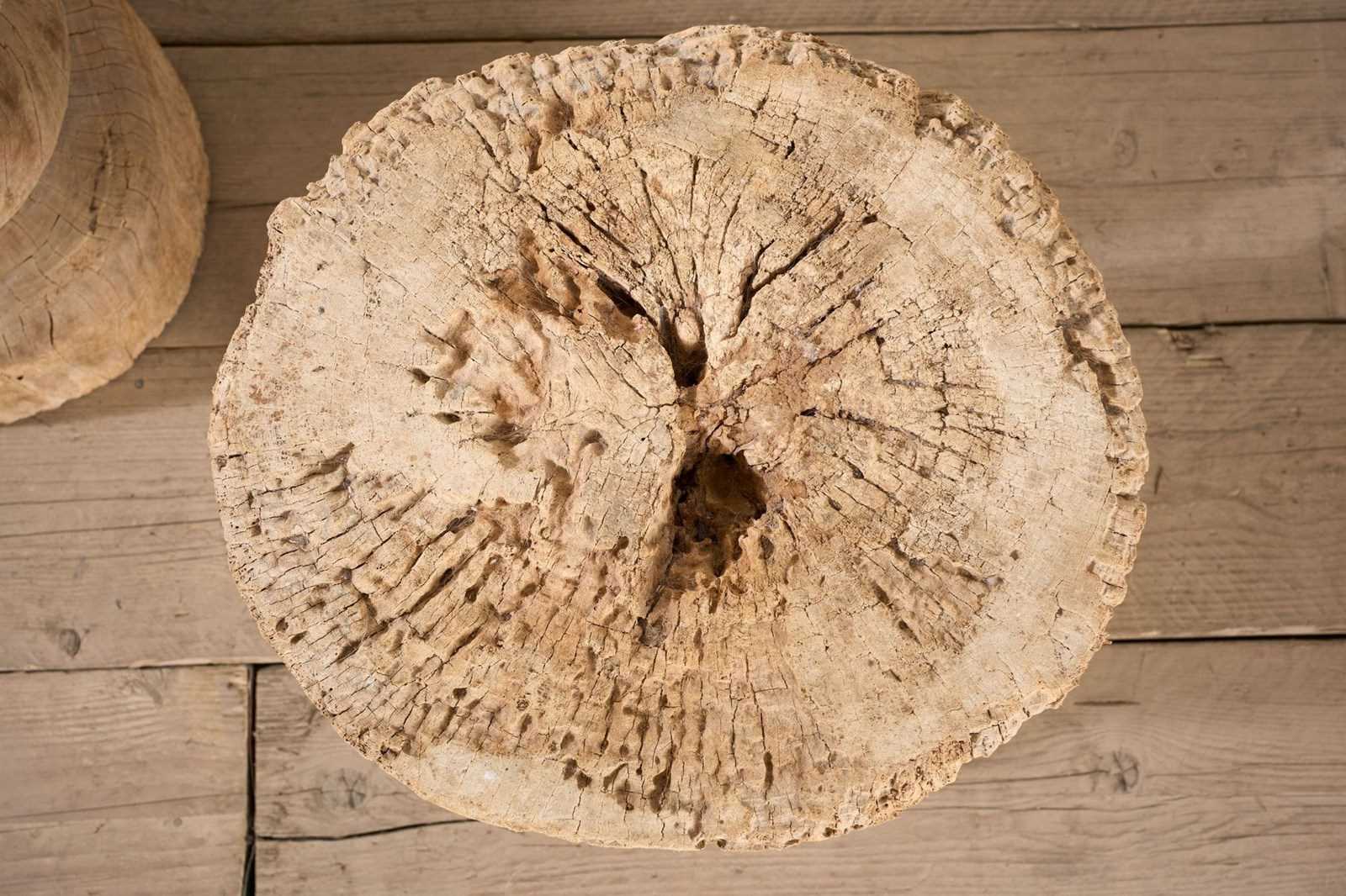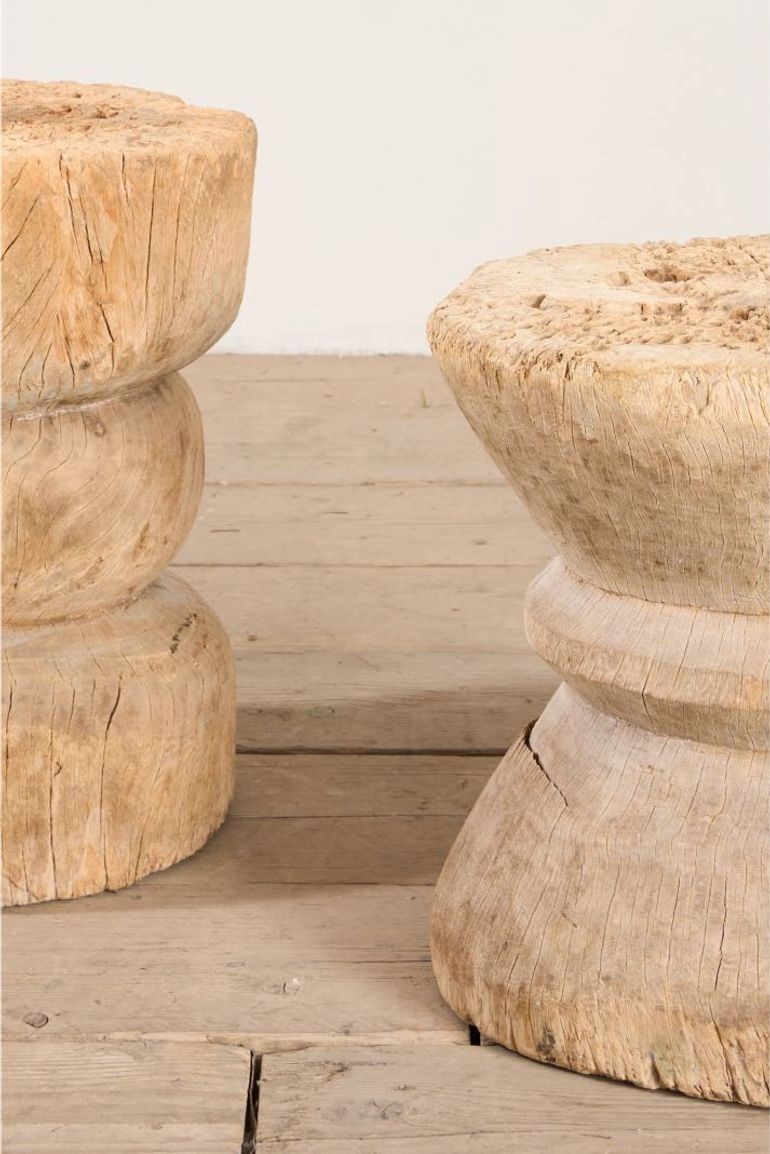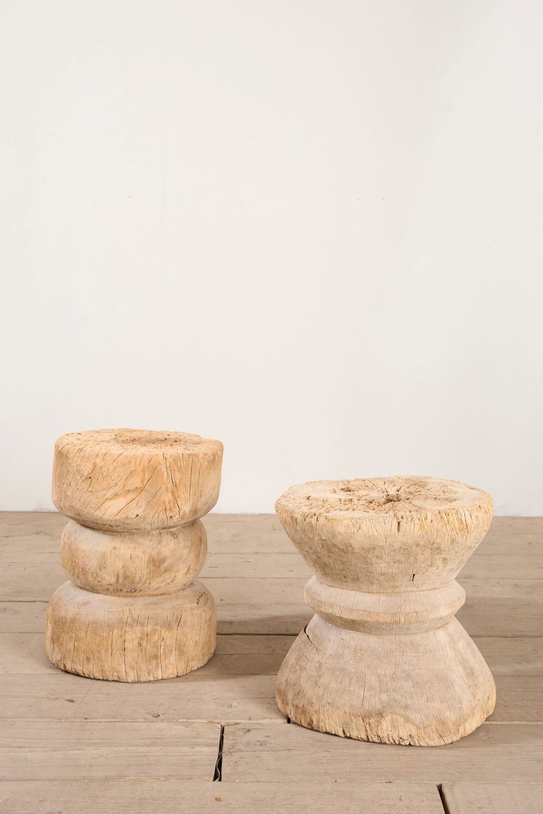 These are original rustic solid wood stools we found in the South of France. They have been sun bleached and have an almost petrified wood appearance as they are extremely hard. The tops has a stunning gnarled appearance but remain level to be used as a side table. The designs are very contemporary and will work well in a huge number of interiors.