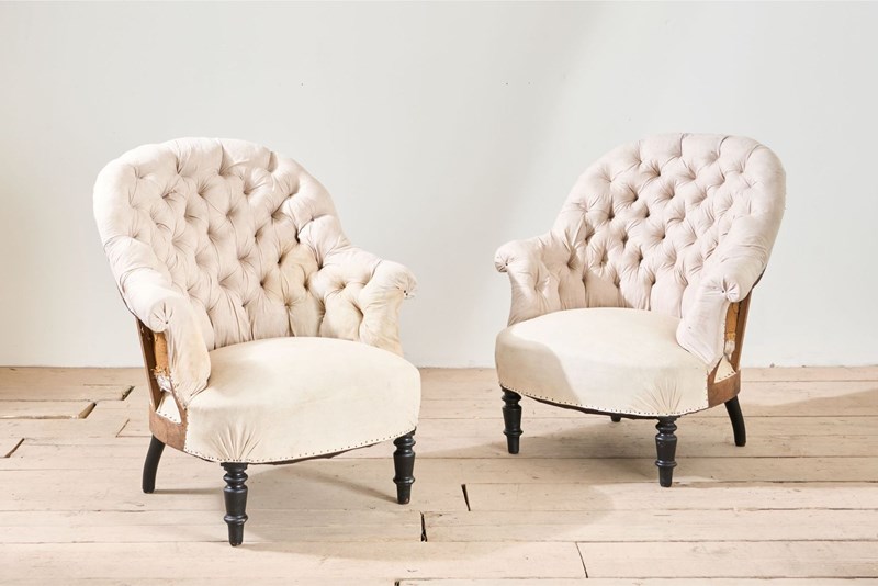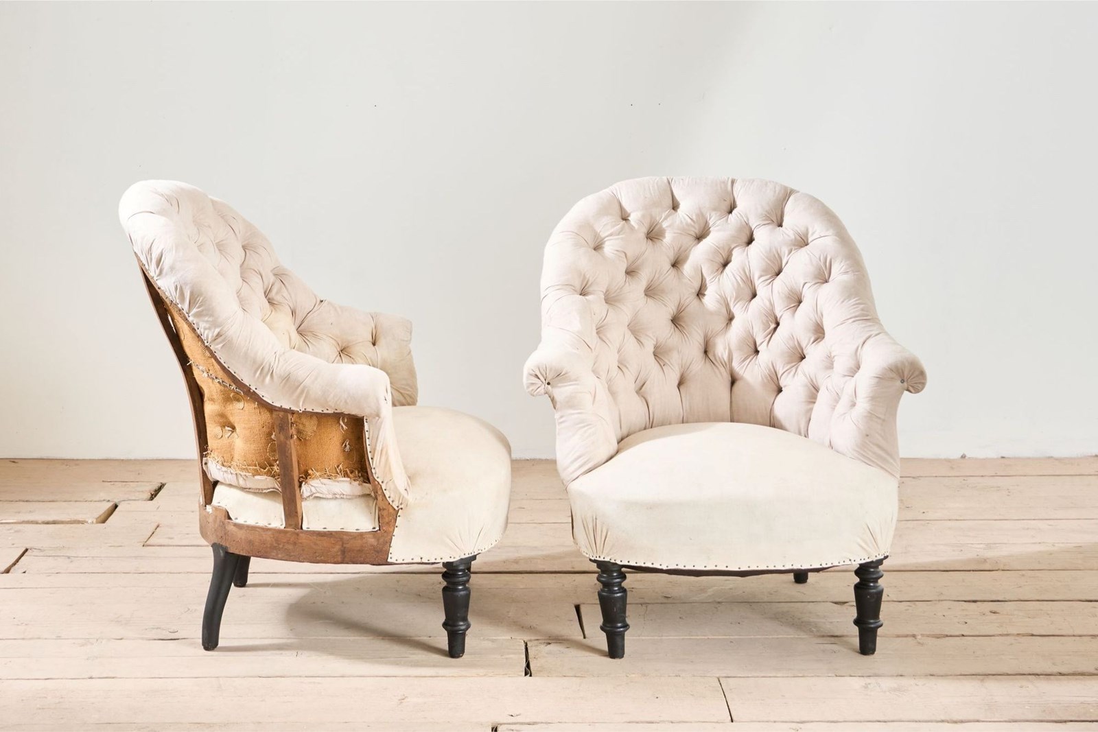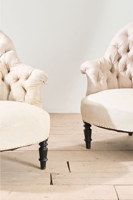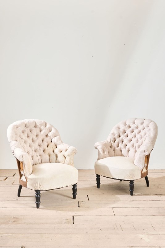 These are a very high quality pair of French buttoned tub chairs. Elegant design and neat proportions. Ideal bedroom chairs or occasional seating in a living room.
