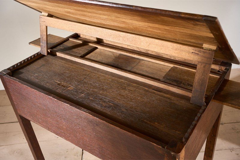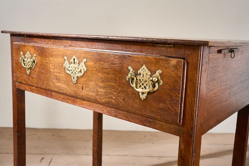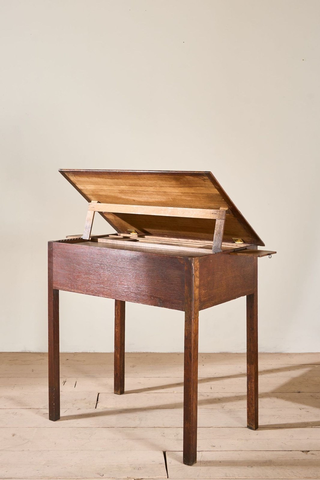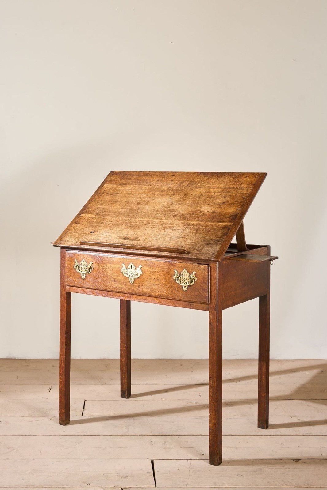 This is rare and unusual 18th century oak artists table. Really smart design and totally original condition. When not in use this looks like a nice quality 18th century Low boy making it very decorative. But for those that know this turns into a rare surviving piece of furniture with a fully adjustable top and oak rail as well as two pull out stands, one at each side originally for brushes and water. Lovely interesting piece of furniture that is also practical as the drawer is very generous.