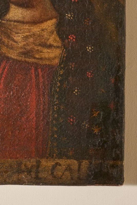 This is a very fine original 17th century Spanish colonial painting. The figure shown is Mary and there is some text below which I can't make out. The size means all details have to be fine and the certainly are. The canvas is in very good condition with no holes. It has been re stretchered but very well and was done to preserve the piece.