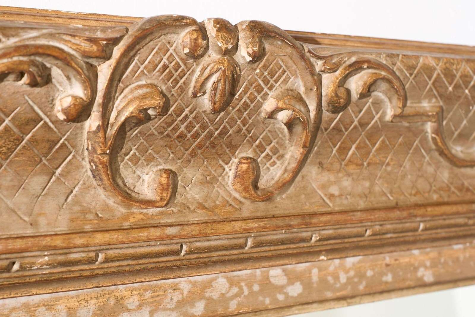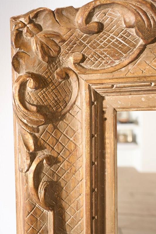 This is a striking 19th century very large carved gilt and paint mirror. French in origin and the frame has a beautiful worn dry appearance to the gilt which gives it a subtle elegance. The mirror plate is not original 6mm clean condition. Overall size is what makes this a great piece of wall decoration.