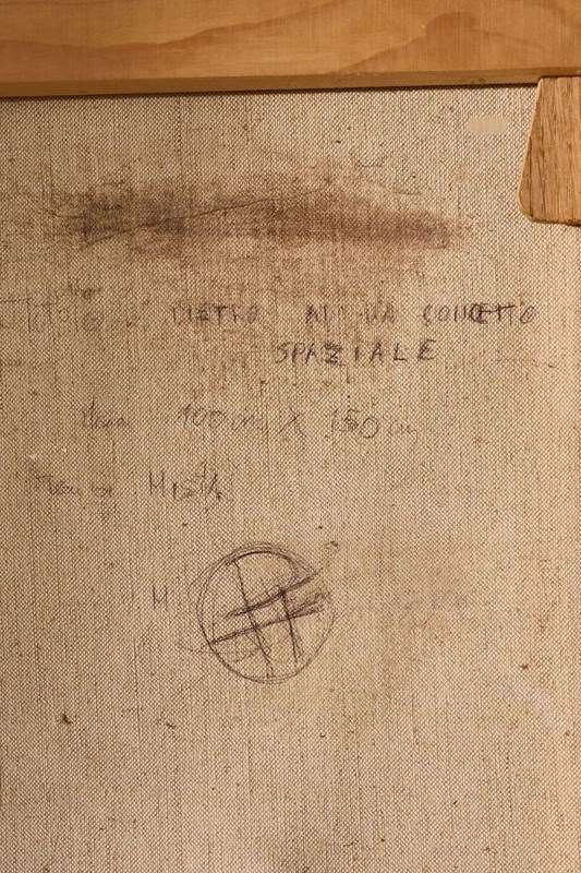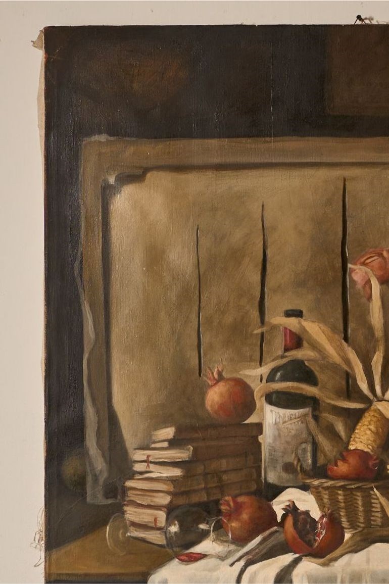 This is a very attractive large scale 20th century Italian painting. It shows a scene of a studio with a still life in the centre in front of a torn canvas in the manner of Lucio Fontana.
