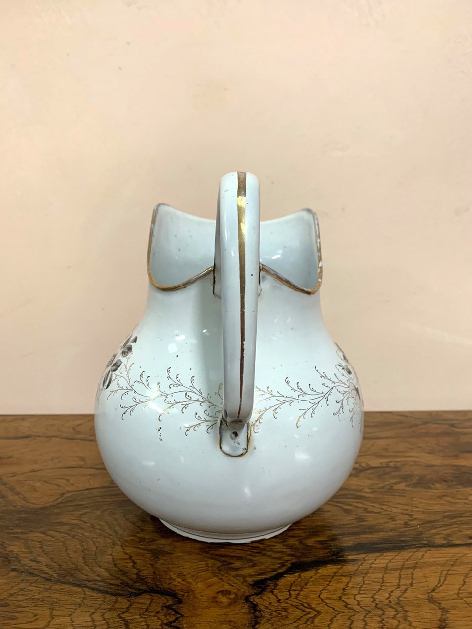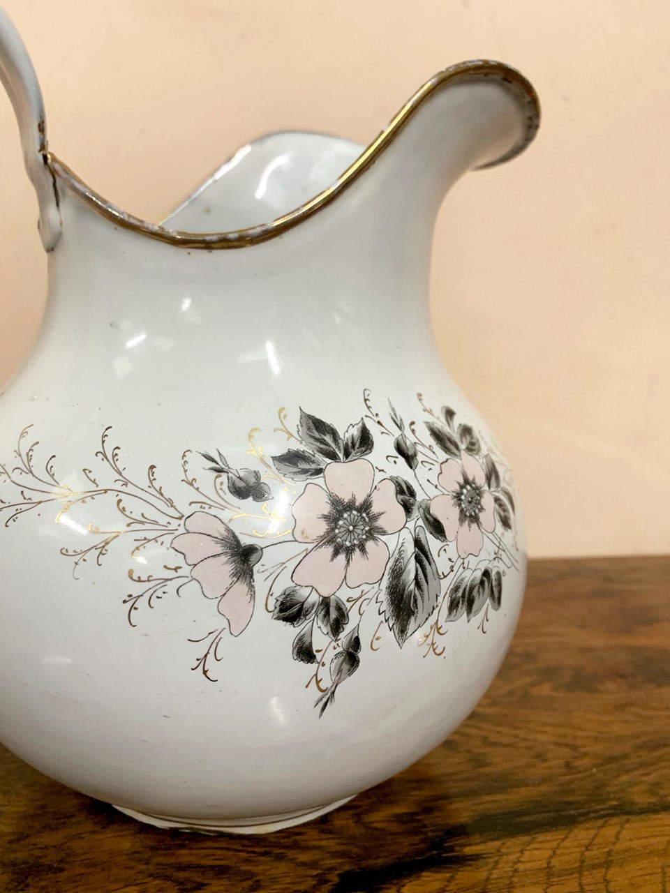 Beautiful white enamel jug with a wide spout and decorated with pale pink anemones.