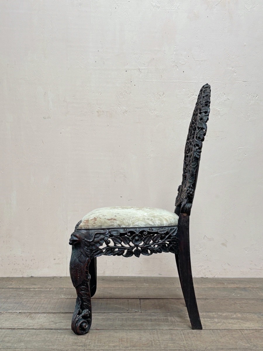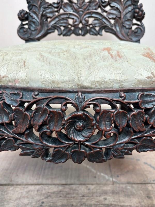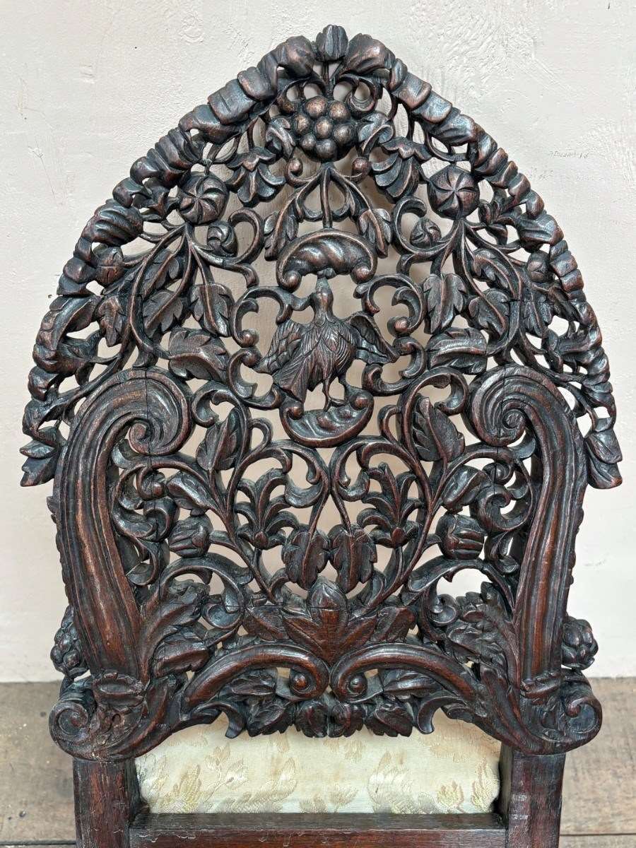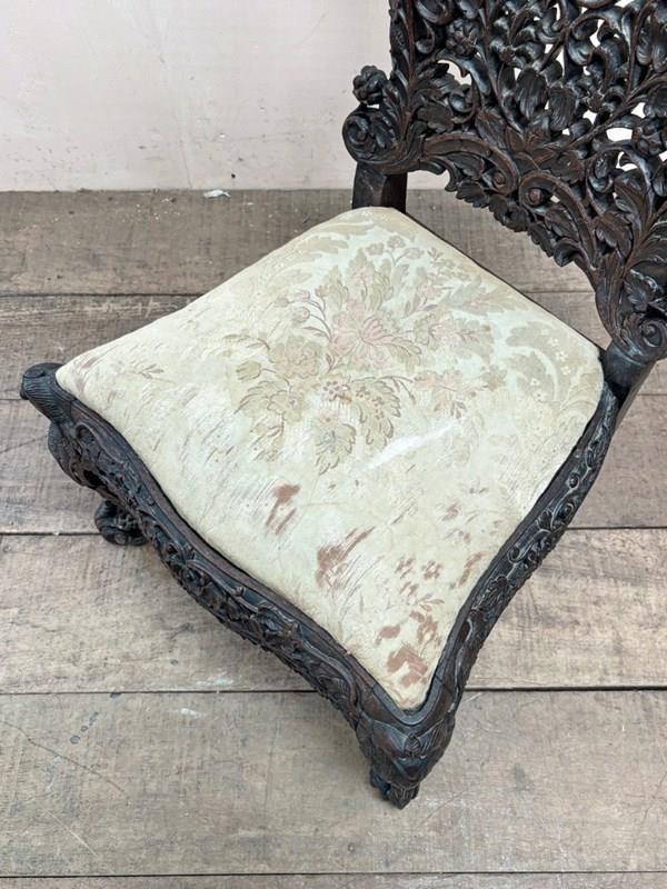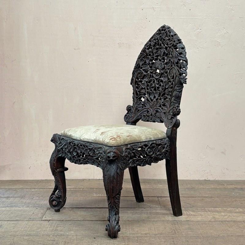 Late 19th century profusely carved Anglo Indian padouk chair retaining original fabric to seat and untouched patina.