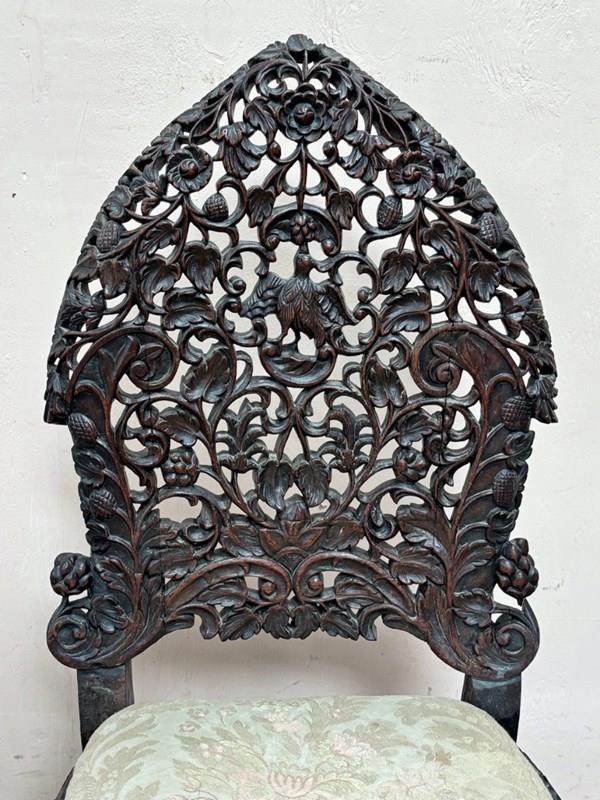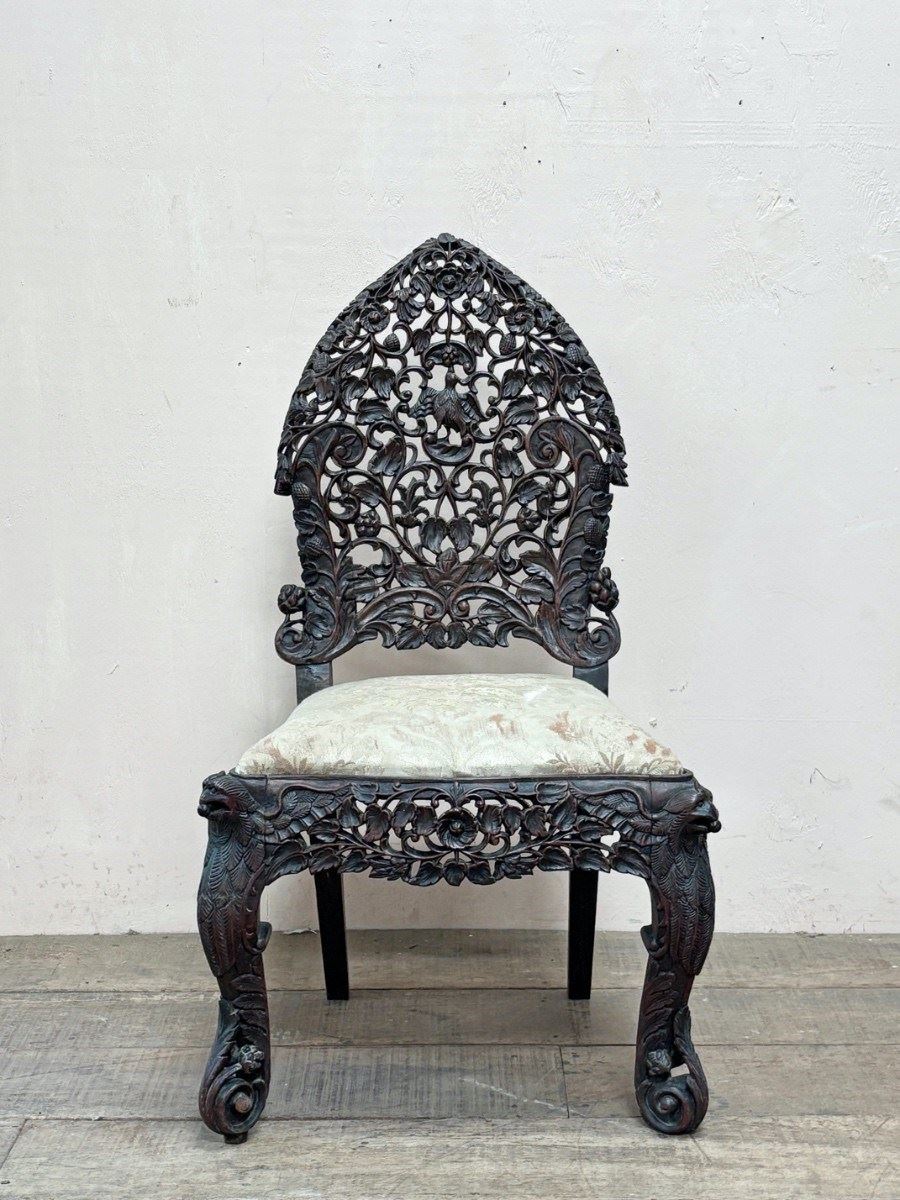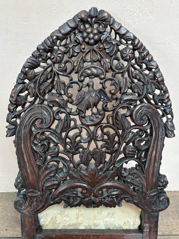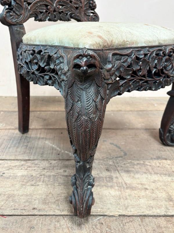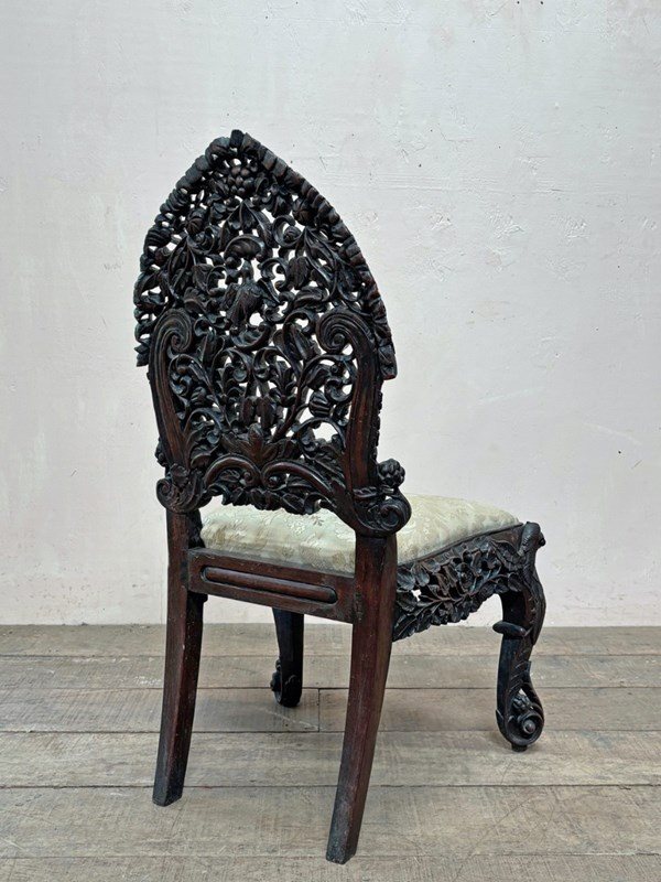 Late 19th century profusely carved Anglo Indian padouk chair retaining original fabric to seat and untouched patina.