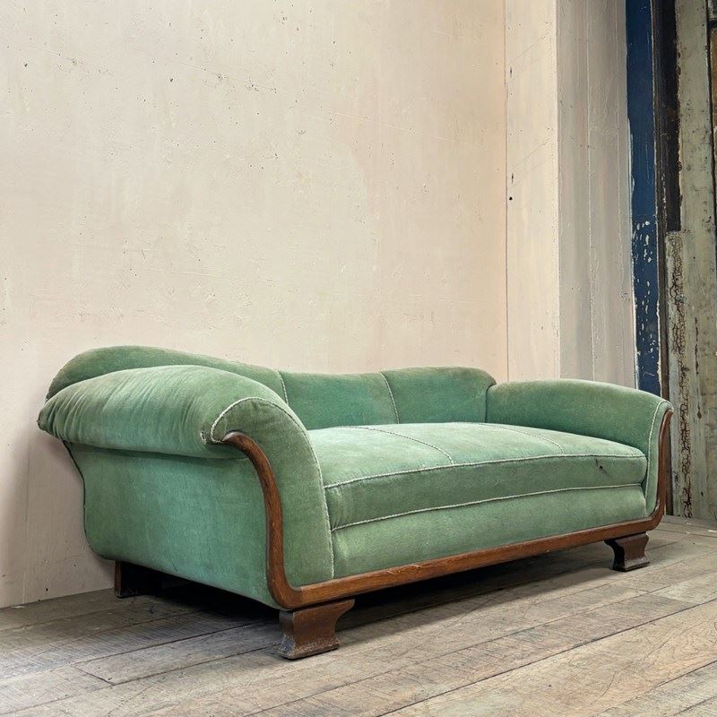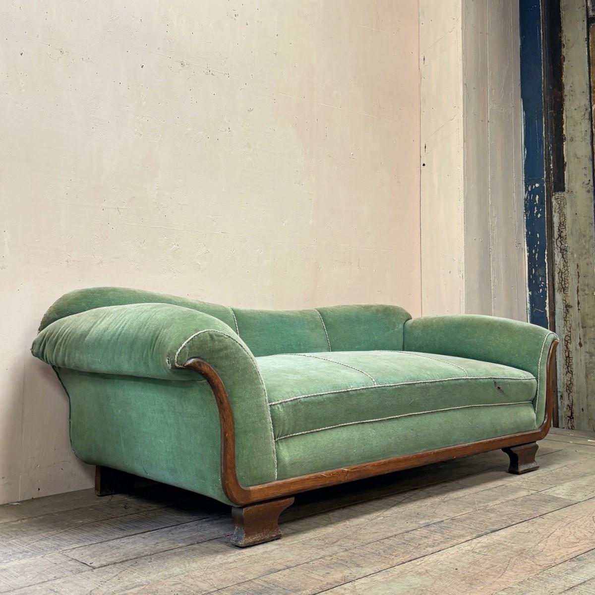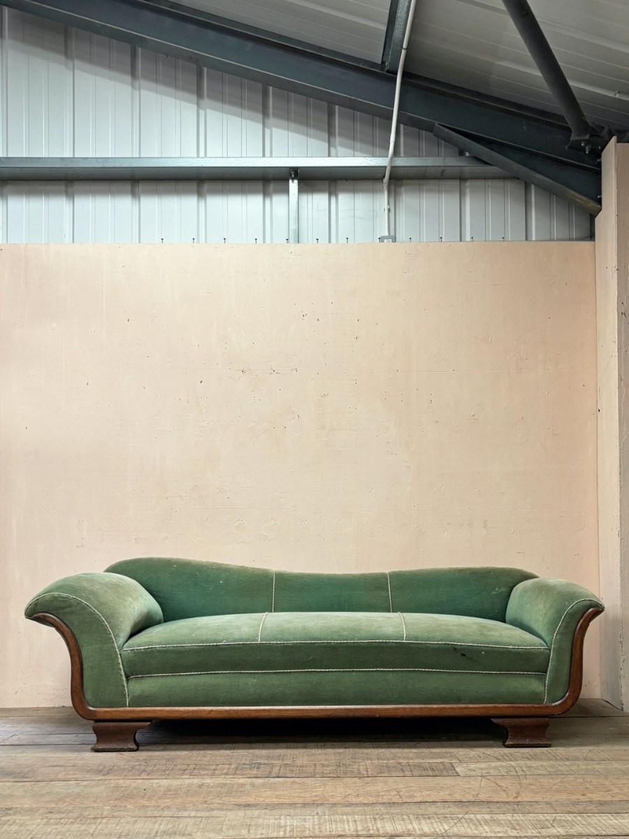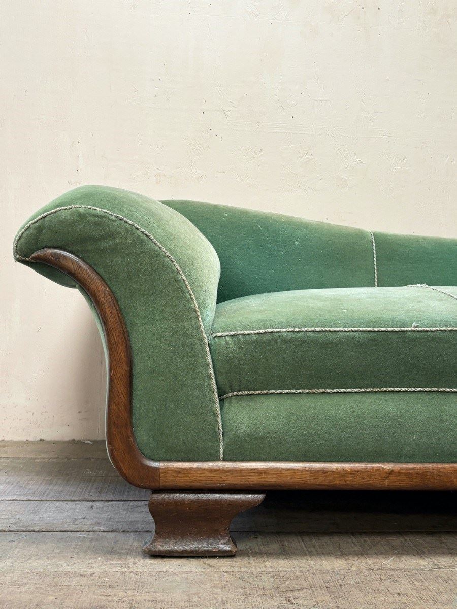 Traditionally upholstered with fully sprung seat and arms and retaining its original green chair velvet with rope edging.