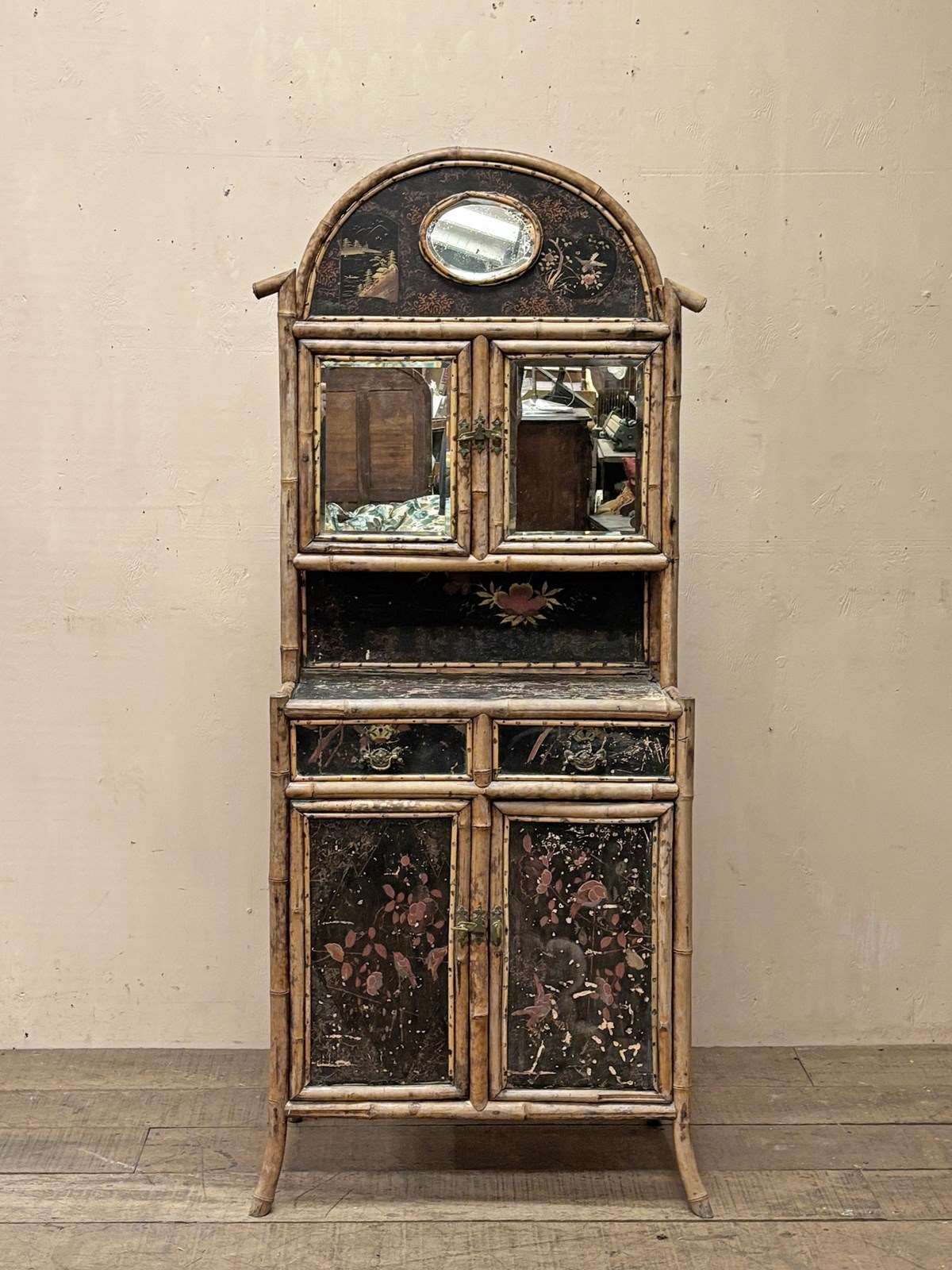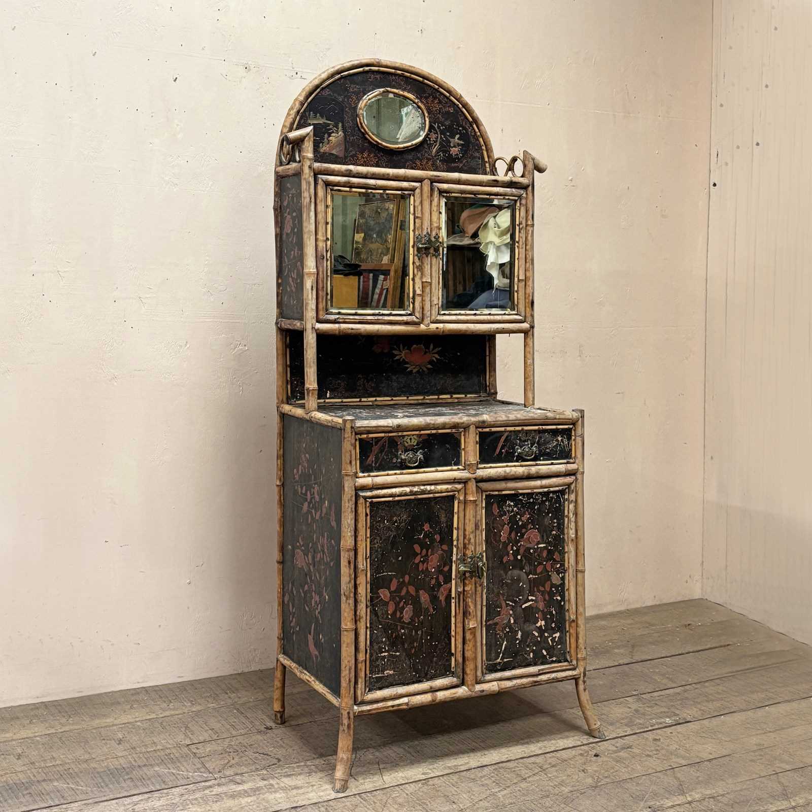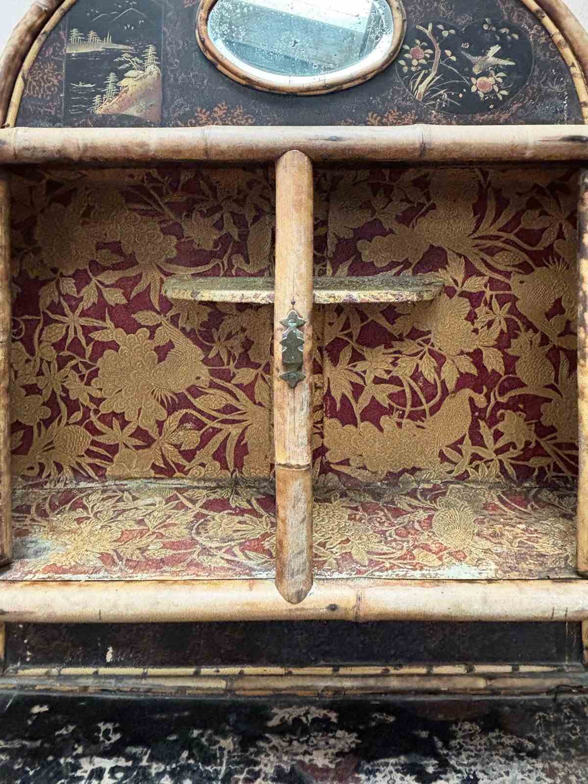 It retains its original metal work and foxed bevelled mirror plates, with interiors lined in beautiful embossed paper.