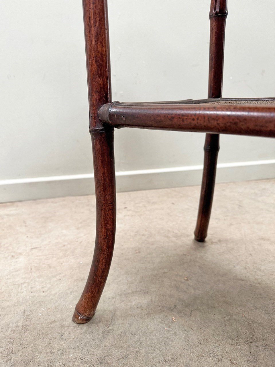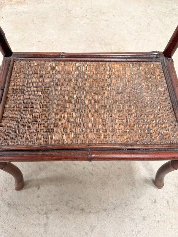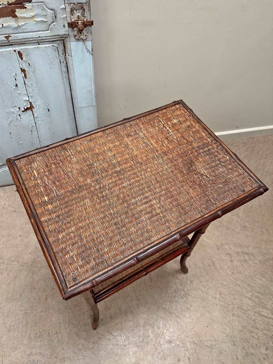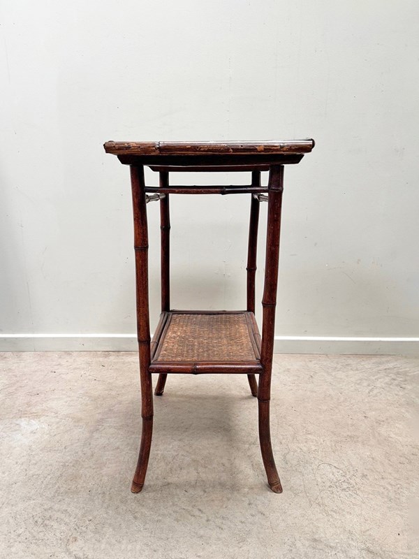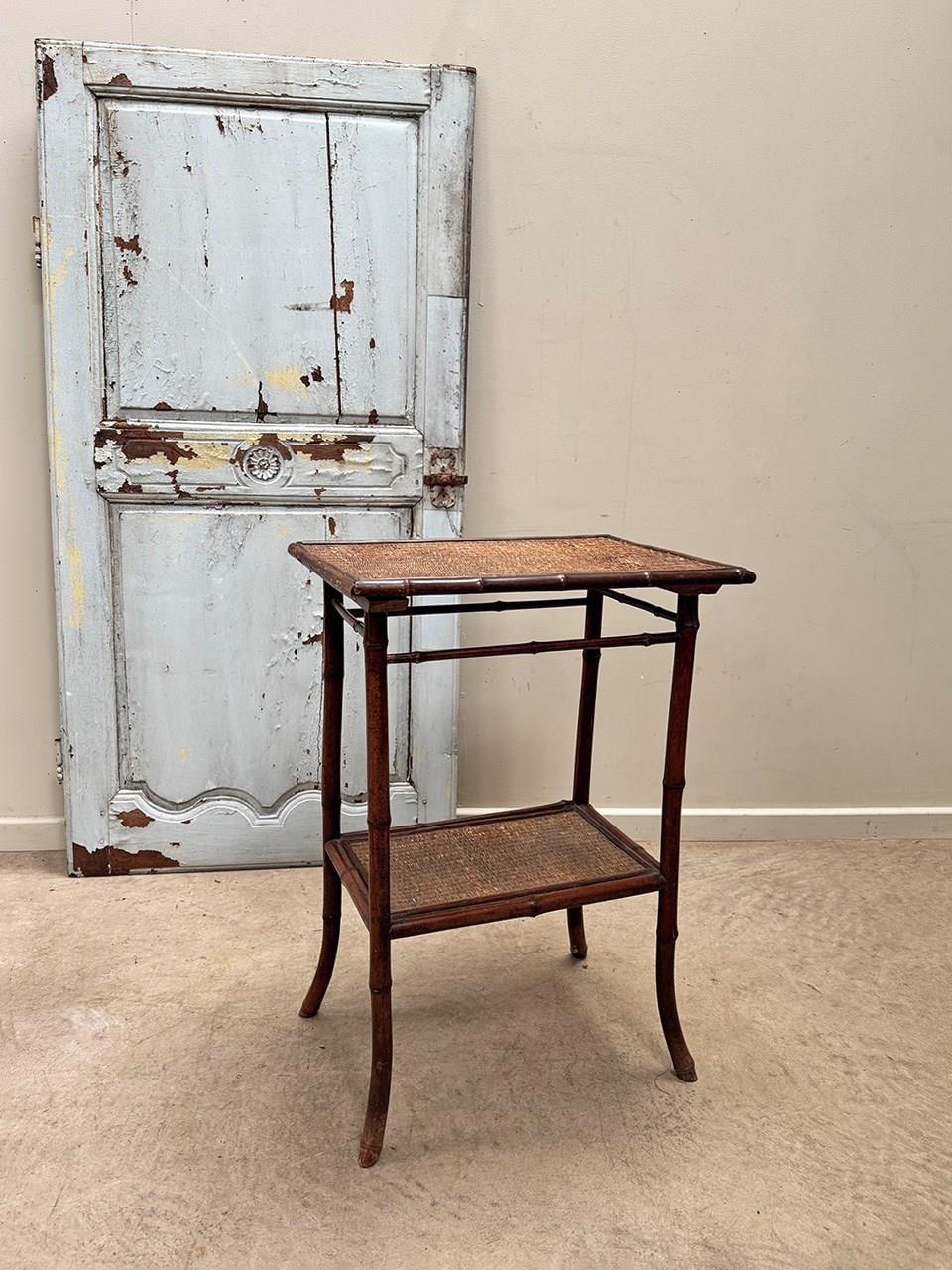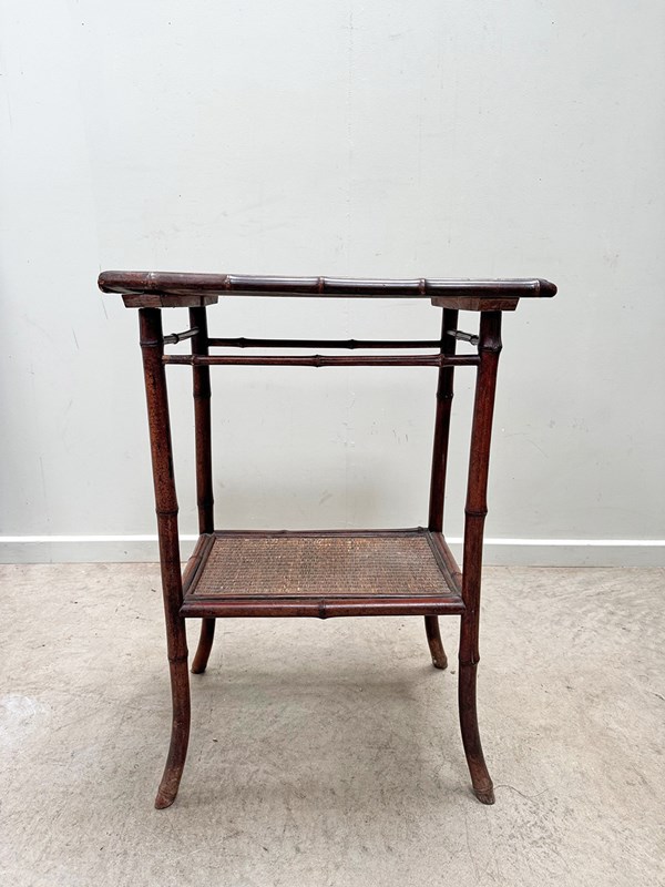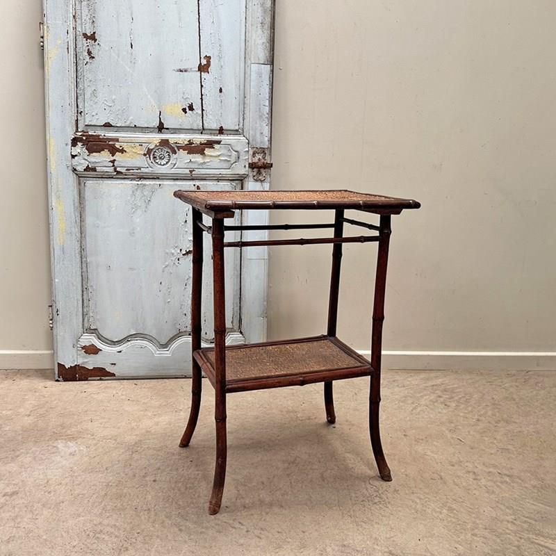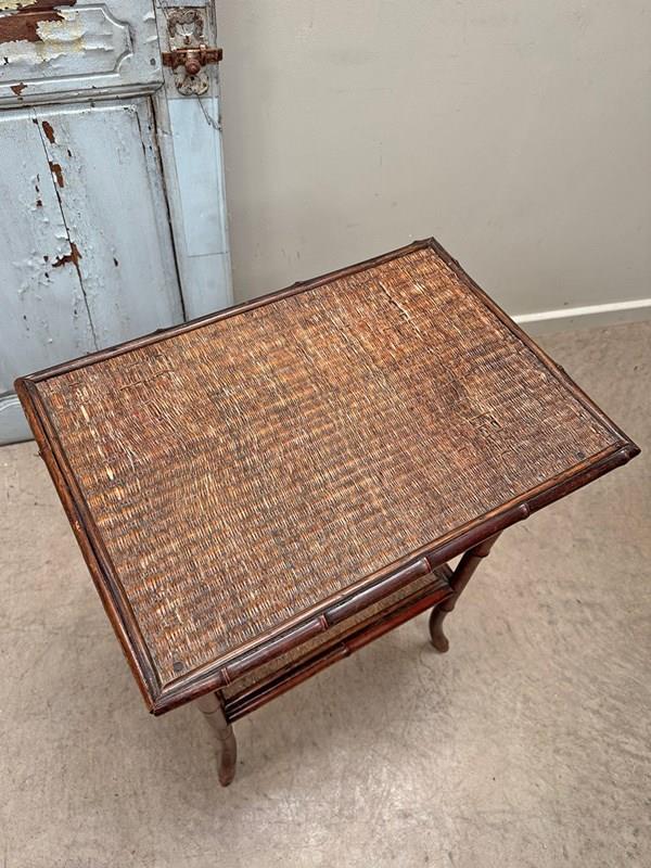 Sturdy late 19th century bamboo table with woven top and lower level shelf.