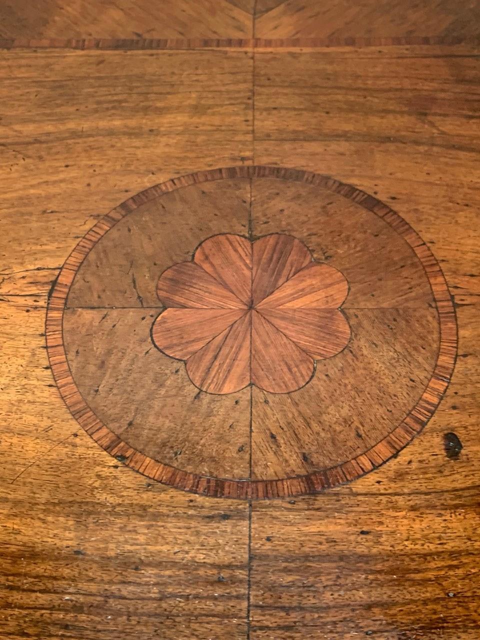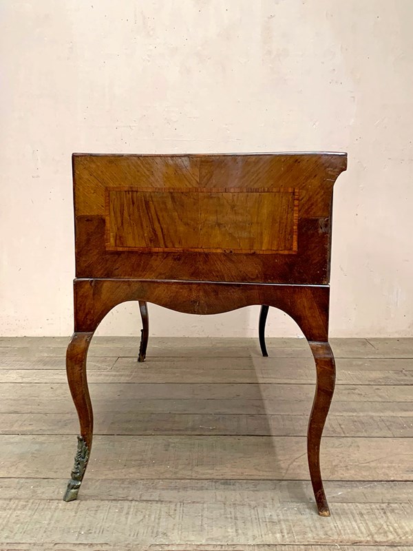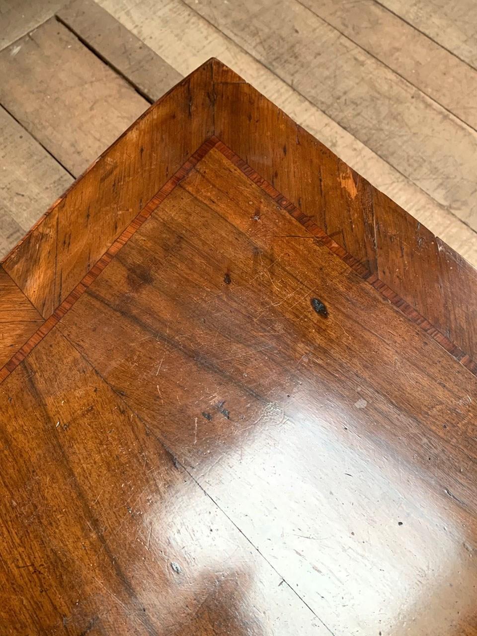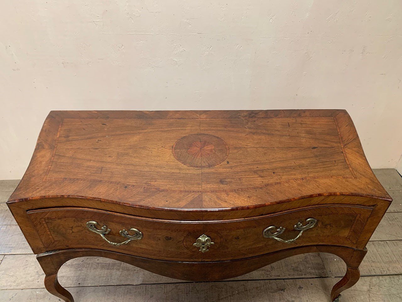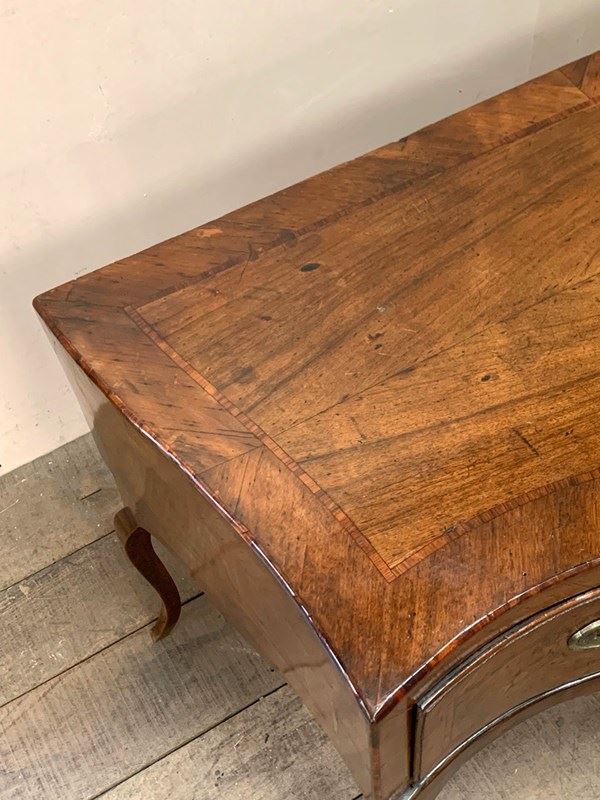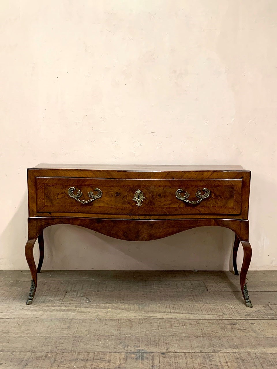 Set on cabriole legs, with brass detailing, the piece is in fact in two sections; the drawer and frame sits on top of the curved base.