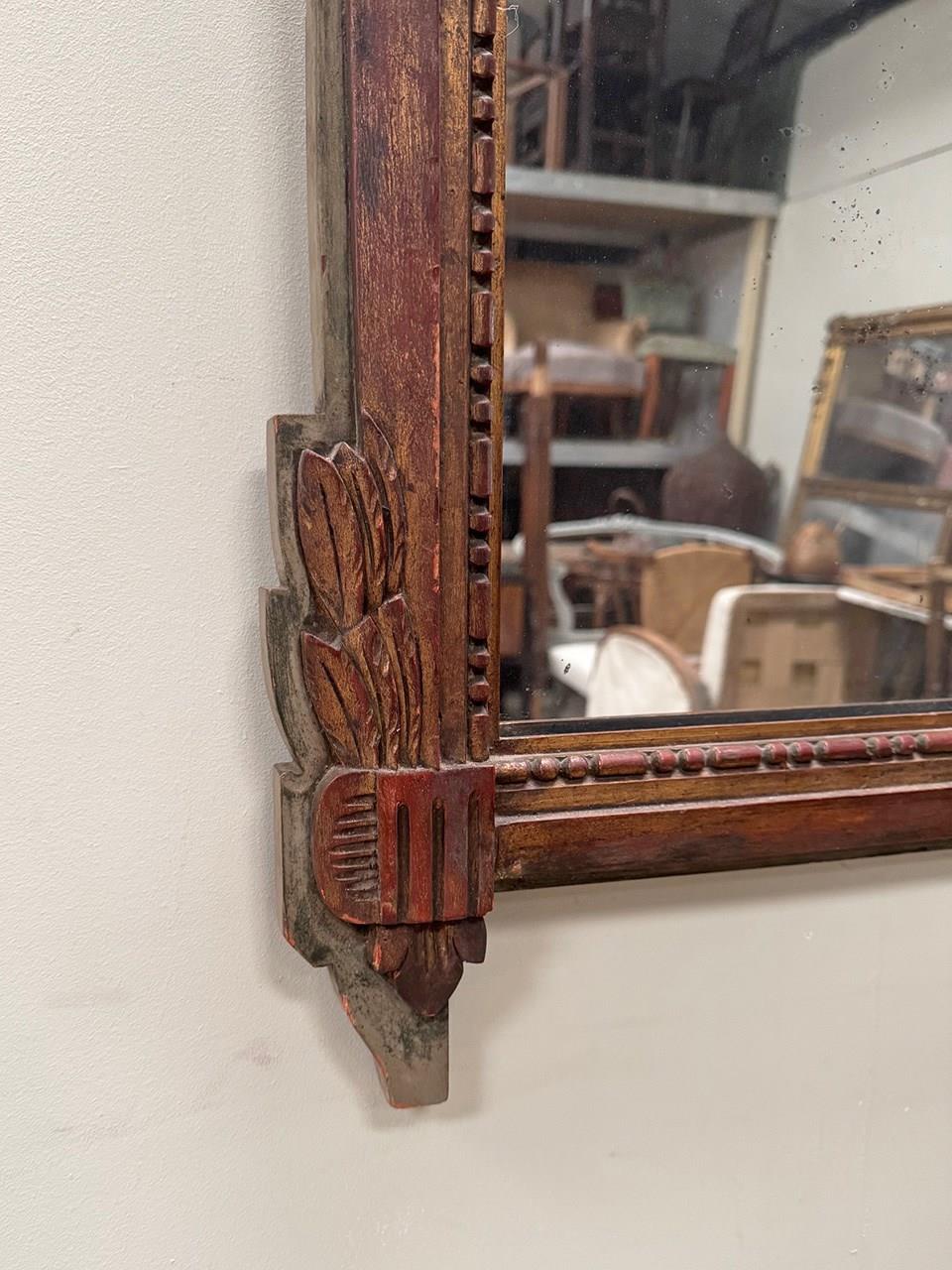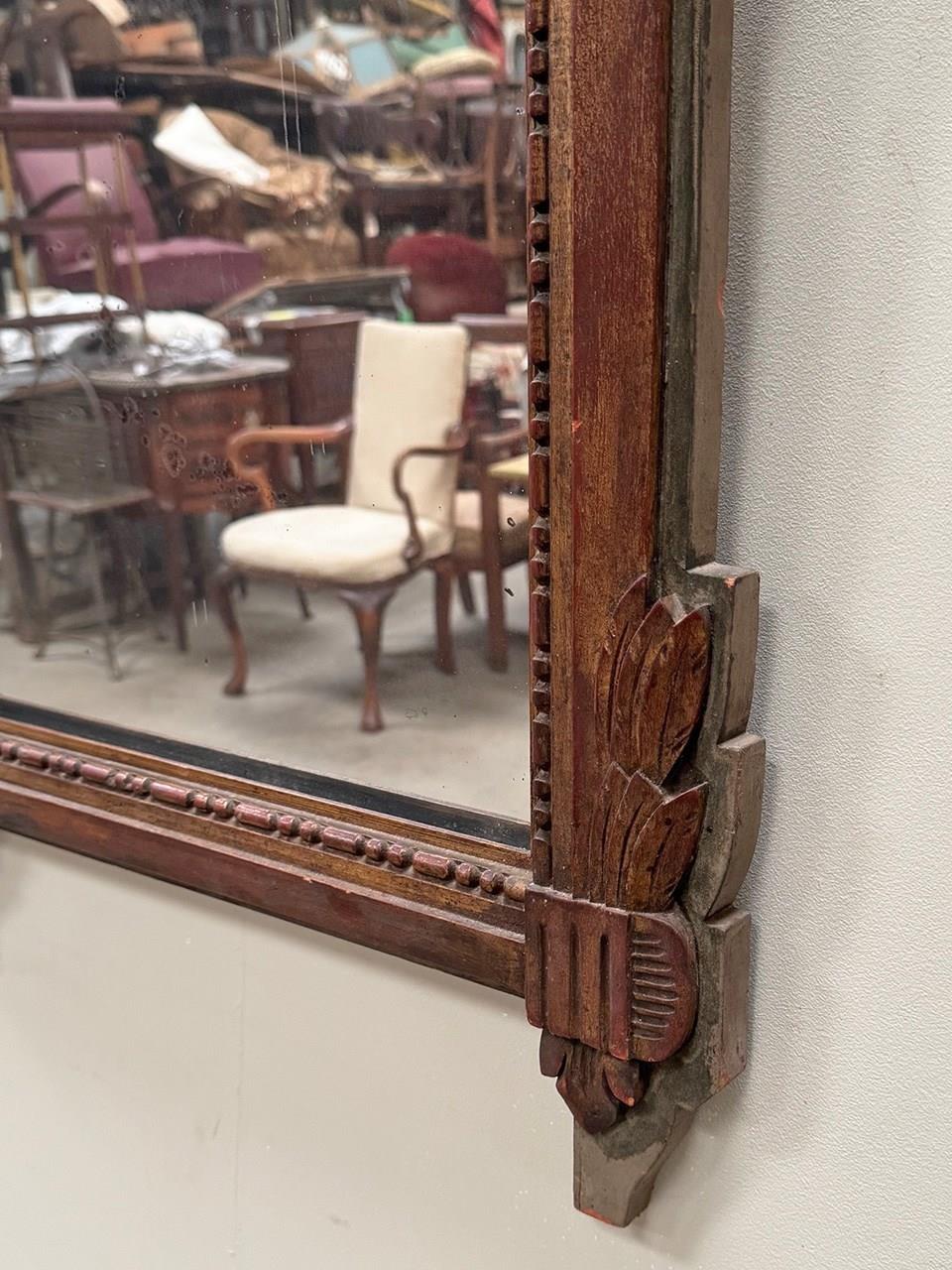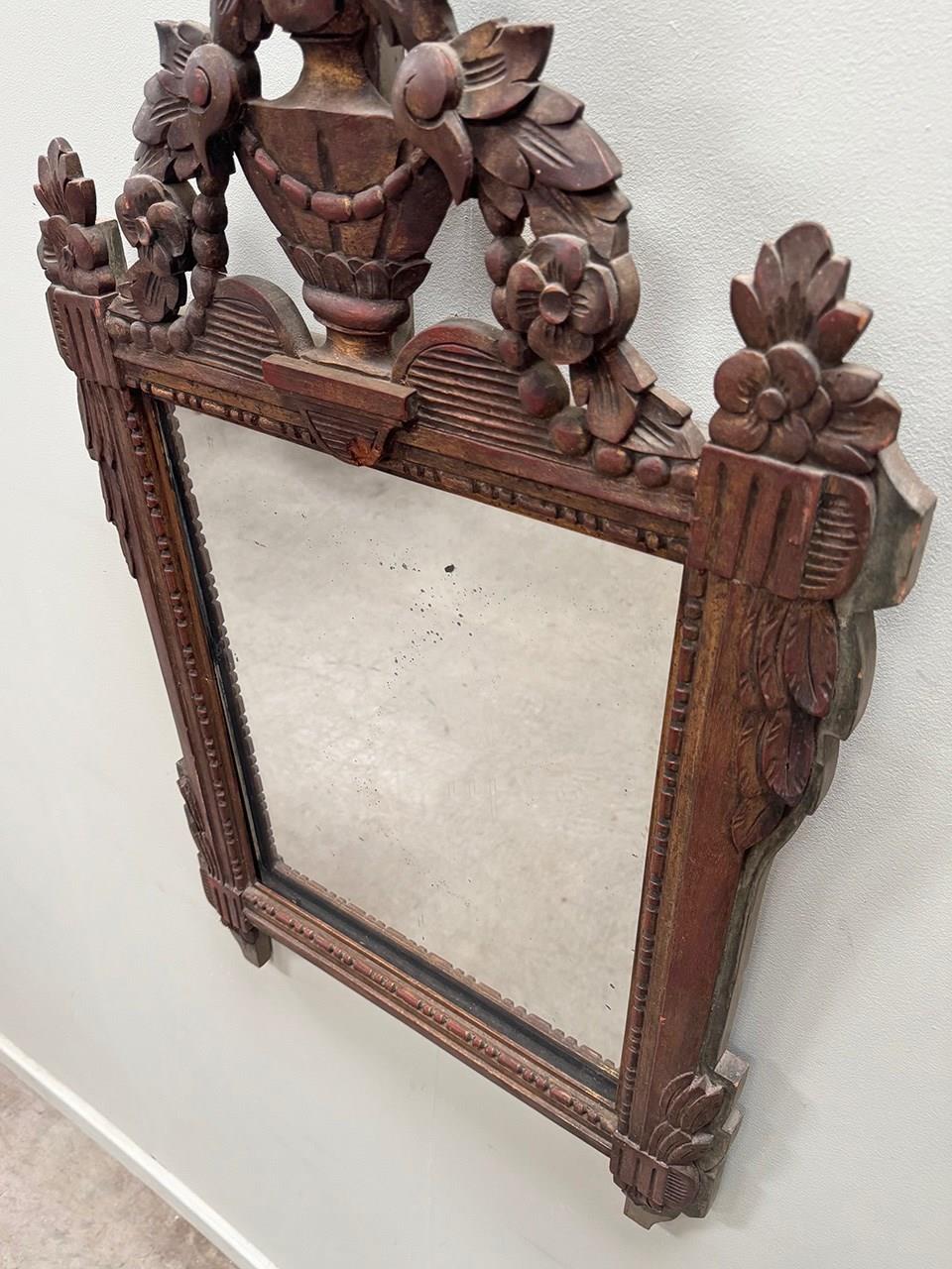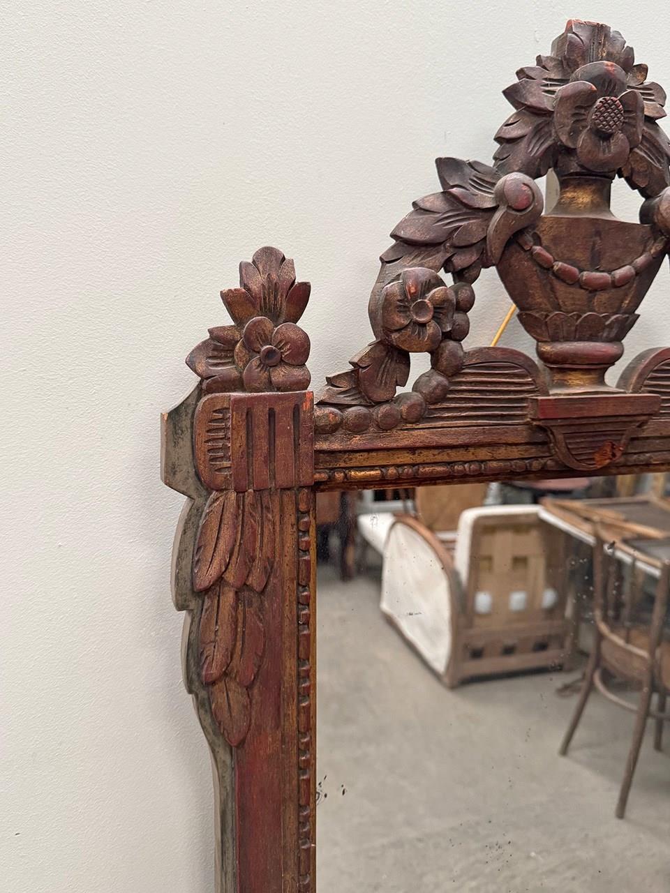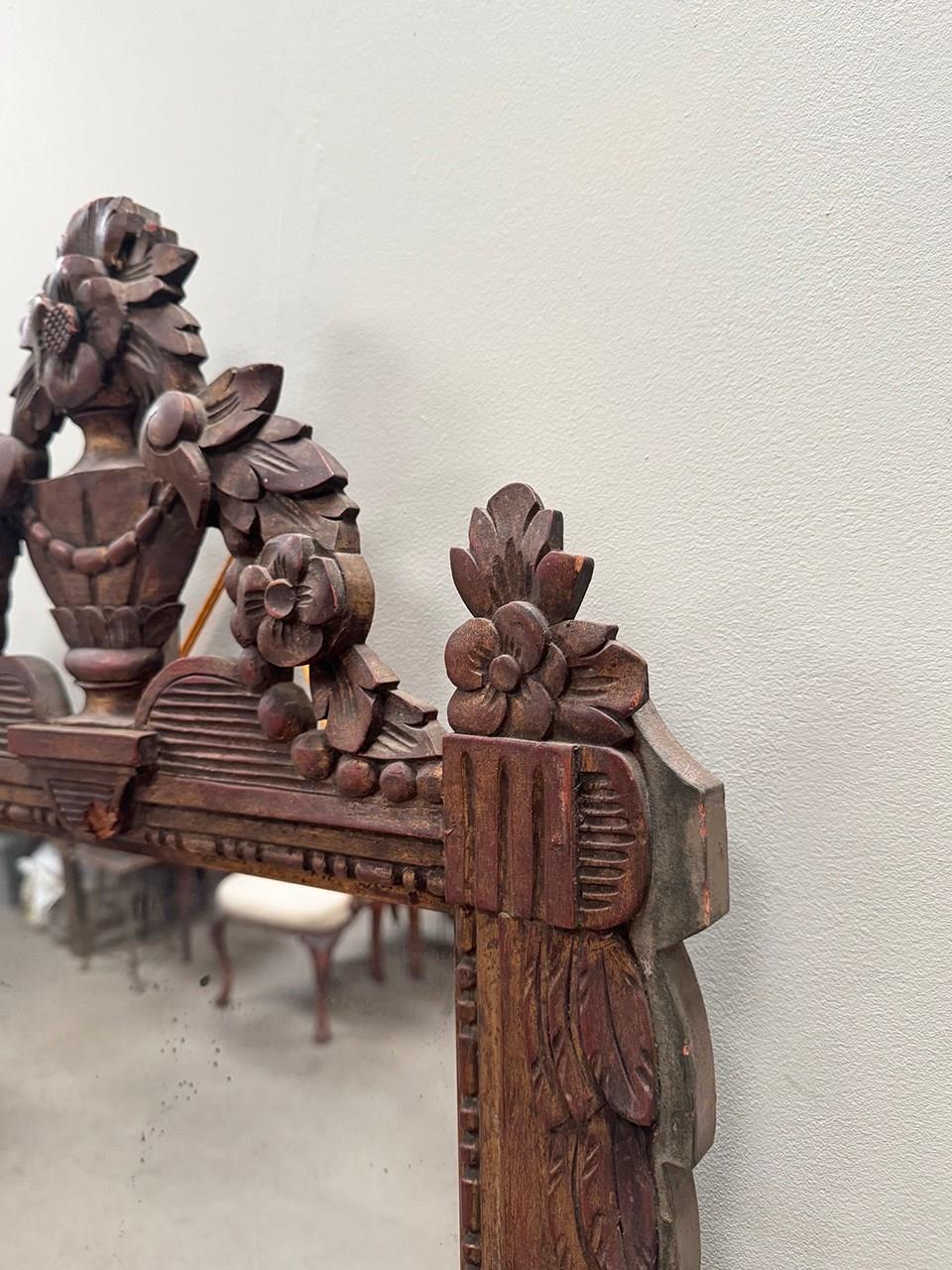 Lovely proportioned carved wood mirror, topped with an ornate urn and floral themed crest.