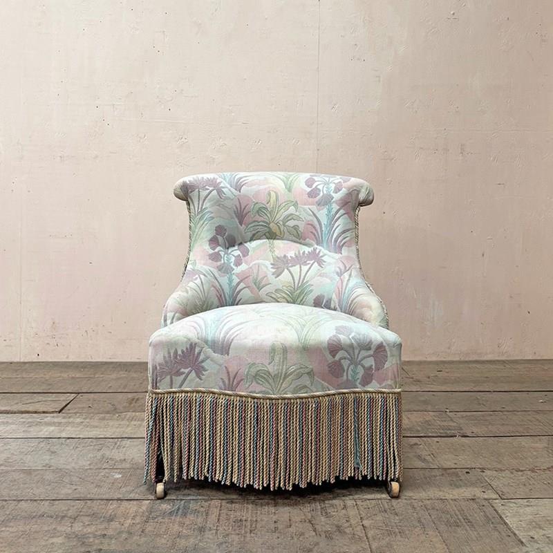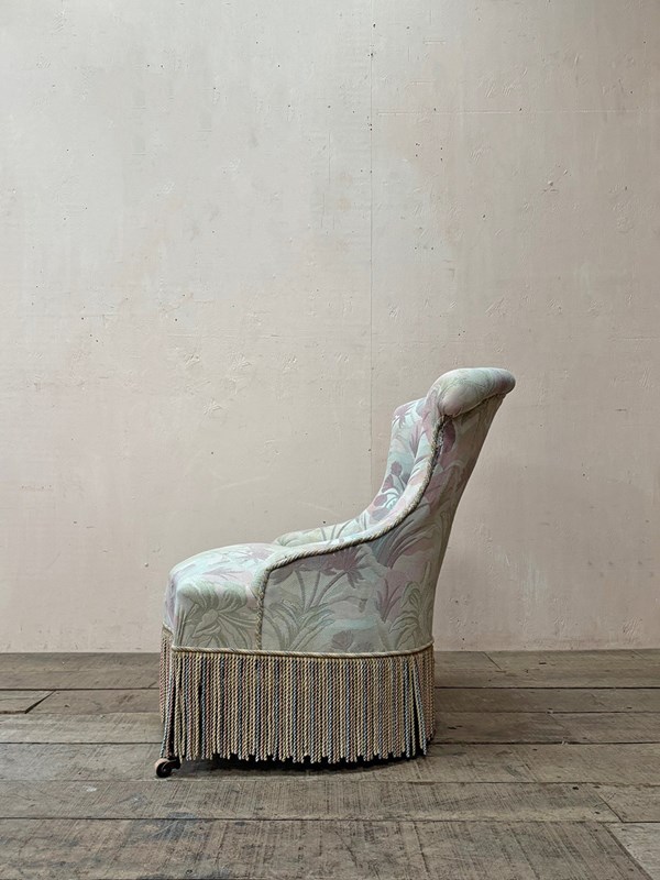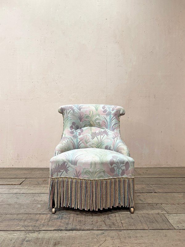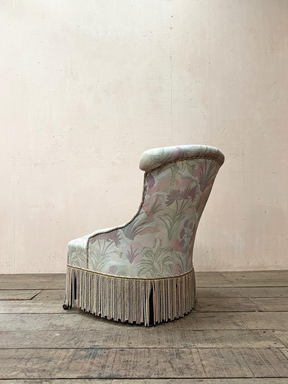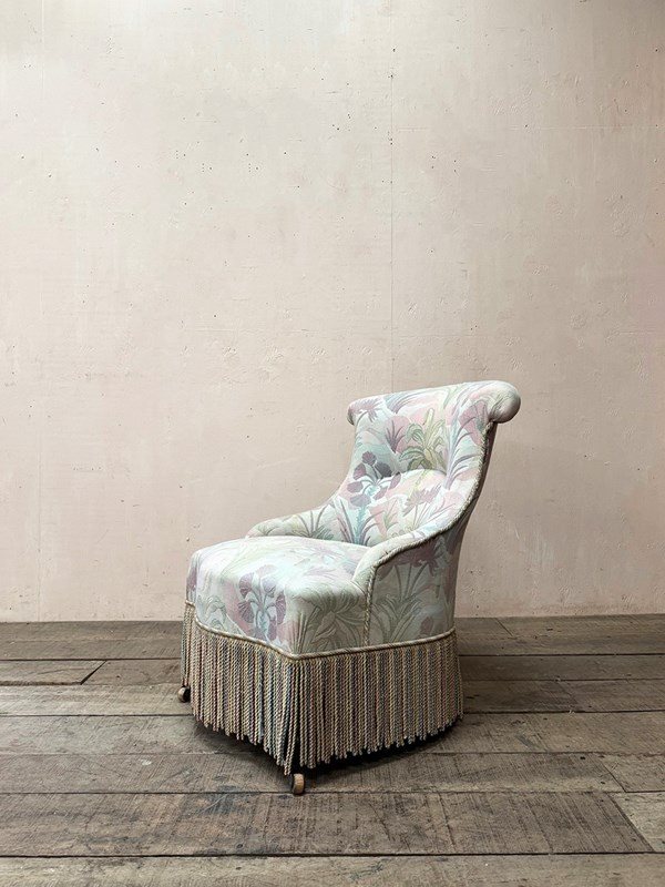 Napoleon III fireside, or nursing chair in its found pastel patterned fabric which is clean and serviceable, and long decorative fringing.
