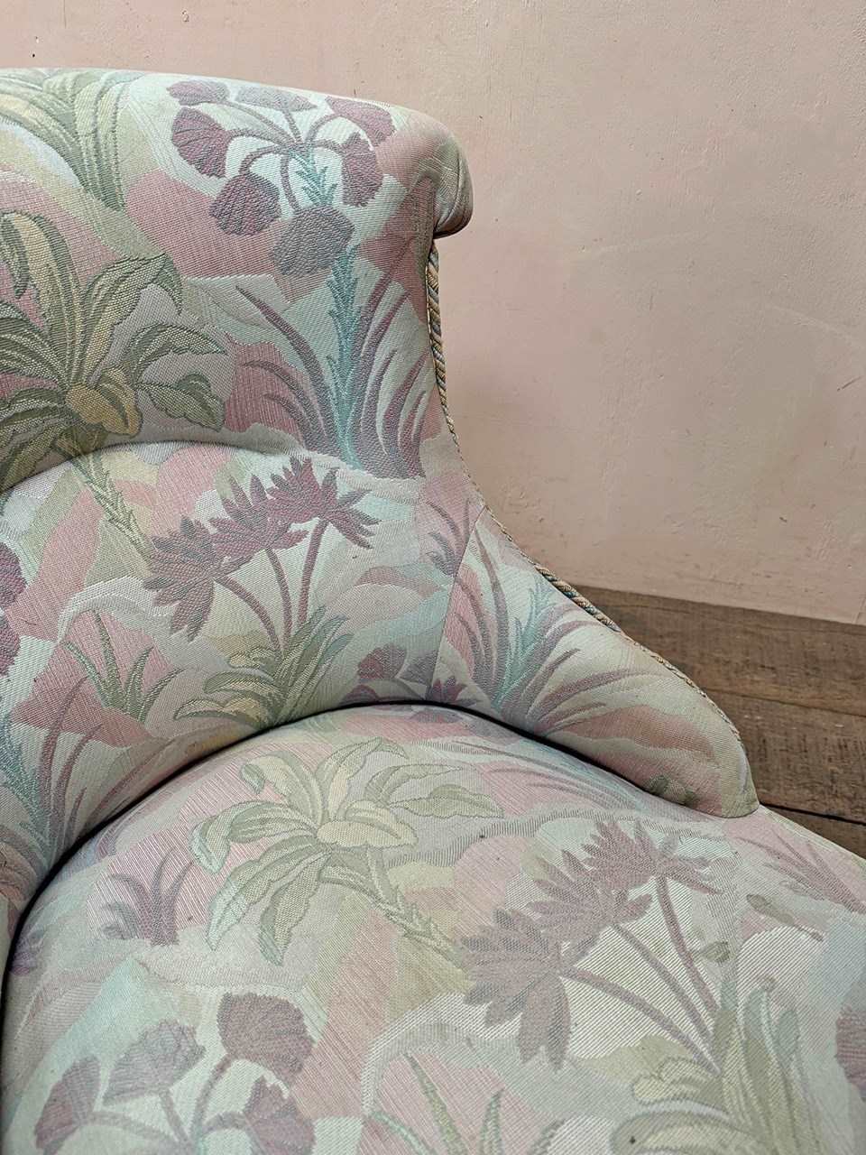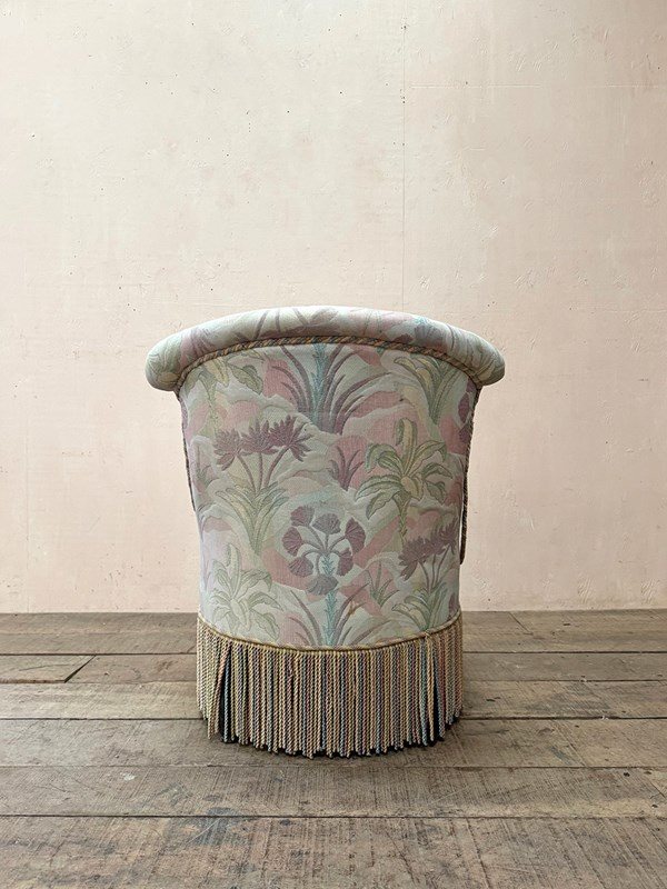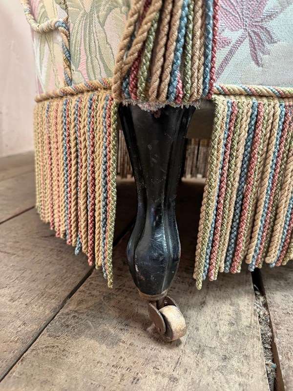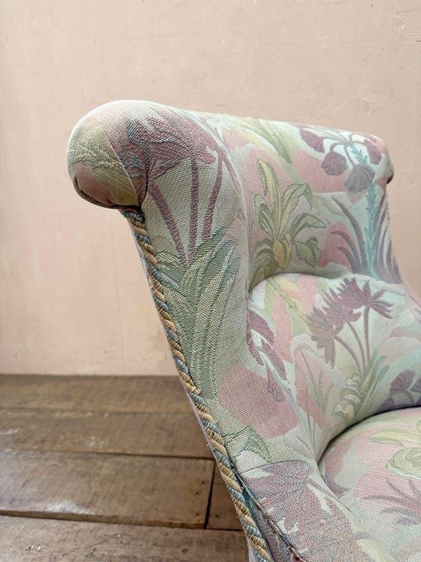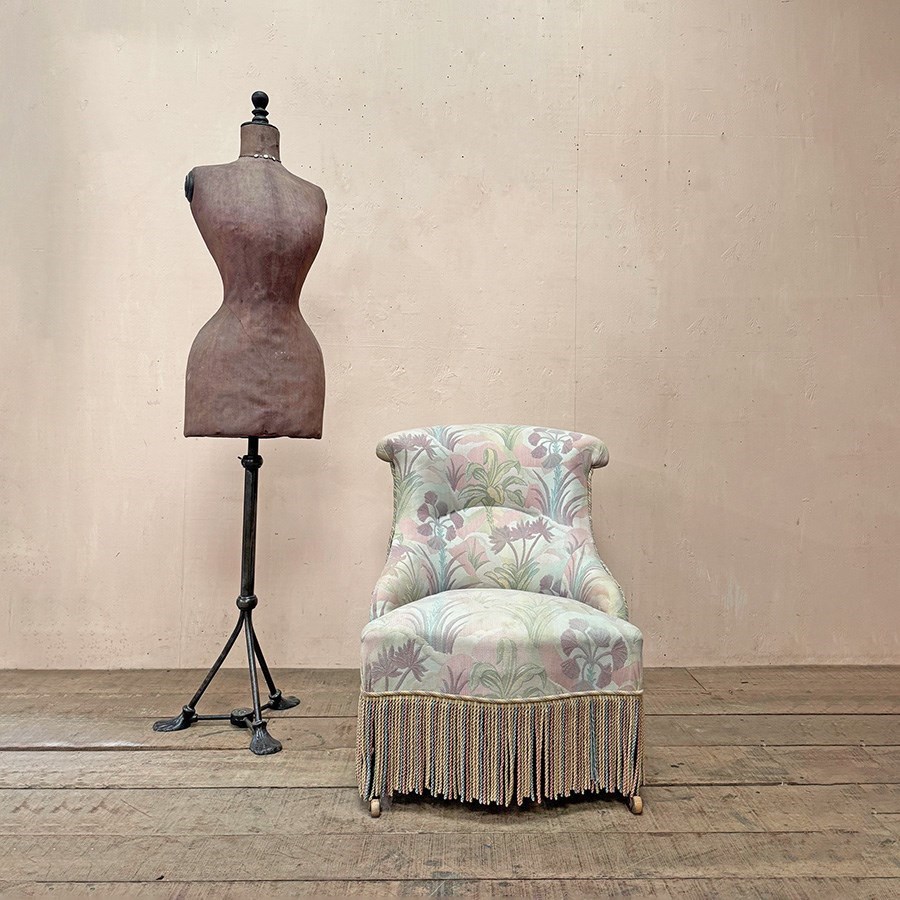 Napoleon III fireside, or nursing chair in its found pastel patterned fabric which is clean and serviceable, and long decorative fringing.