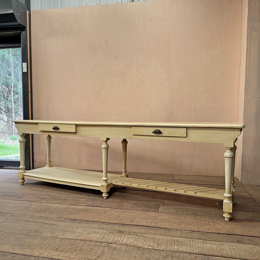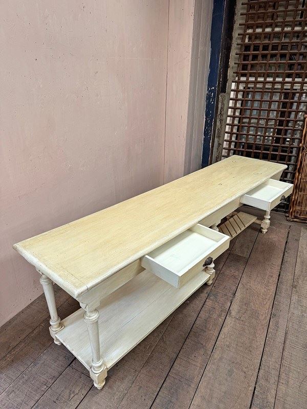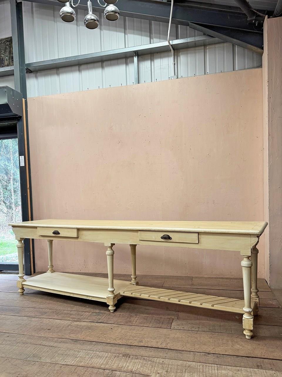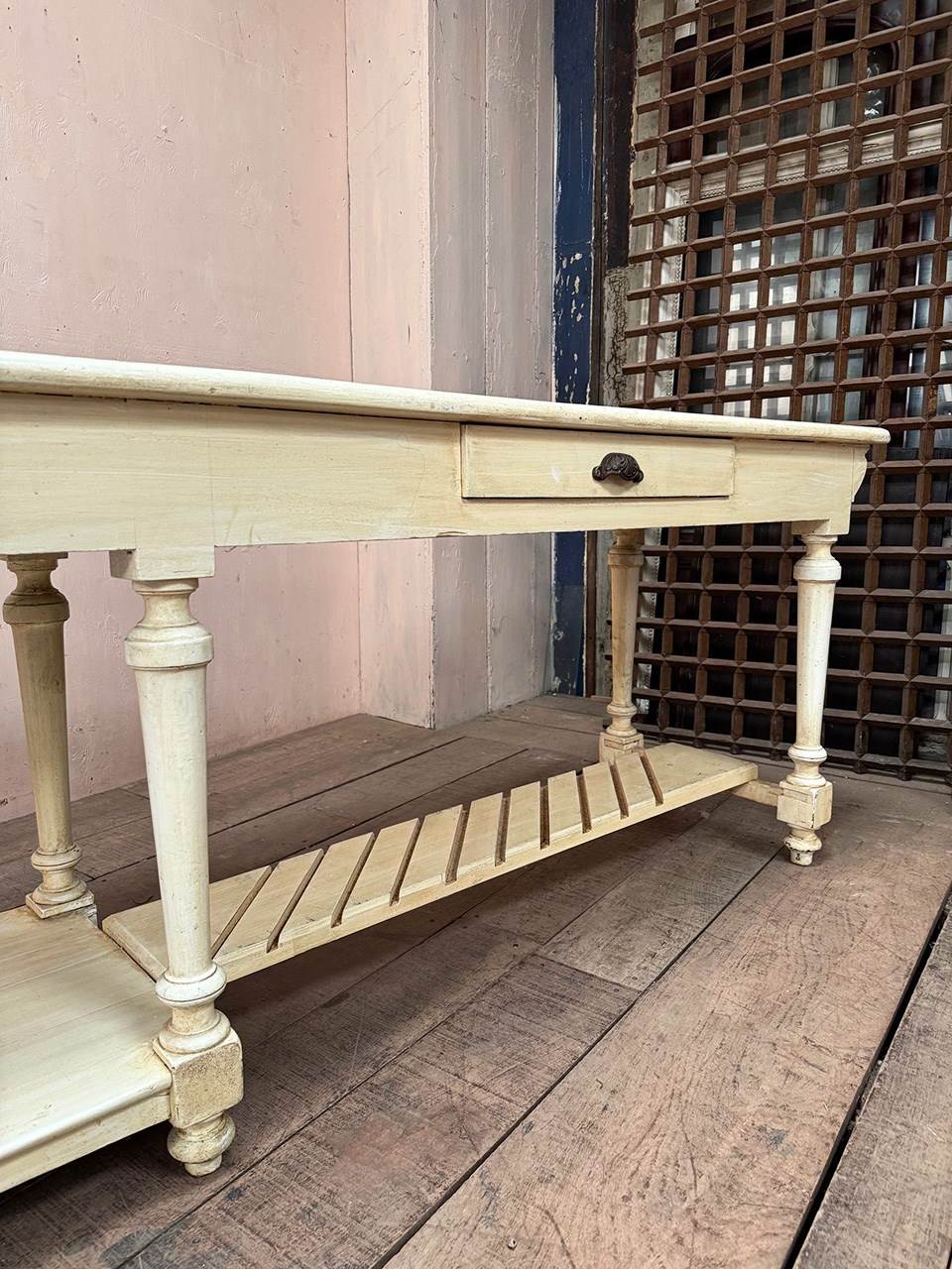 A beautiful cream painted draper's table with two drawers at the front with cup handles.