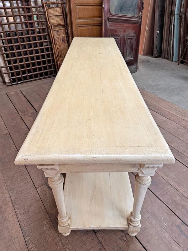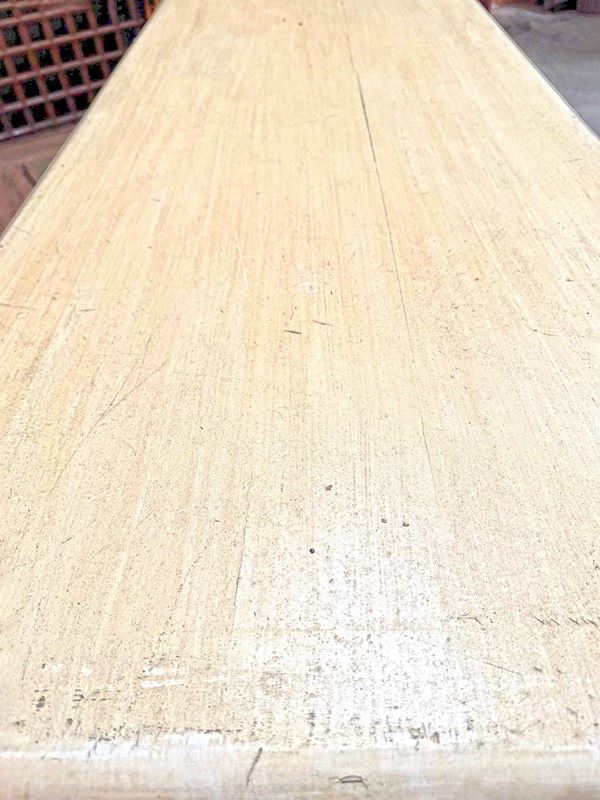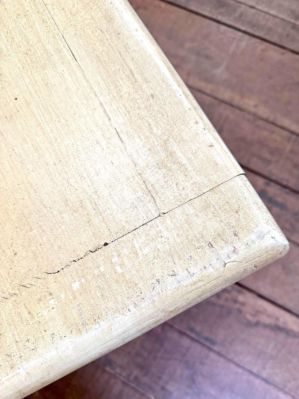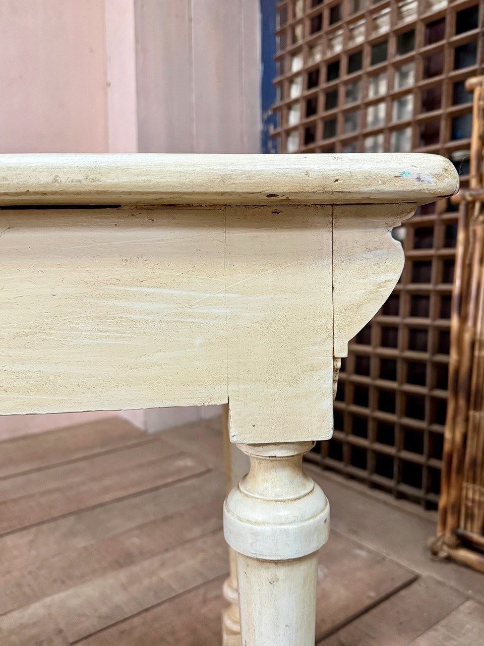 A beautiful cream painted draper's table with two drawers at the front with cup handles.