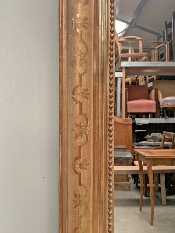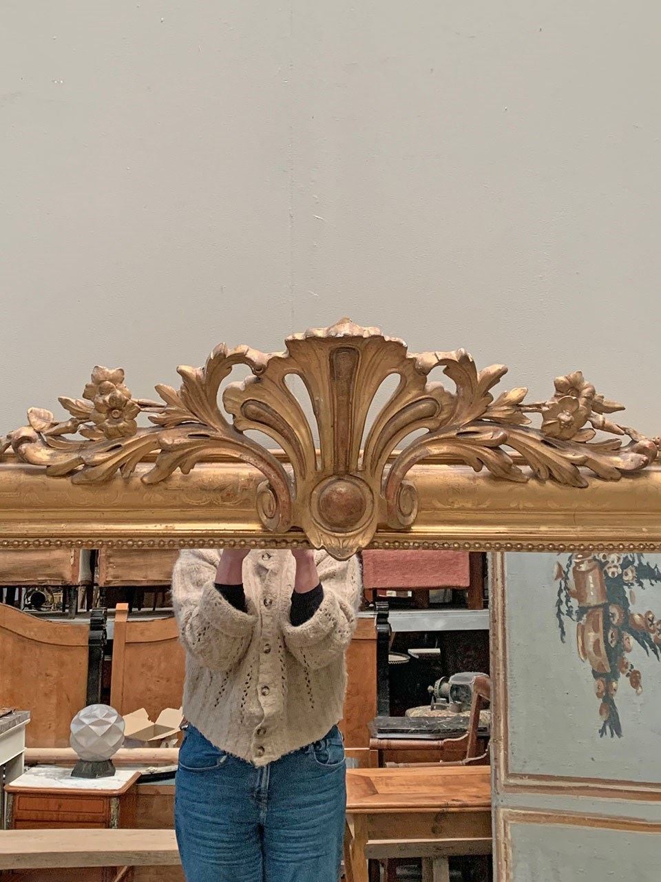 Beautiful mid 1800's mirror. With an ornate crest with red boule showing through the gilding.