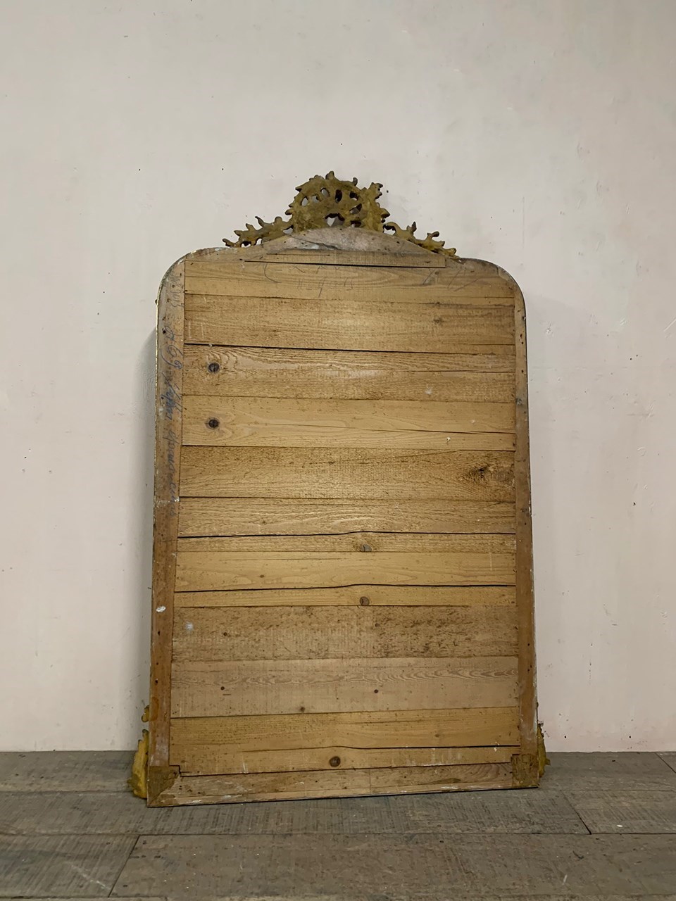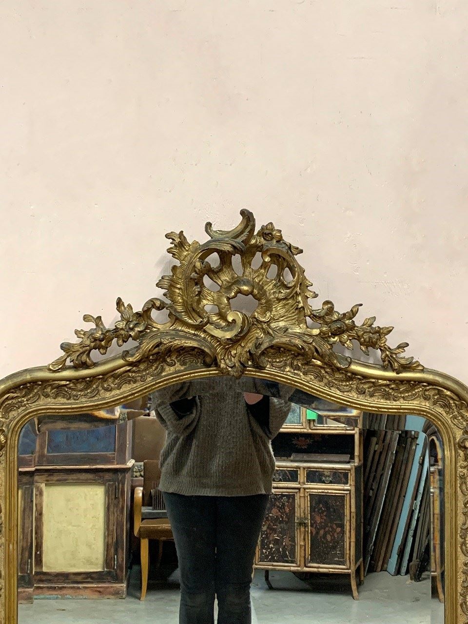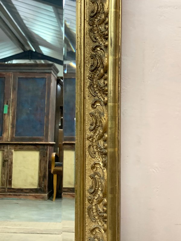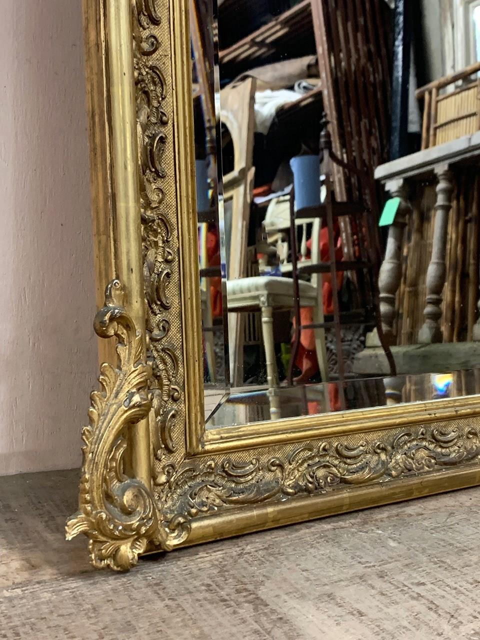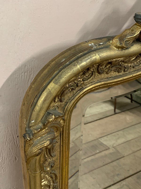 An ornate Louis XV style gilt crested mirror with a bevelled glass. Circa mid 1800s. We have fitted brackets to the sides for easy wall hanging. Sourced from a townhouse in Burgundy.