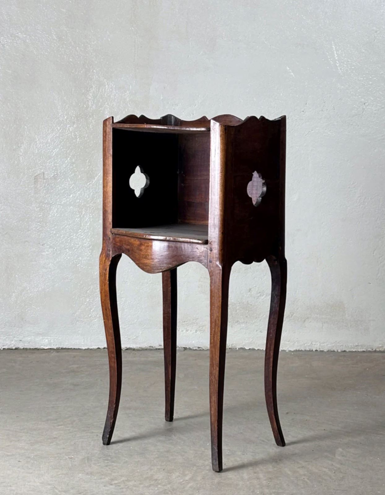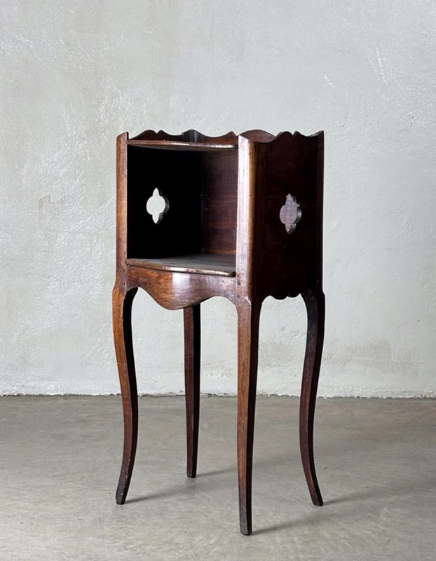 Bedside cabinet with cut out side details, and open front.