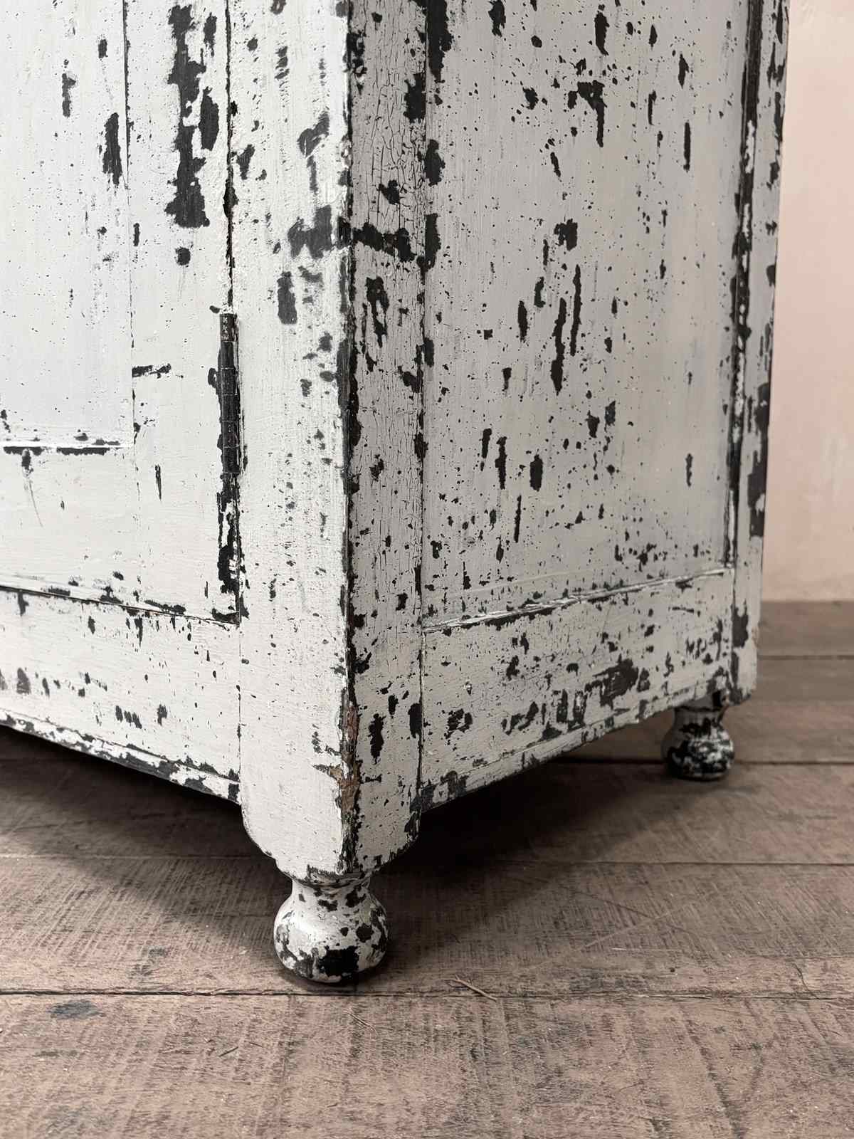 We have carefully dry scraped back the layers of paint to reveal its first coat, with multiple chips back to the dark stained ground.