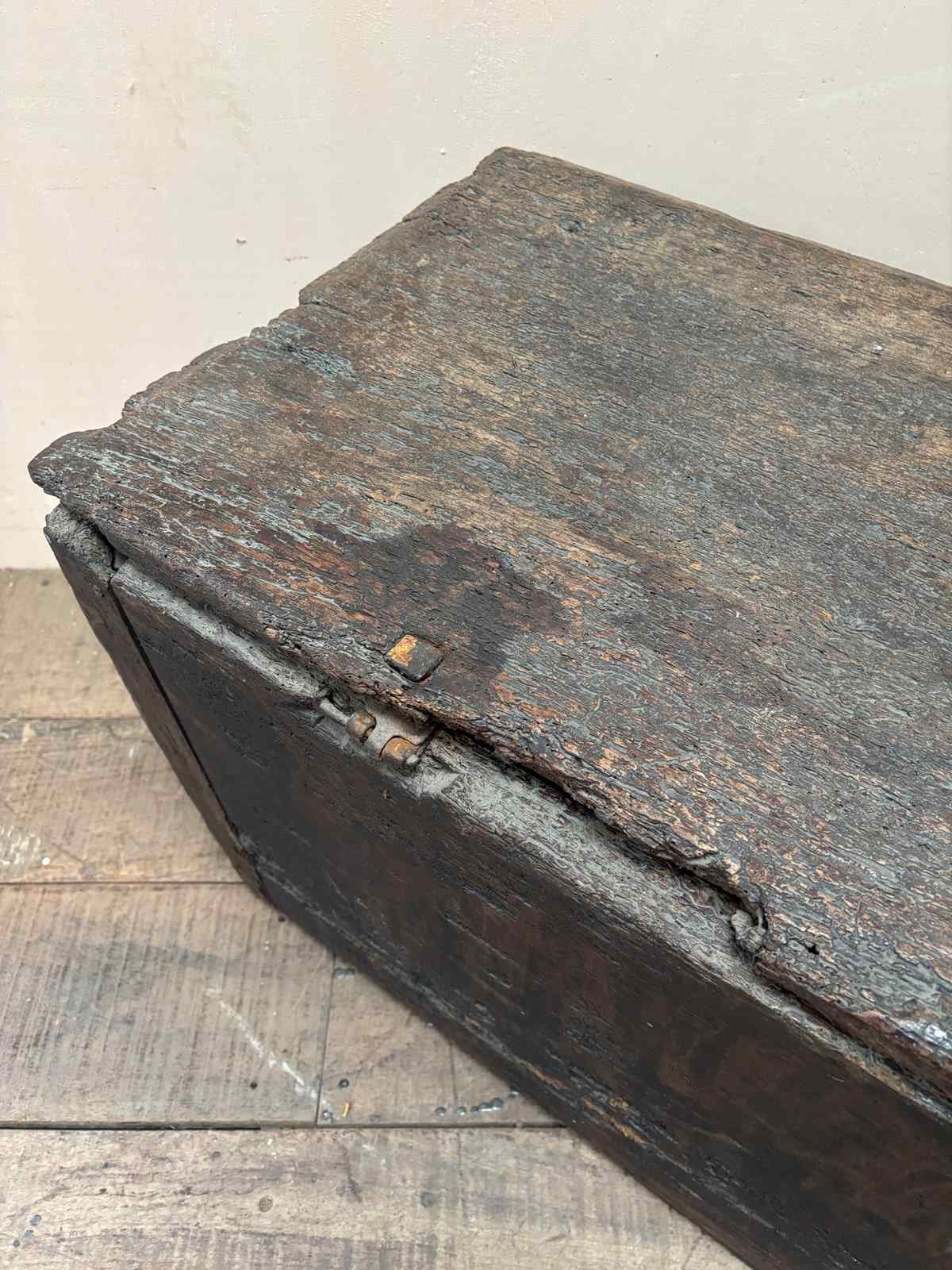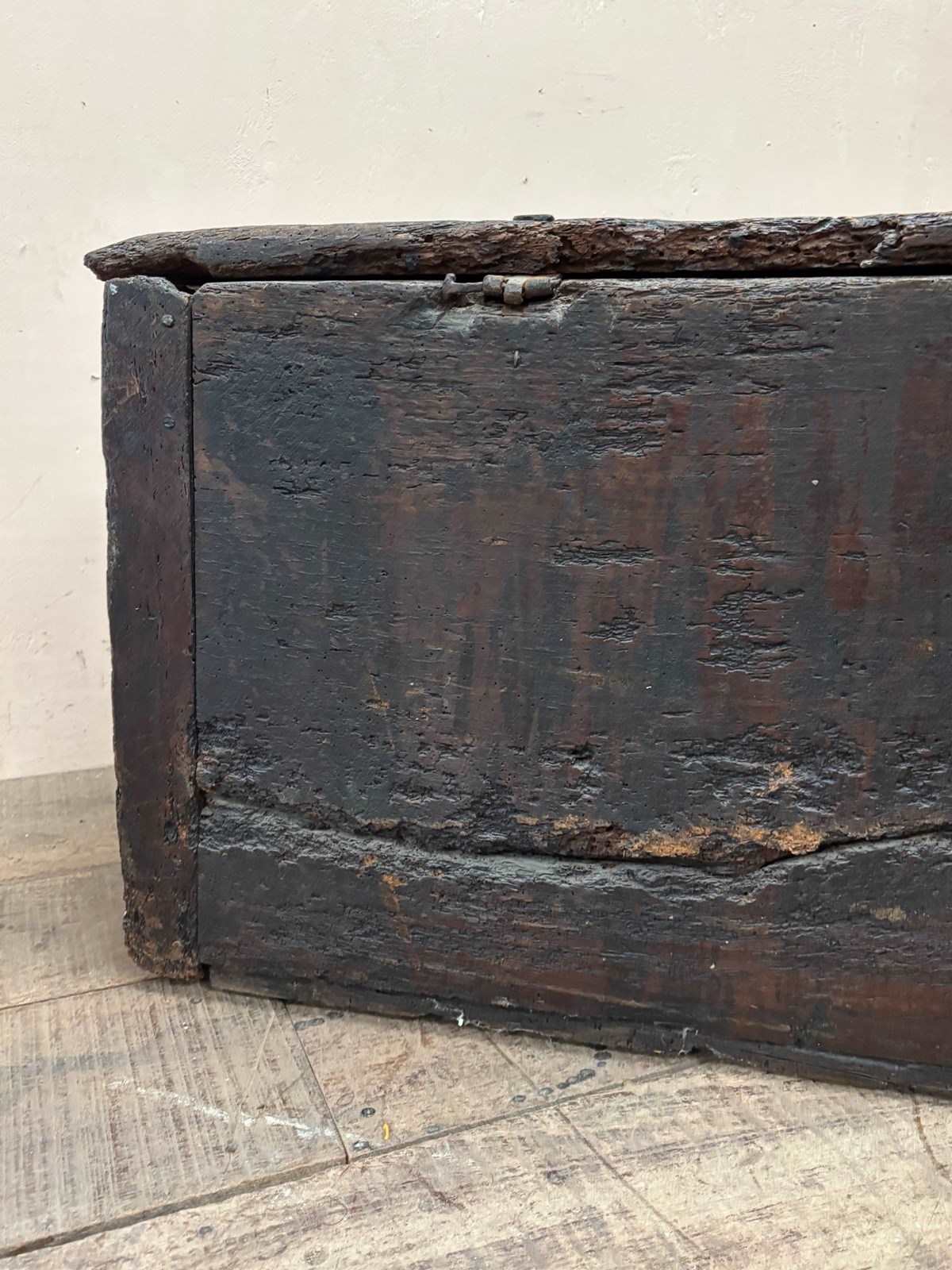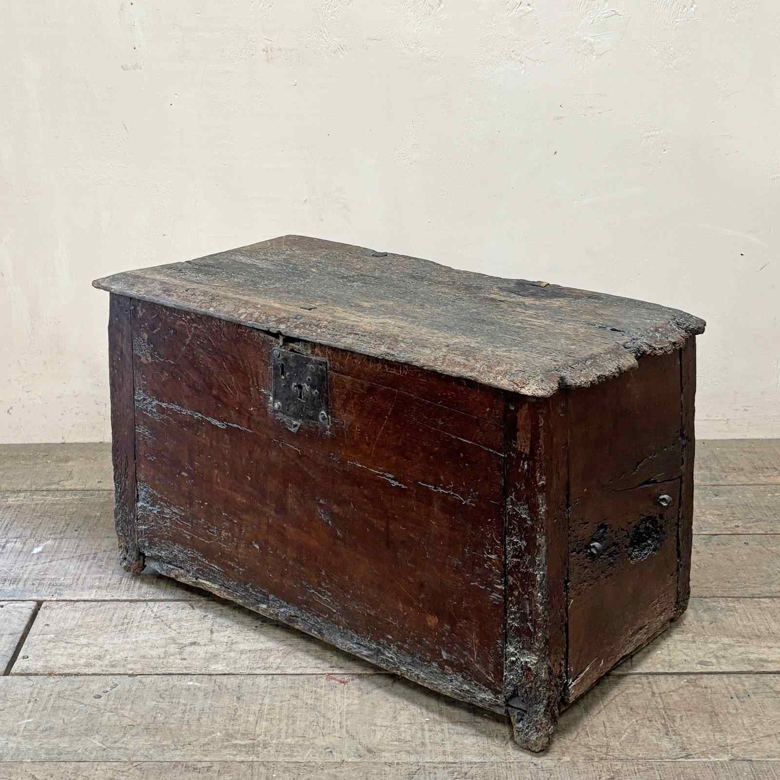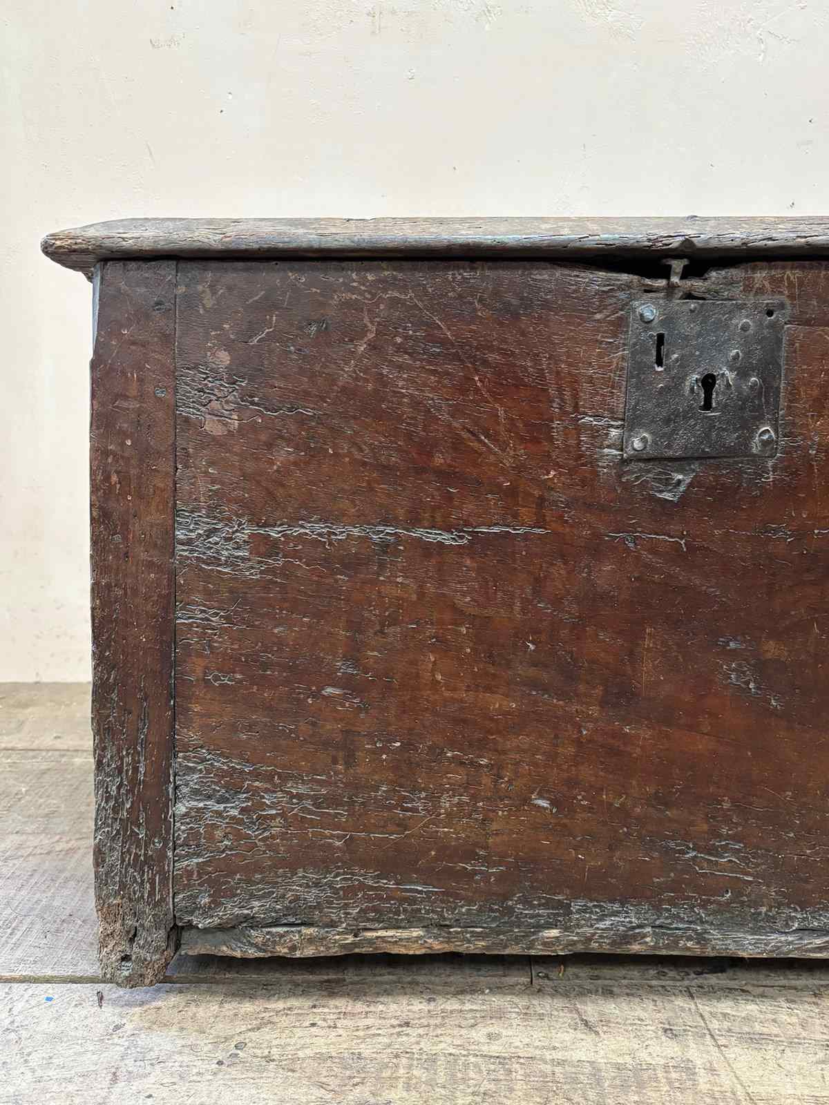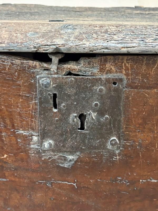 17th, possibly 16th, century walnut Pyrenean trunk which is very worn but still heavy and useable.