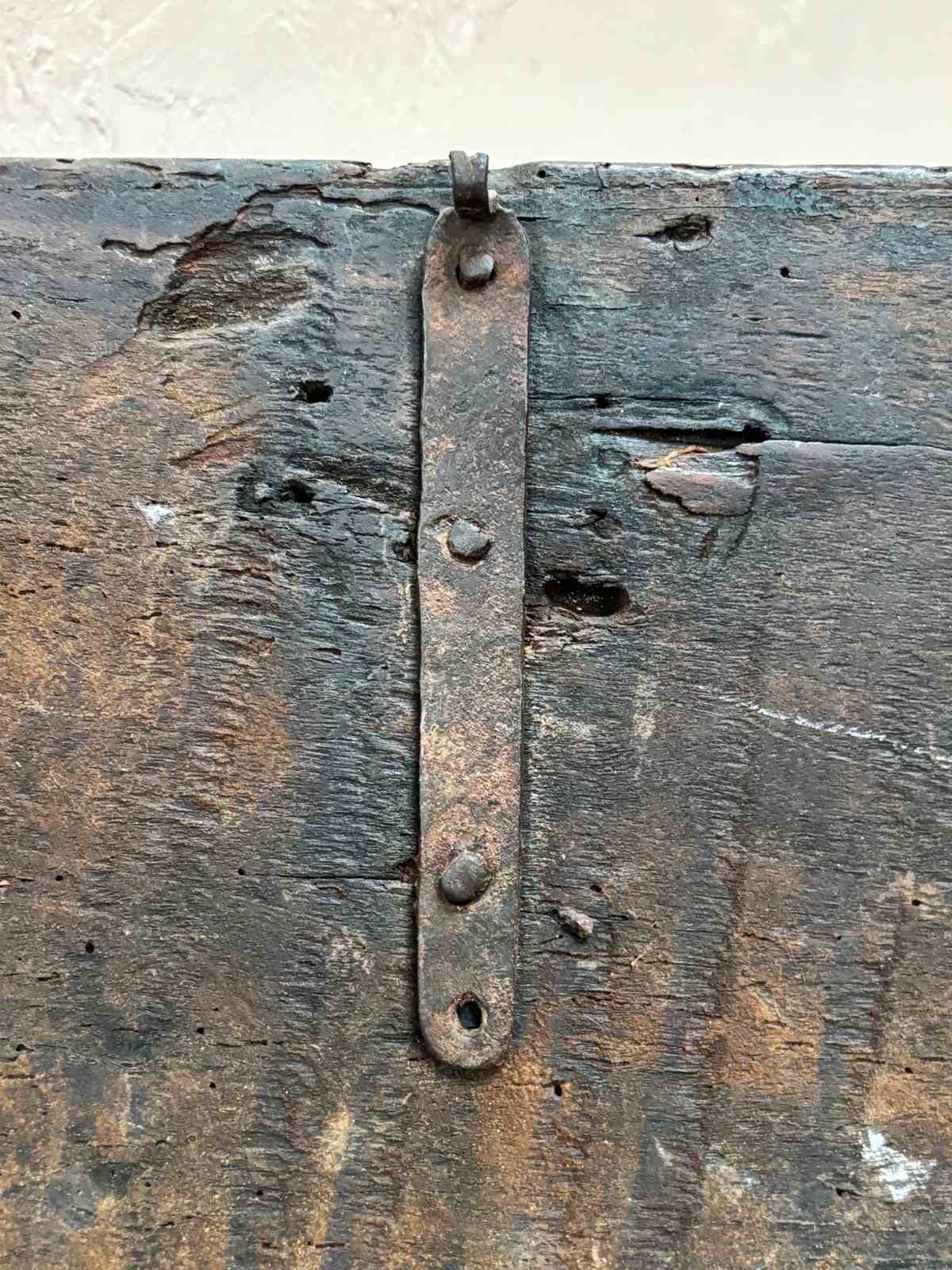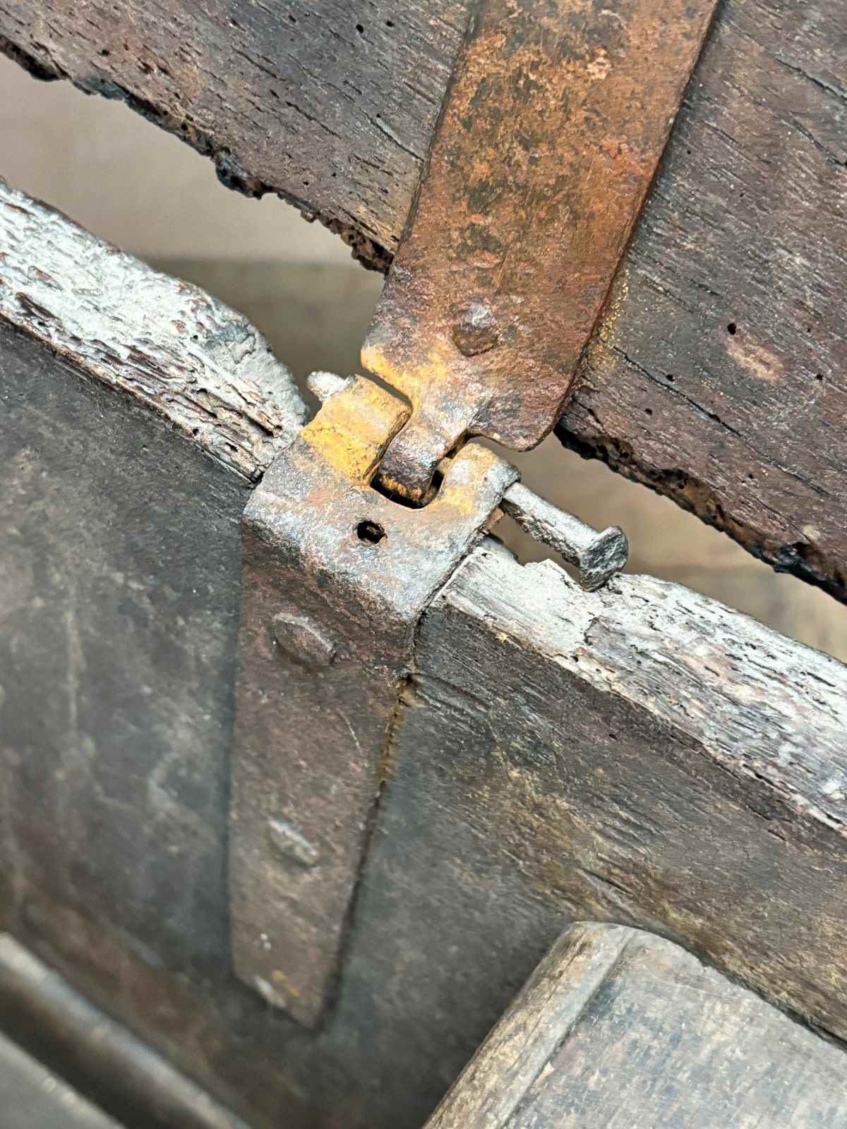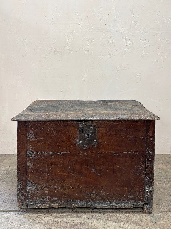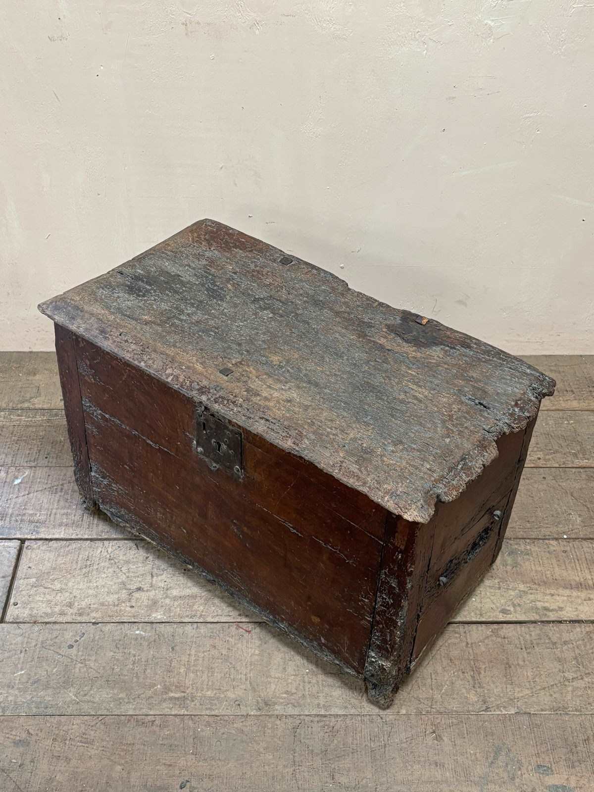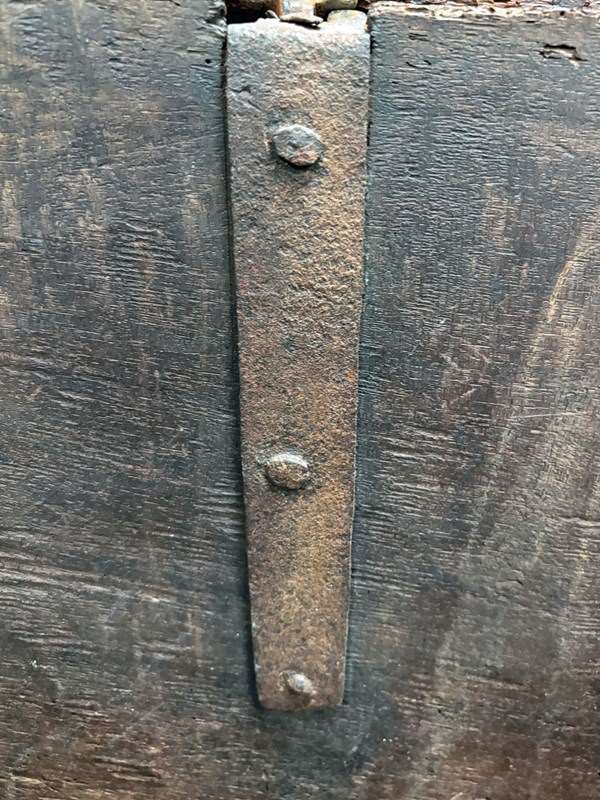 17th, possibly 16th, century walnut Pyrenean trunk which is very worn but still heavy and useable.