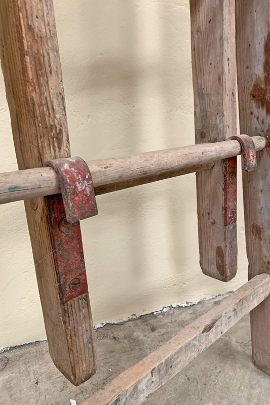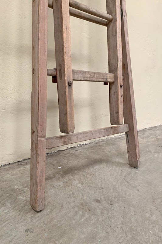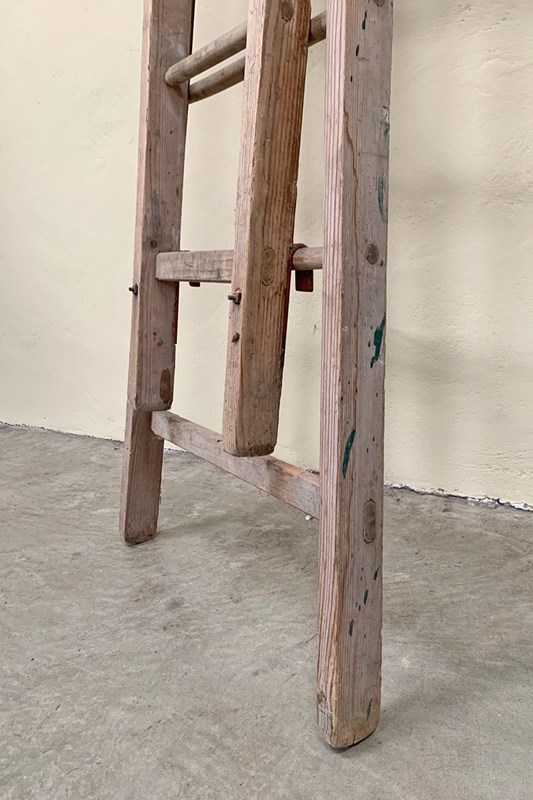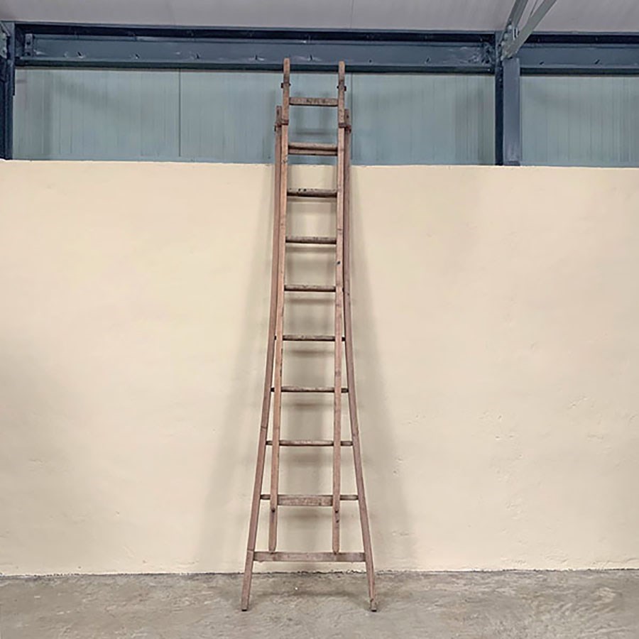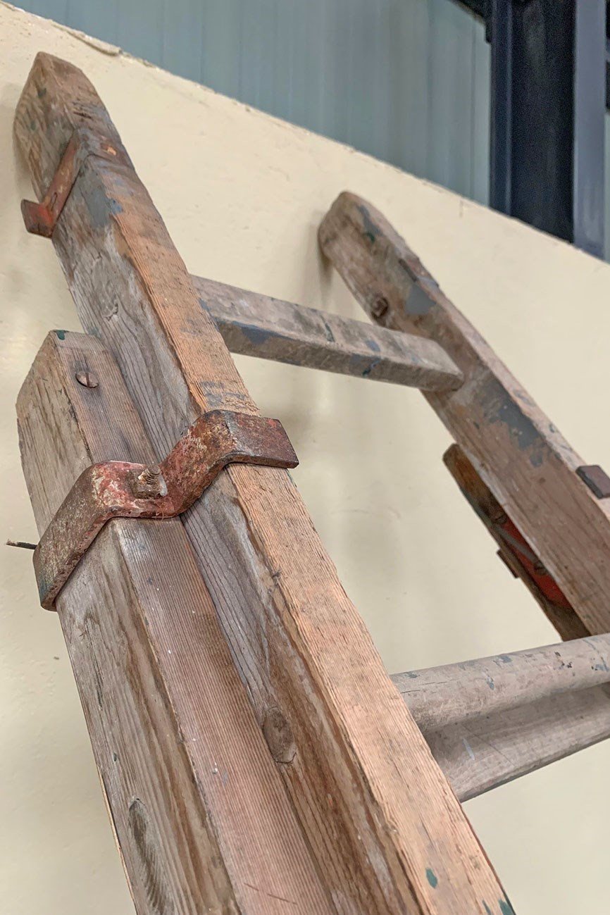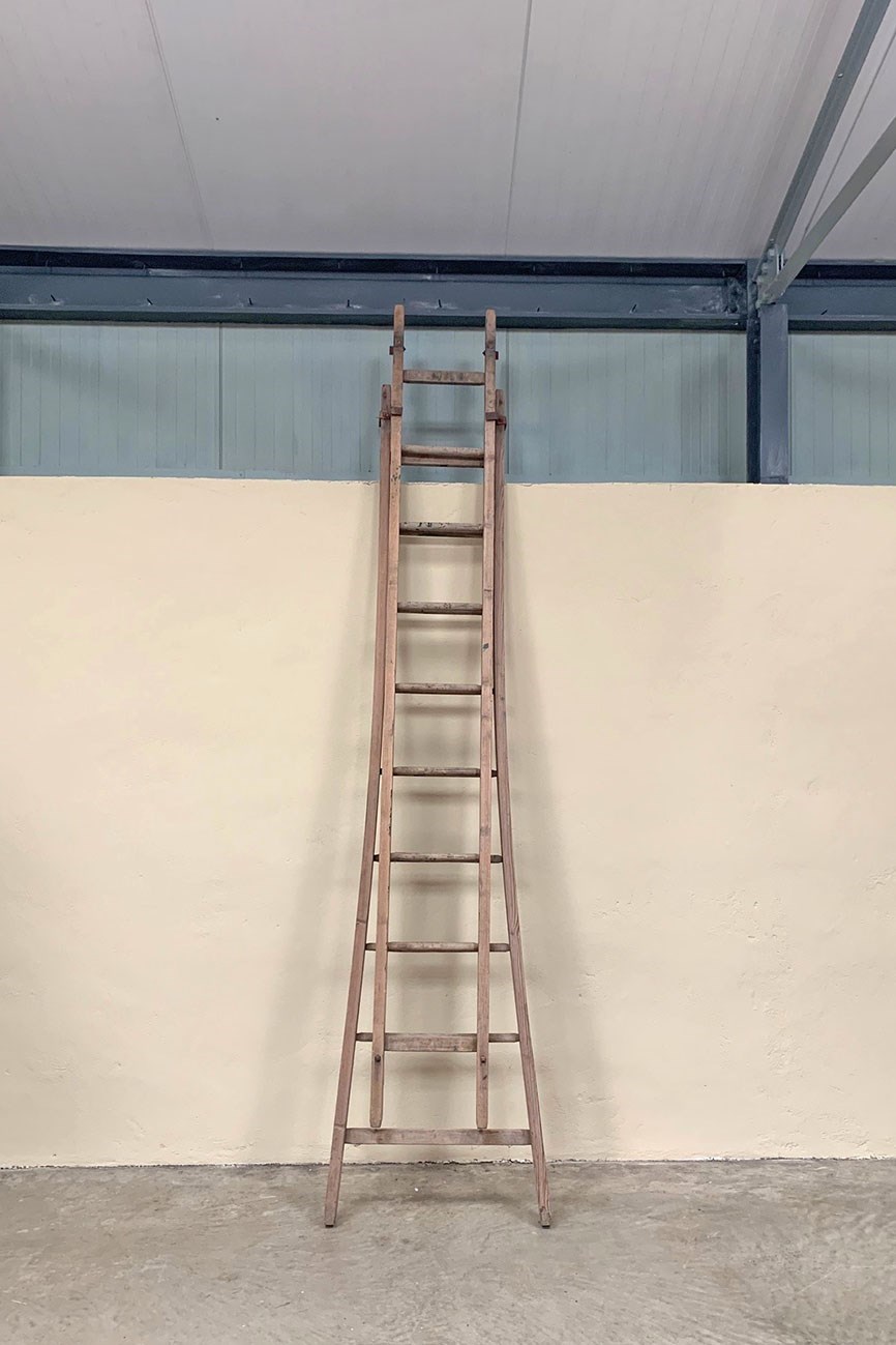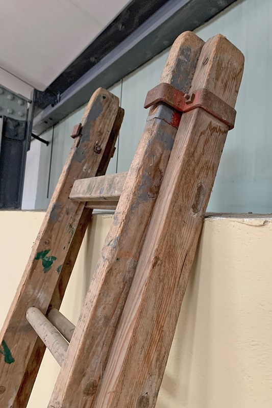The legs of the main ladder are splayed, and both ladders fit together with heavy set metal hooks.
