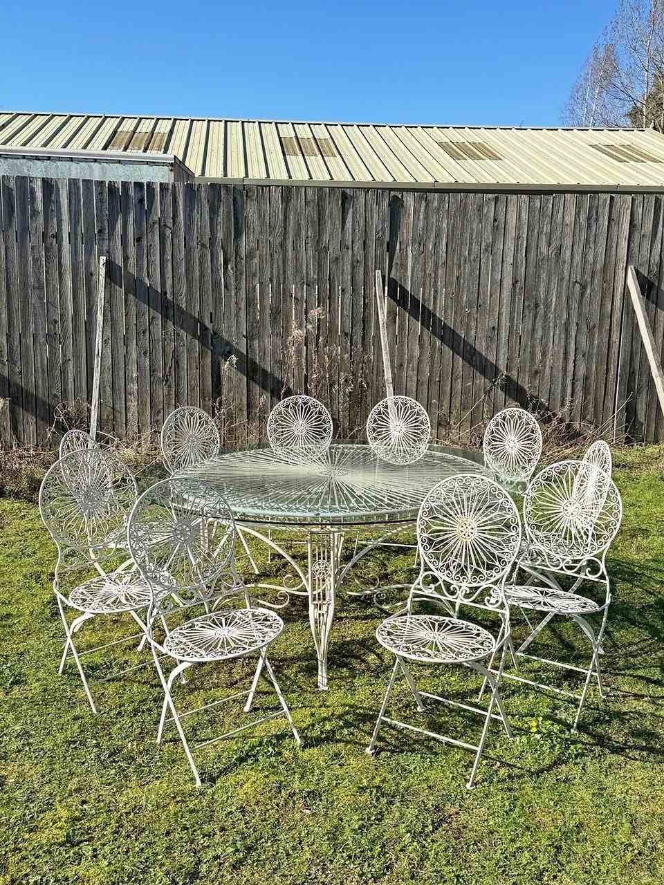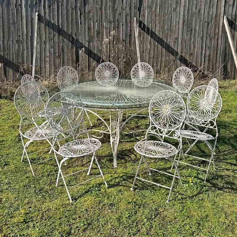 A very large 1960/70s circular garden table and a set of 10 folding chairs.