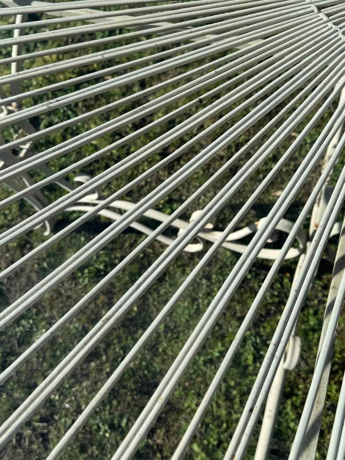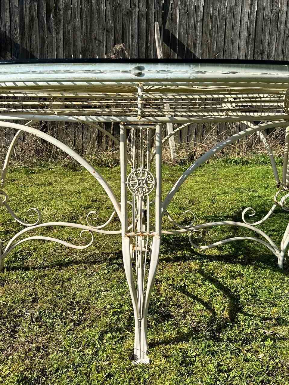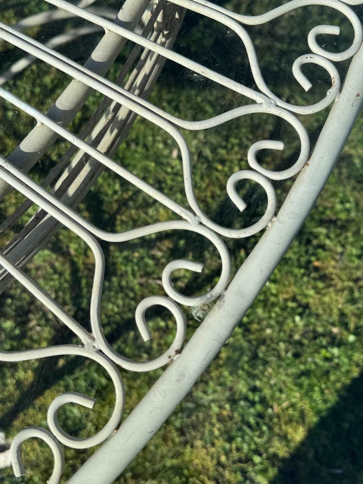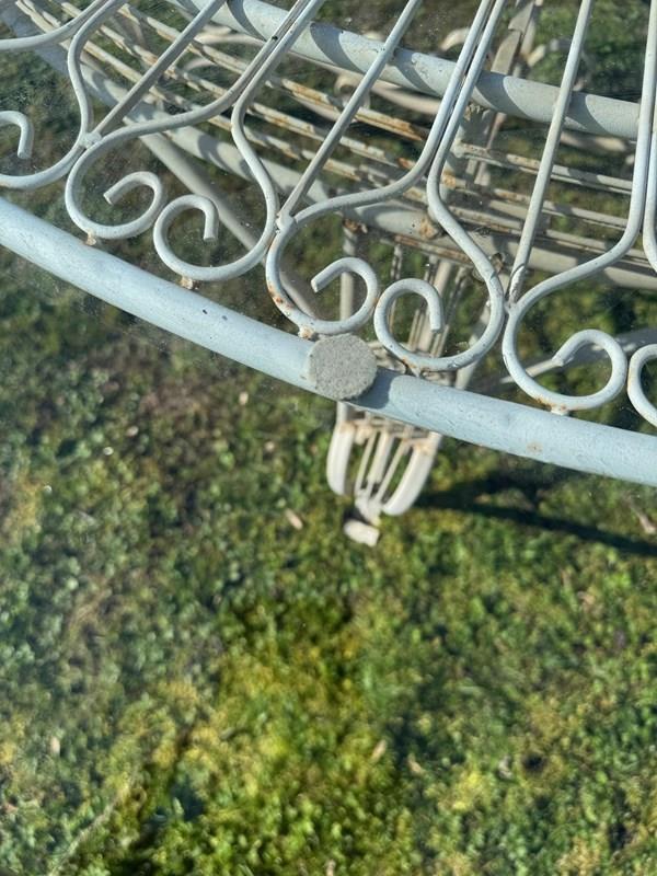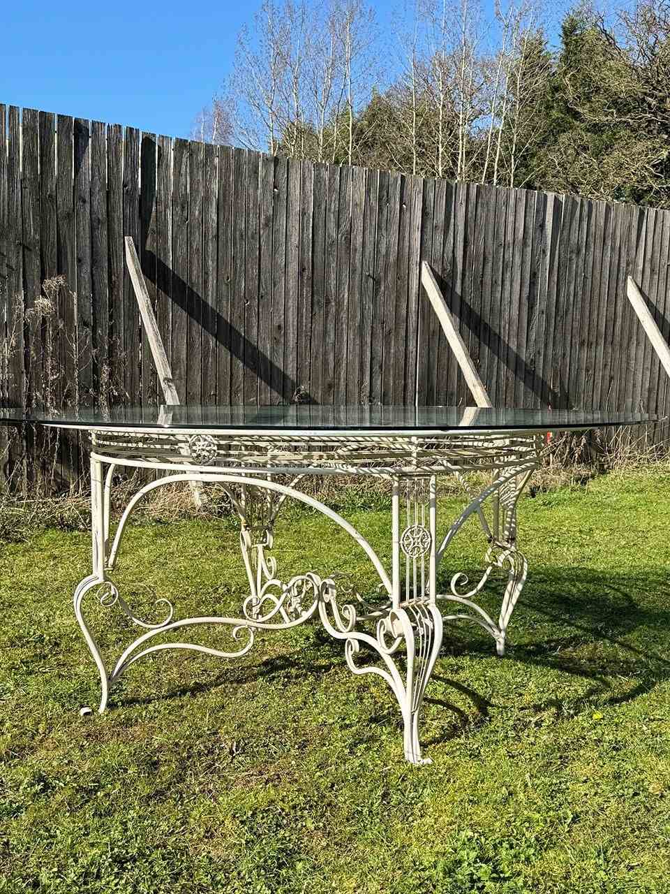 The heavy and thick glass top rests on top of the scrolled metalwork base.