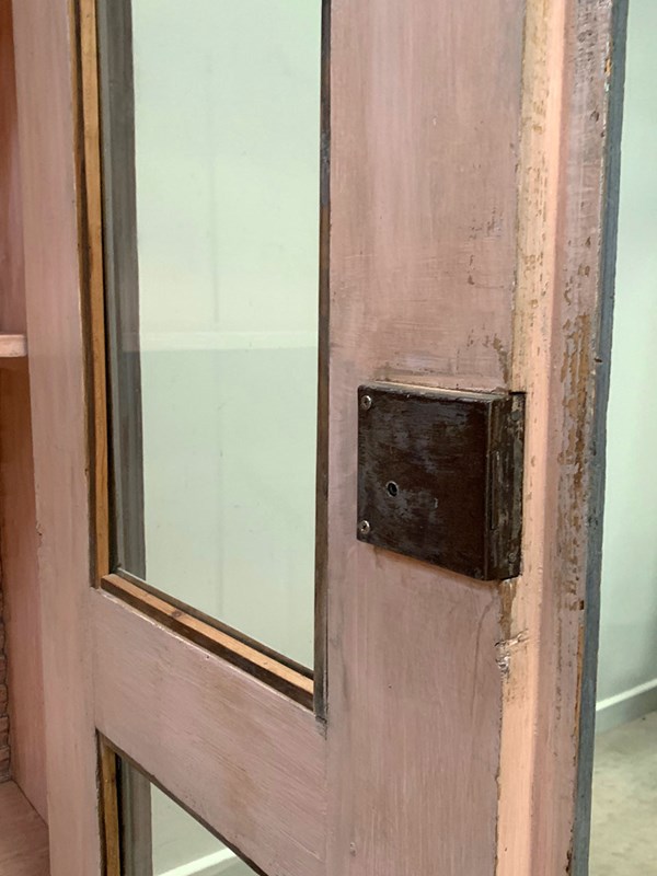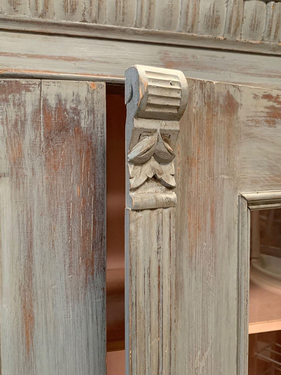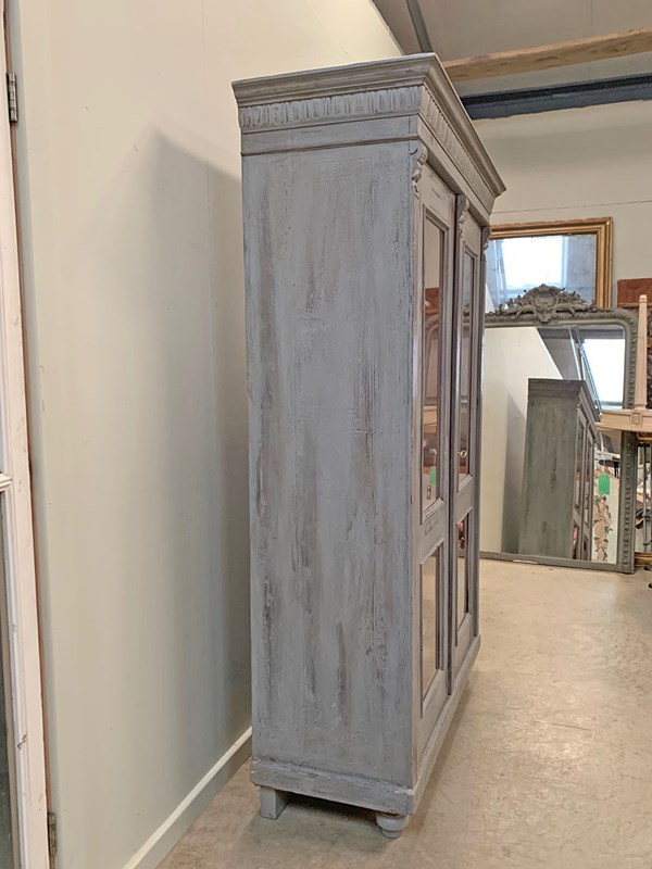 Glazed storage cupboard in a bluey/grey paint with a distressed finish.