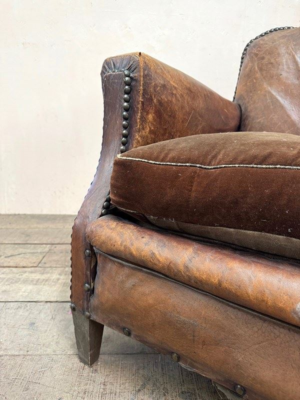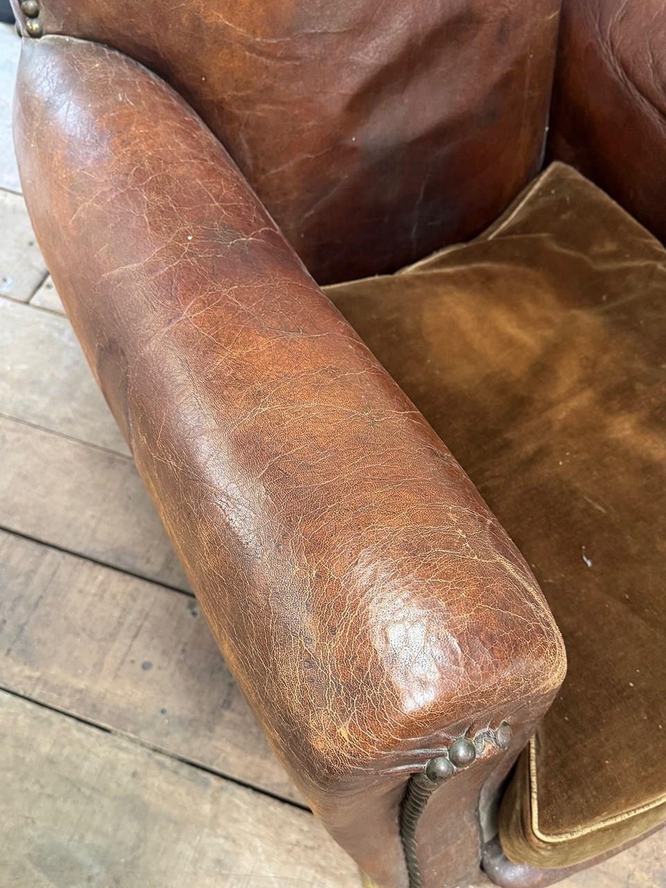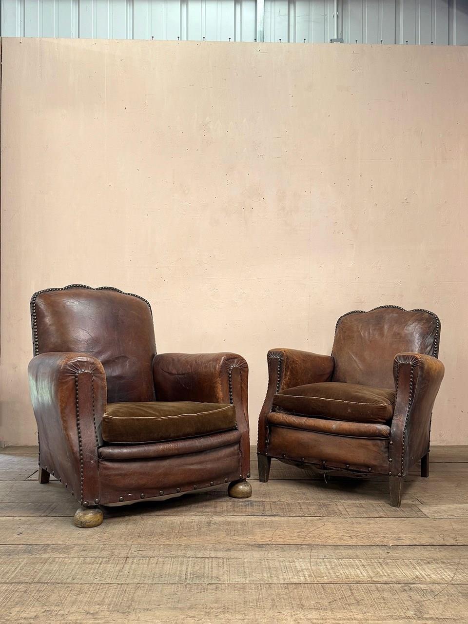 A near 'his and her' pair of leather studded armchairs with loose velvet seat cushions.