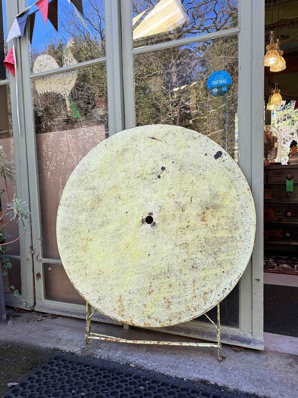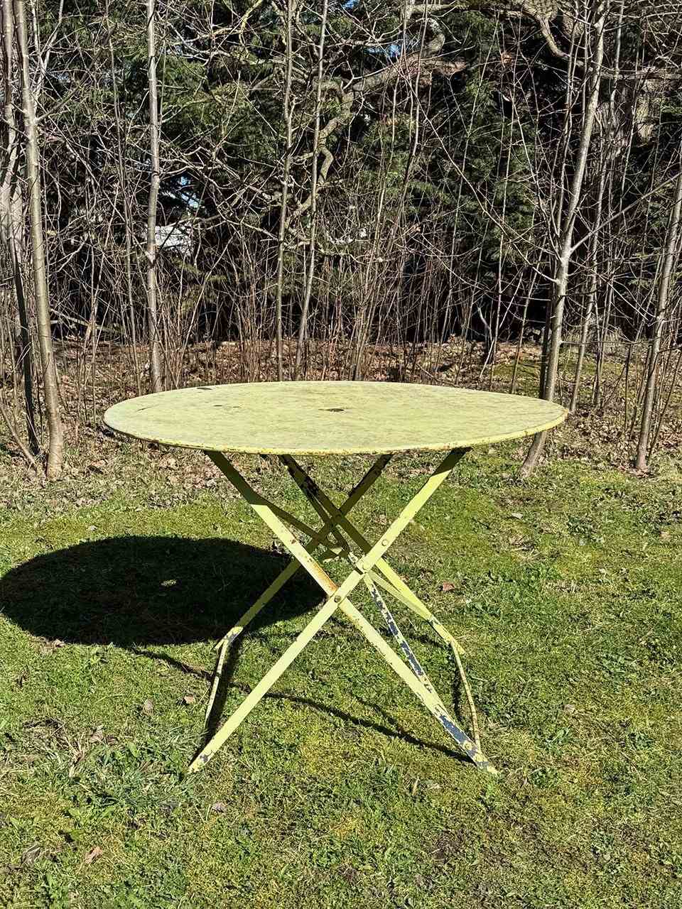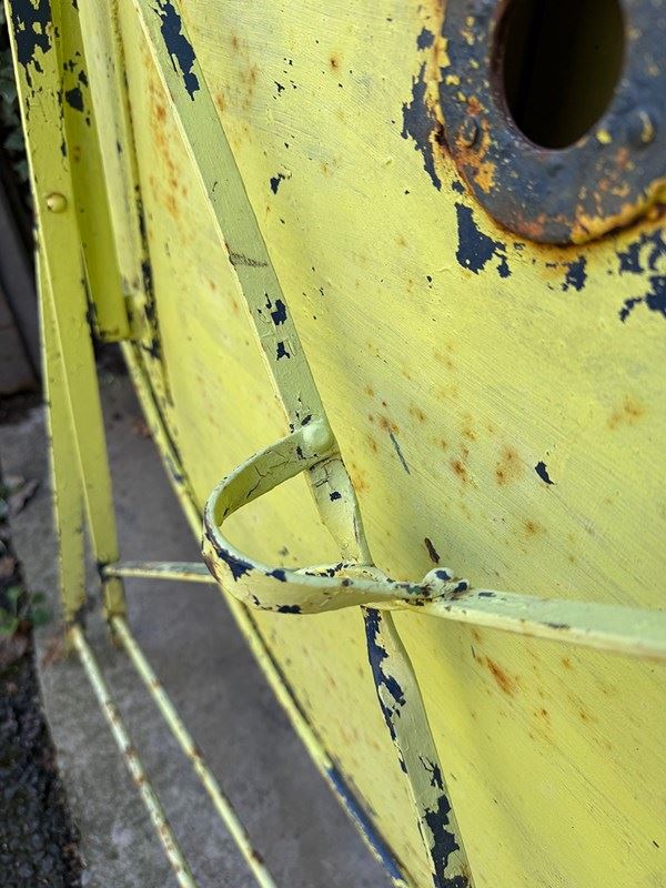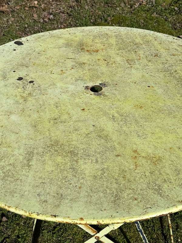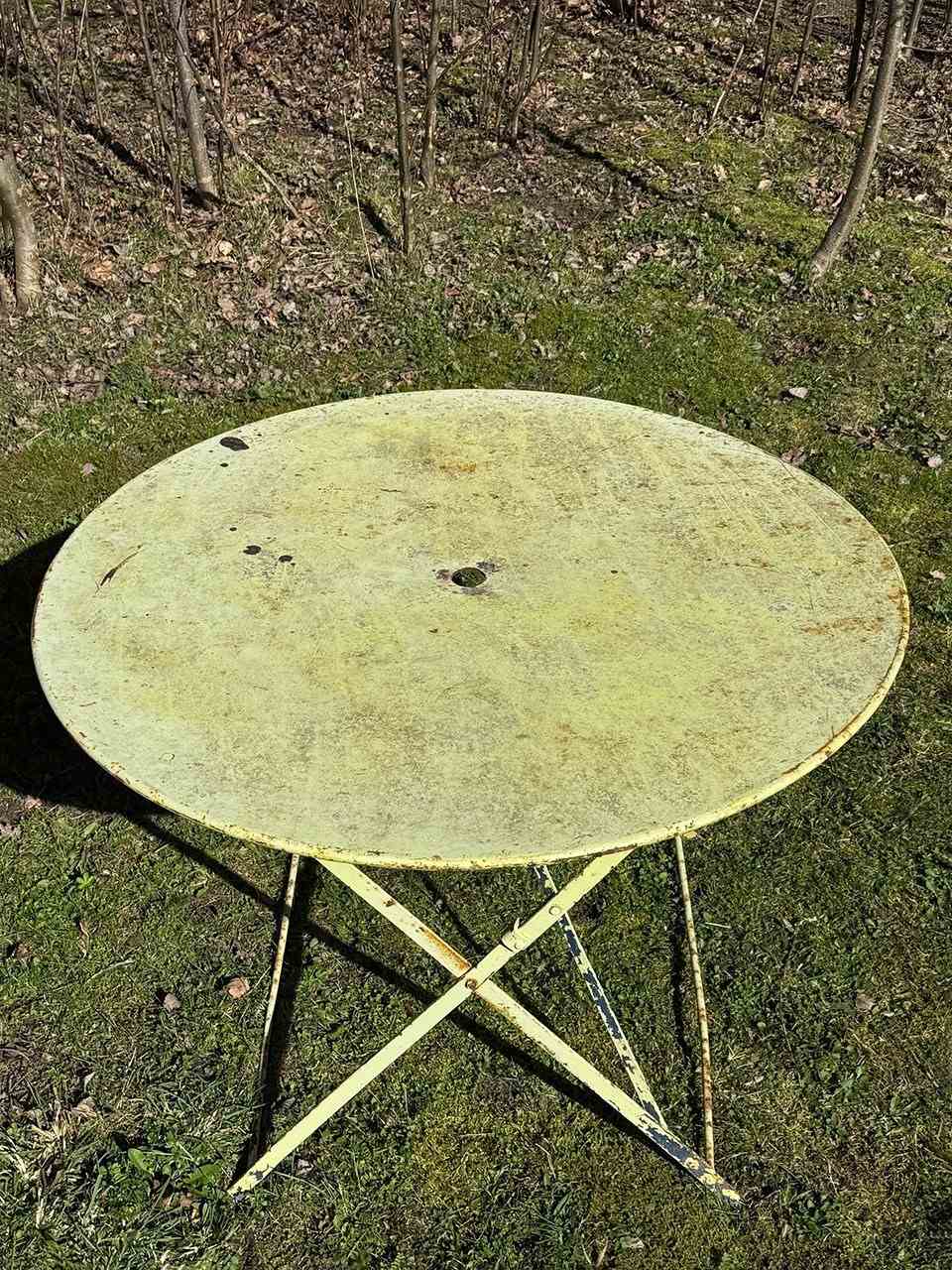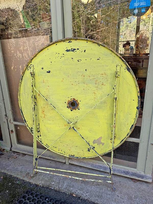 Painted in a sunny lemon shade there are remnants of previous paint colours here and there, and there is a hole in the top for a parasol.