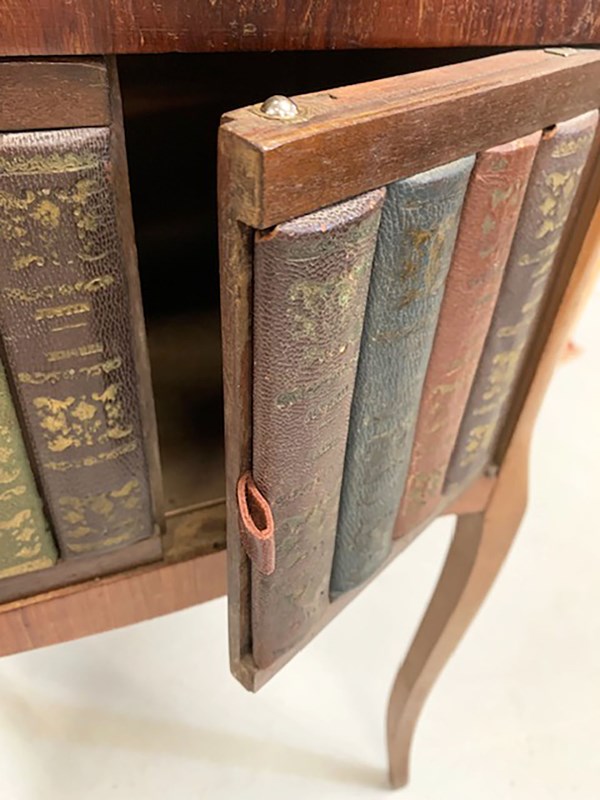 This is a 'trompe l'oeil'; the leather bound spines are adhered to the doors, which open and close with a little leather pull tab.