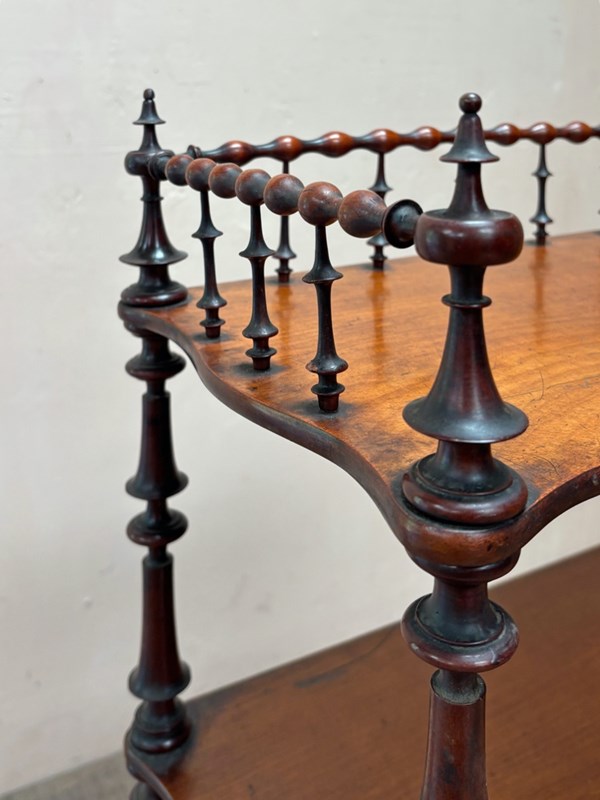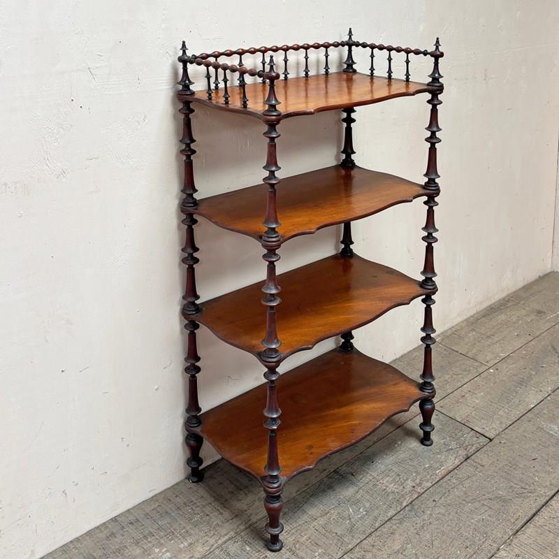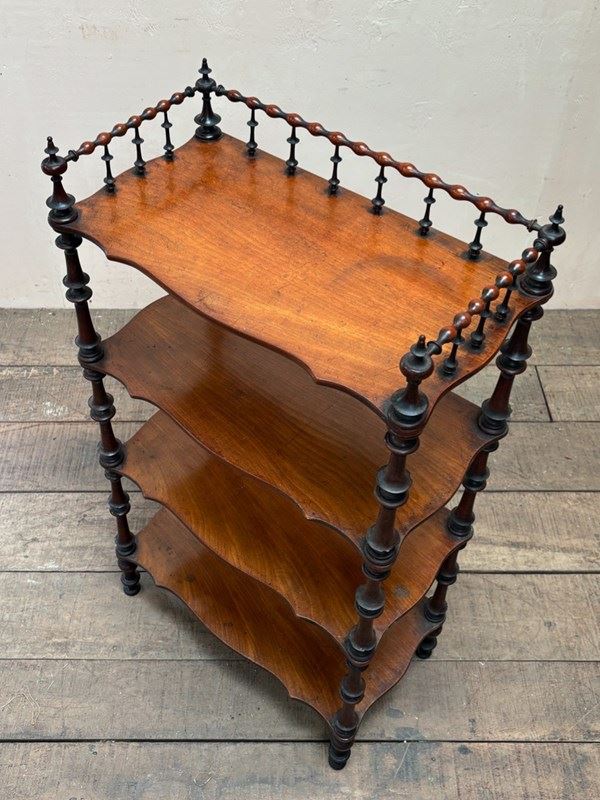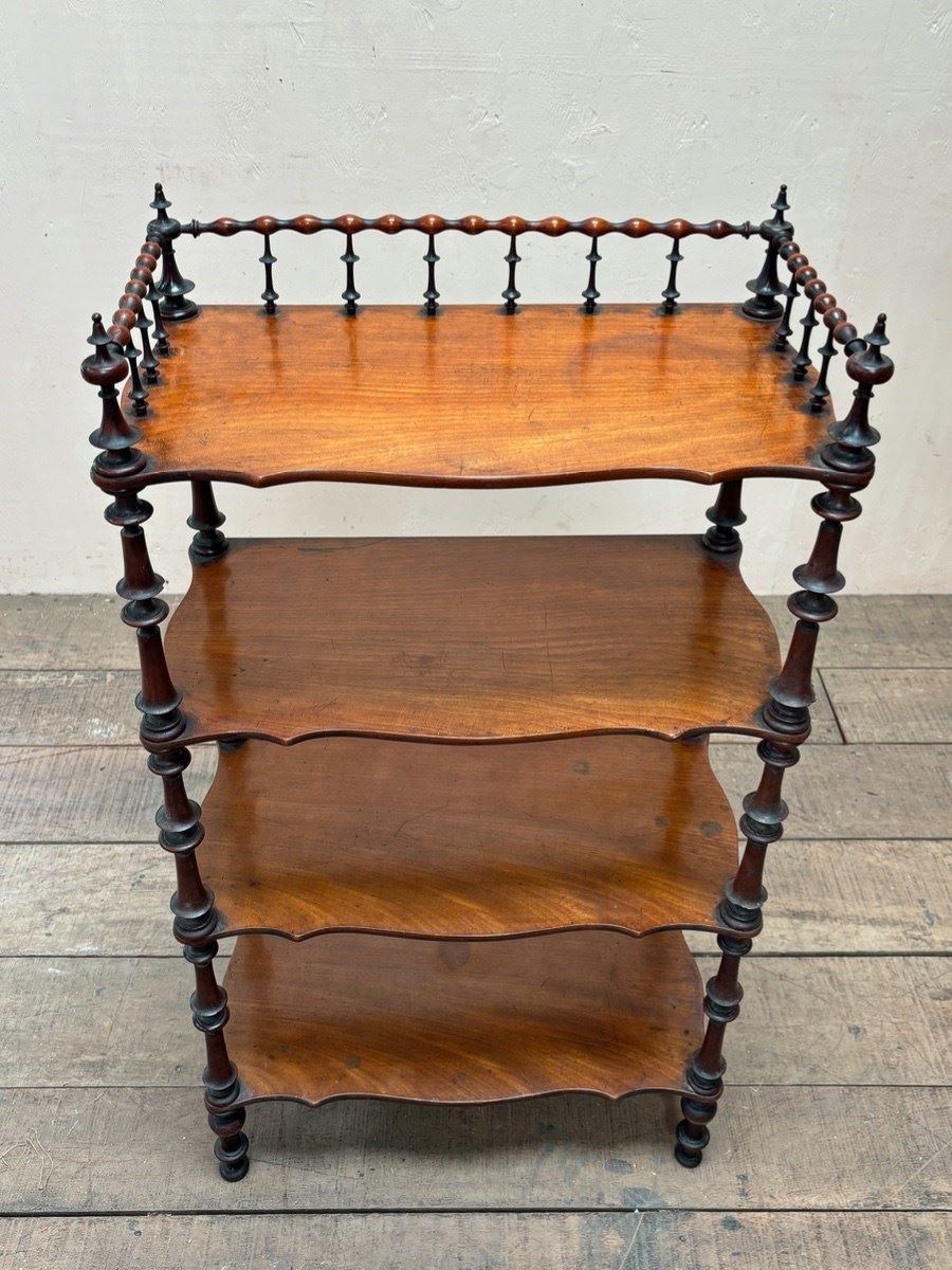 Lovely quality and condition 4 tier Victorian mahogany shelved stand, with super fine spindled top gallery.