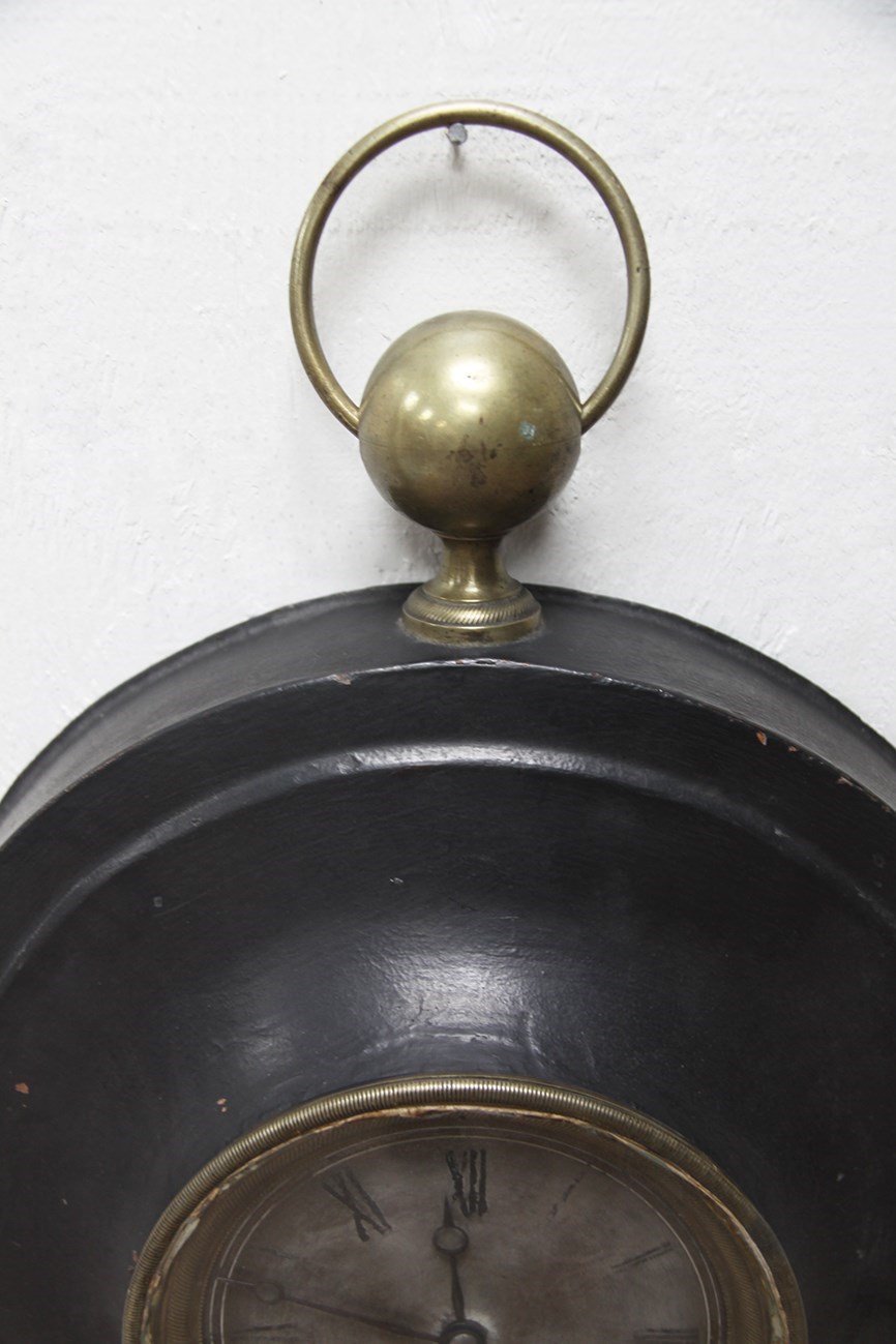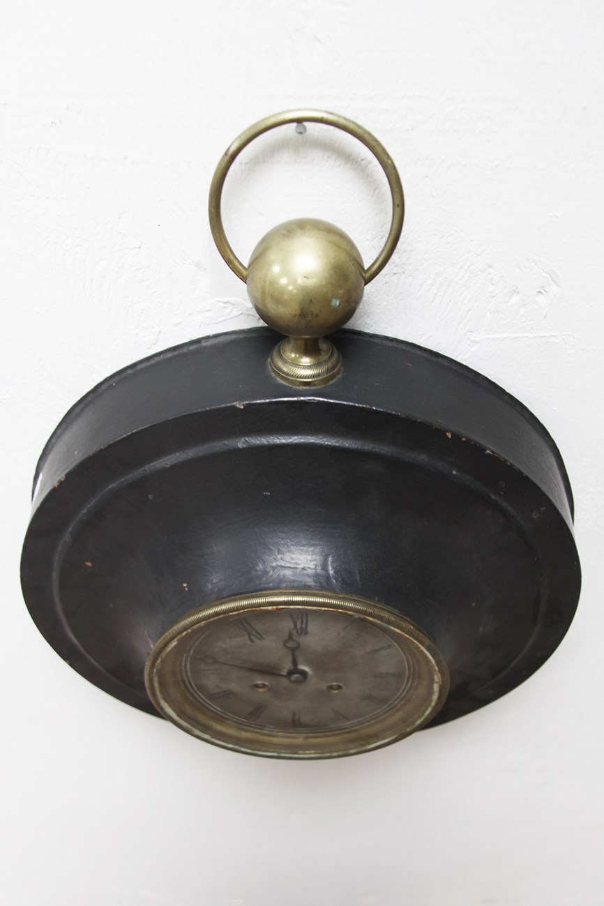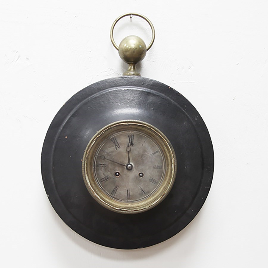 Painted black metal with brass detailing on both the perimeter of the clock face and ring wall hook.