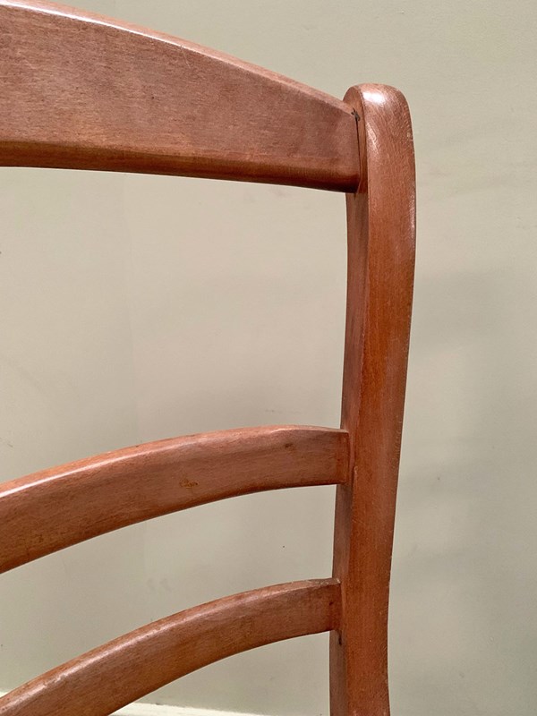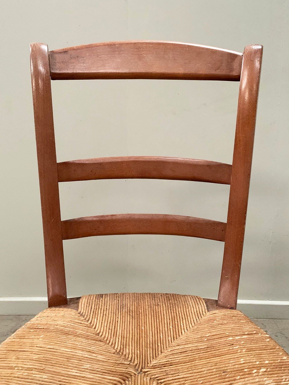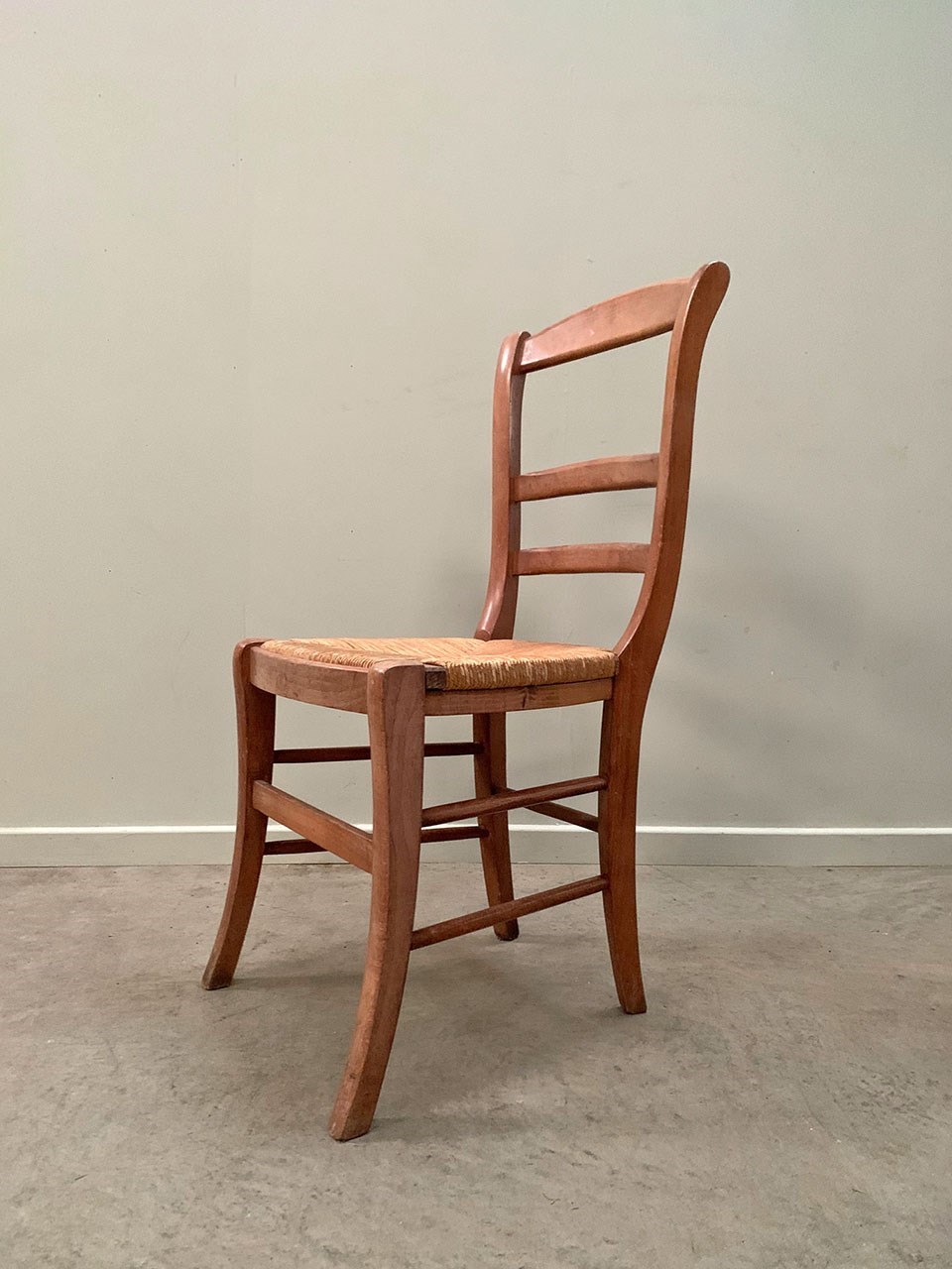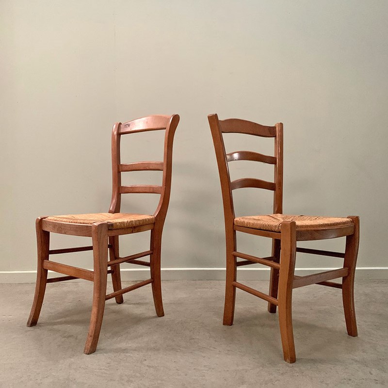 A very similar set of fruitwood farmhouse dining chairs, with slightly curved front legs and wavy backrest.