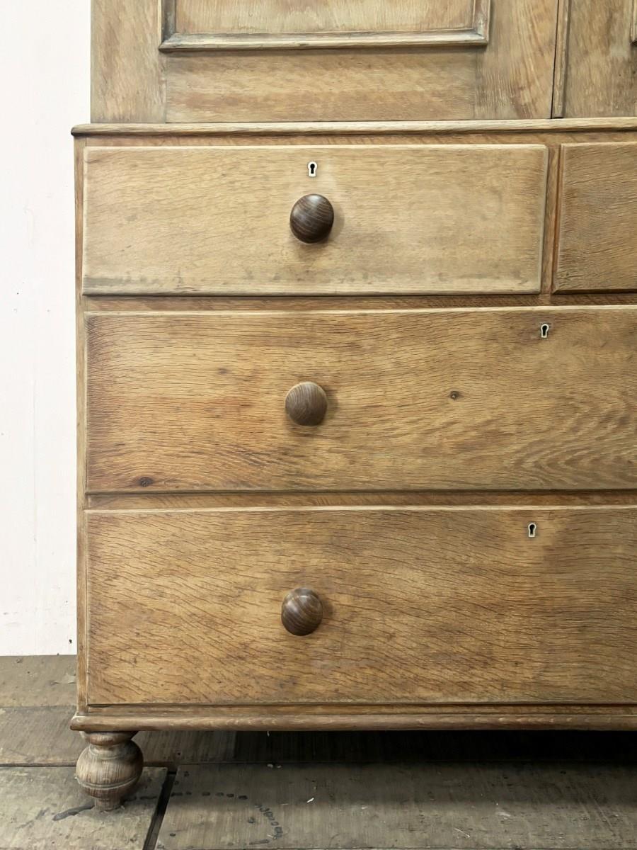 Pale, solid oak late Victorian Welsh housekeeps cupboard with 4 drawers below and 3 linen press sliding shelves behind doors.