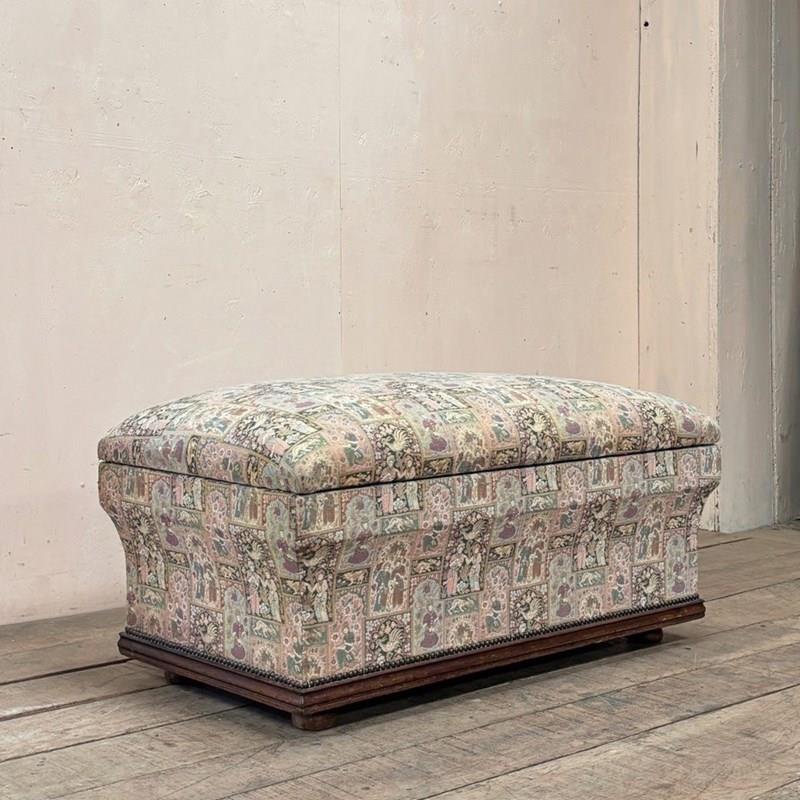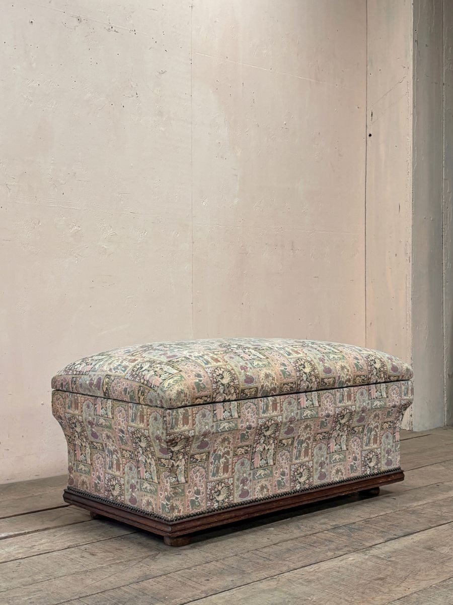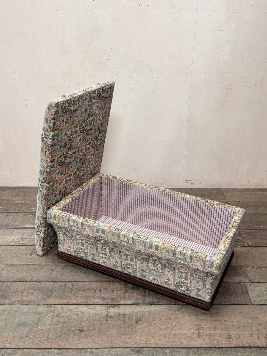 Standing on turned feet and upholstered in woven fabric with contrasting cotton lined interior, all in very clean condition.