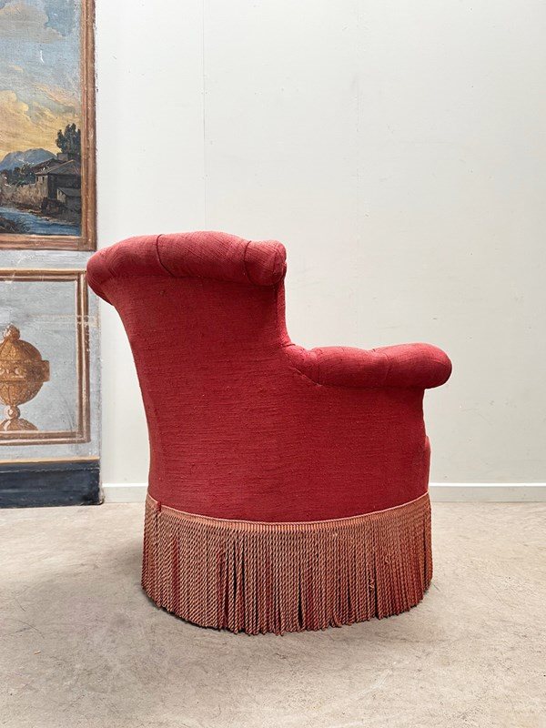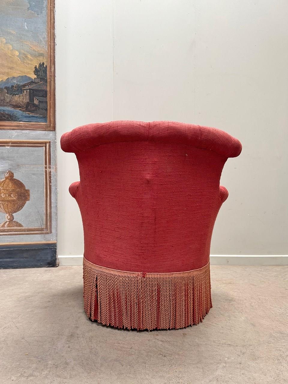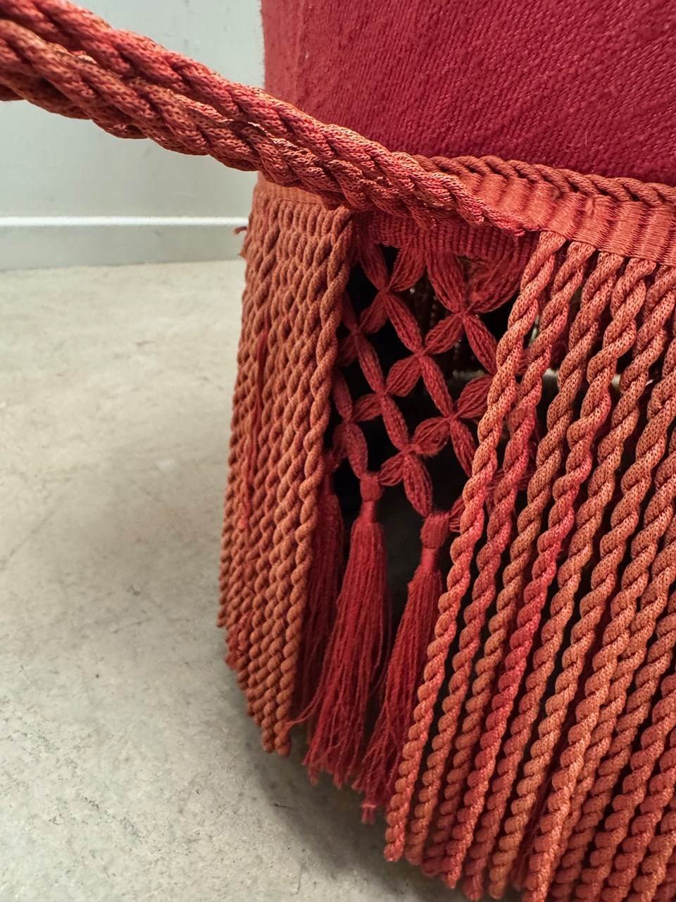Pair of fabulous chapeau de gendarme armchairs covered in a red woven cloth with braiding. Behind this braiding are beautiful woven red tassels.