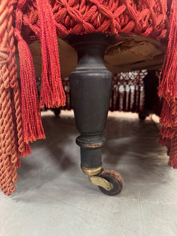 They have ebonised legs and sit on castors. Priced as a pair and 'as is', we can re-upholster the pair in your fabric choice for £1,500 + VAT (ex. fabric).